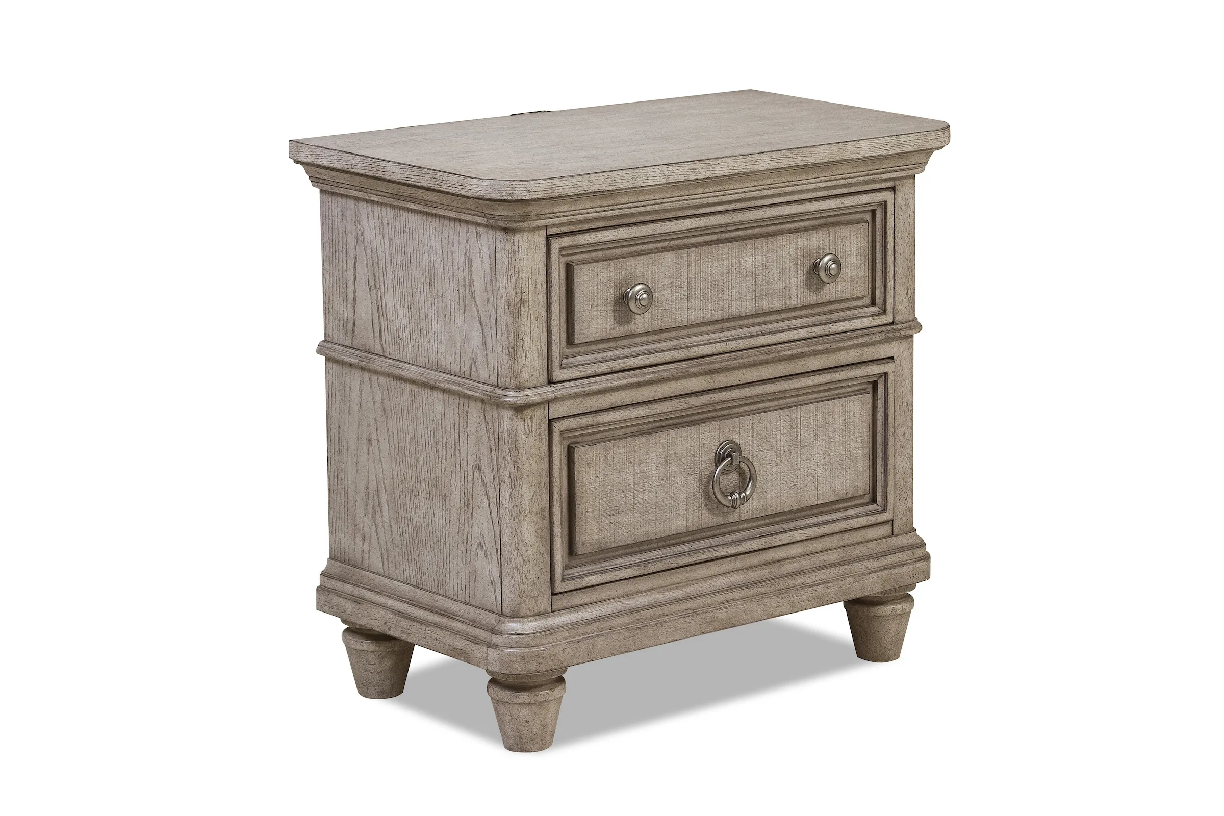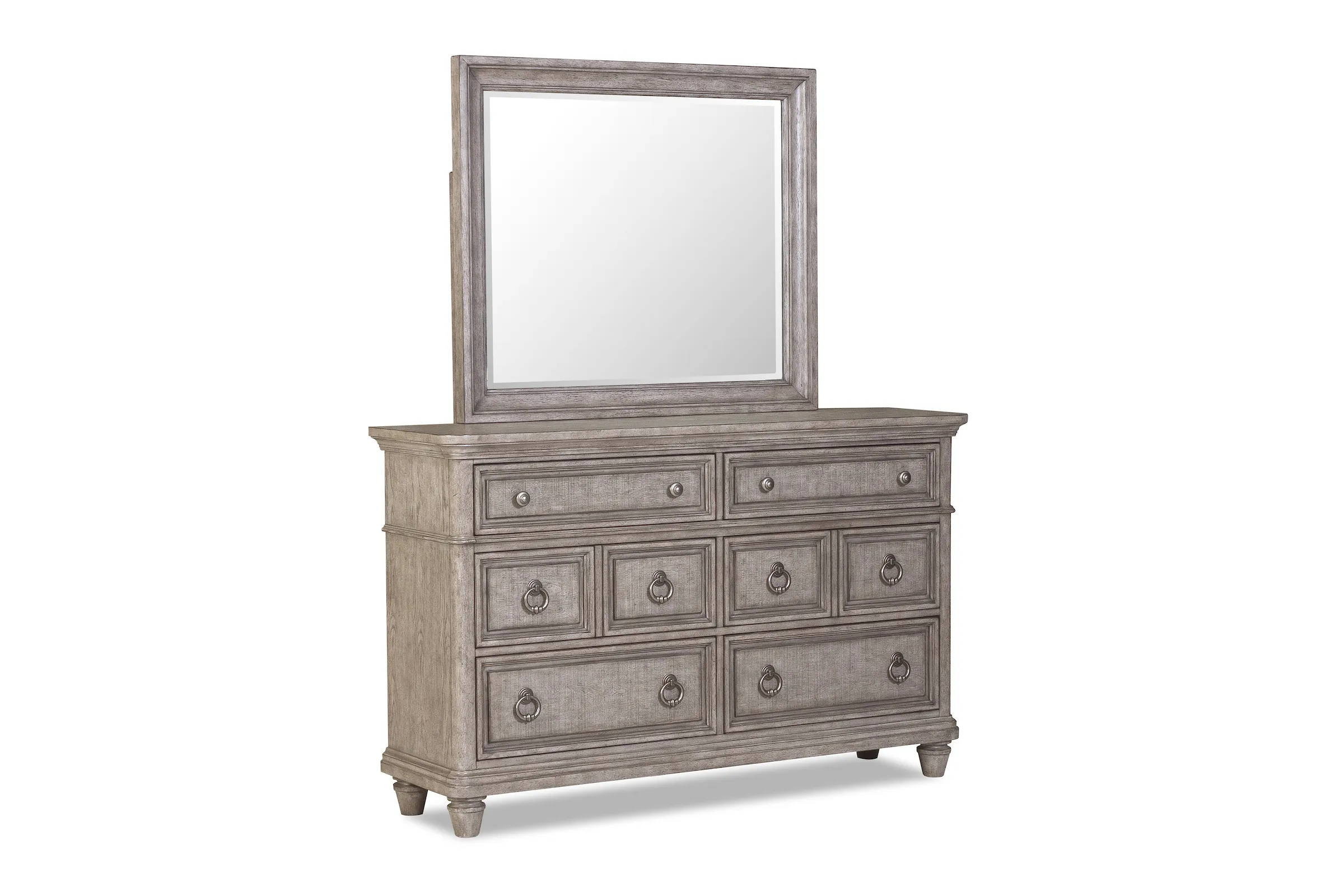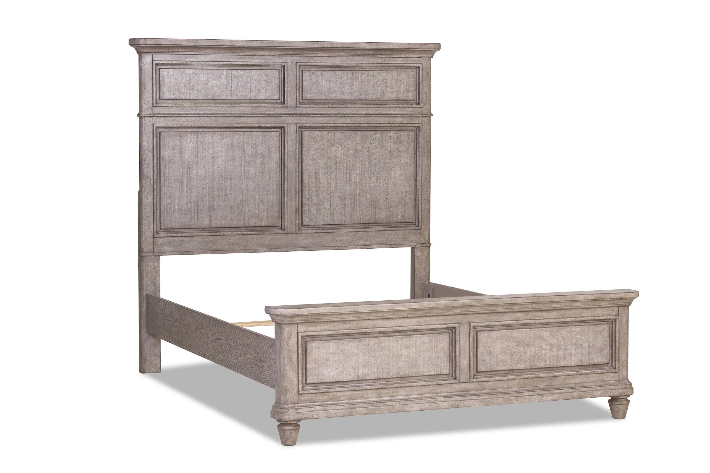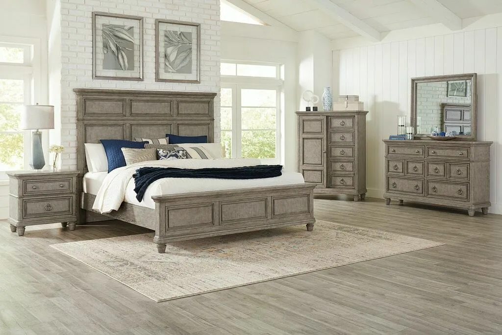 Stately and sophisticated, the Blakeley collection is ready to transform your bedroom. These paneled pieces feature classic shapes elevated with beveled edges and antiqued hardware, while a weathered grey finish gives a dreamy feel. They rest on tall, turned legs.