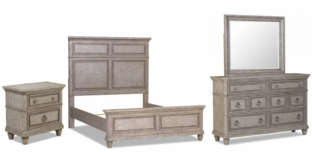 Blakeley 4 PC Queen Bedroom Set includes bed, nightstand, dresser, & mirror.