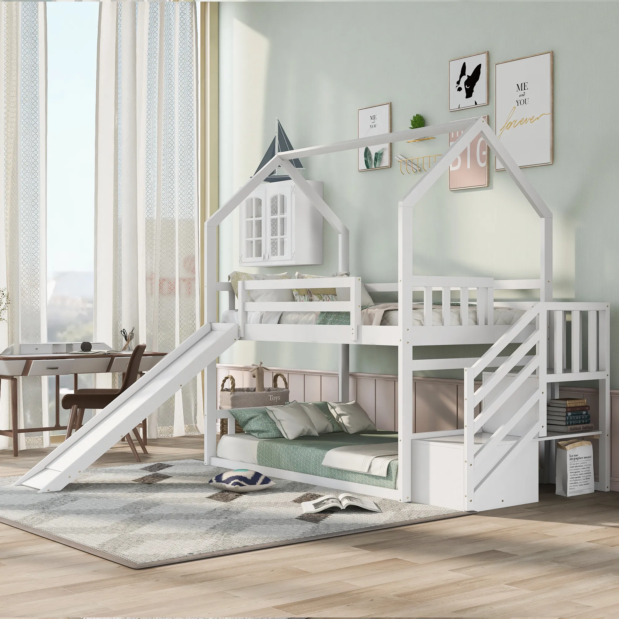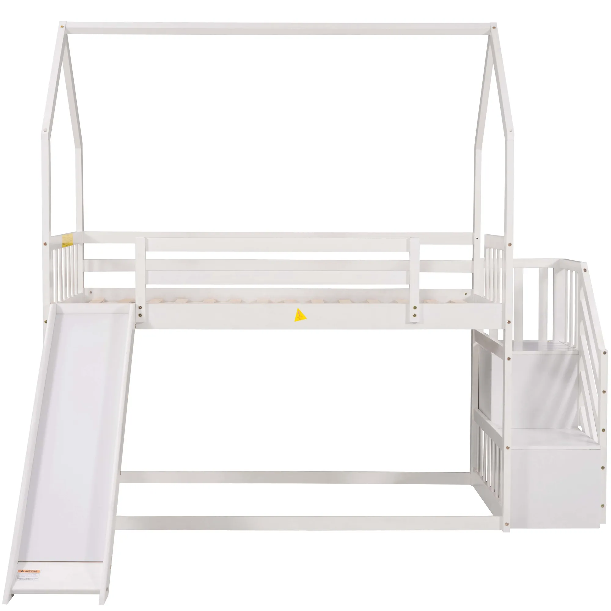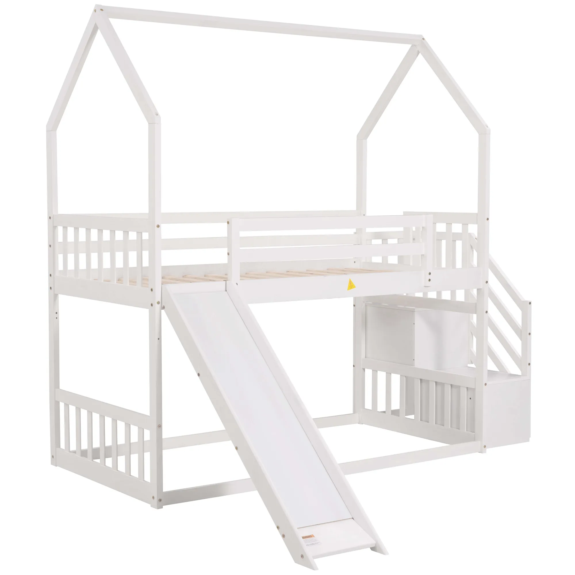Product Features The twin/twin bunk is perfect for families. Full-length guardrails on the upper bunk prevent accidental falls. Equipped with people's favorite slides,which can be put on left or right, it is convenient to get out of bed and adds entertainment functions.And the Staircase can be put on left or right either. Built-in Staircase instead of a ladder for easy access to the top bunk with 2 underneath storage space can effectively space space and is suitable for space-saving lover. The twin size bunk bed is constructed with a sturdy pinewood frame that features a natural wood grain look for enhanced stability and durability. All parts, tools and instructions are shipped straight to your door in efficiently packed boxes for simple set-up that takes less than an hour with a friend's help. Twin over Twin House Bunk Bed with Convertible Slide,Storage Staircase,WhiteThe simple and modern design is suitable for most family. This house-shaped twin room is equipped with two bunk beds to save your floor space. This bunk bed is made of pinewood and MDF board, which has good stability and safety and can withstand high-weight play without dangerous swings. Equipped with people's favorite slides,which can be put on left or right, it is convenient to get out of bed and adds entertainment functions.And the Staircase can be put on left or right either.The full-length guardrail on the bed ensures the safety. Combining rest and entertainment functions, this bunk bed with a slide will become a popular item in your bedroom.