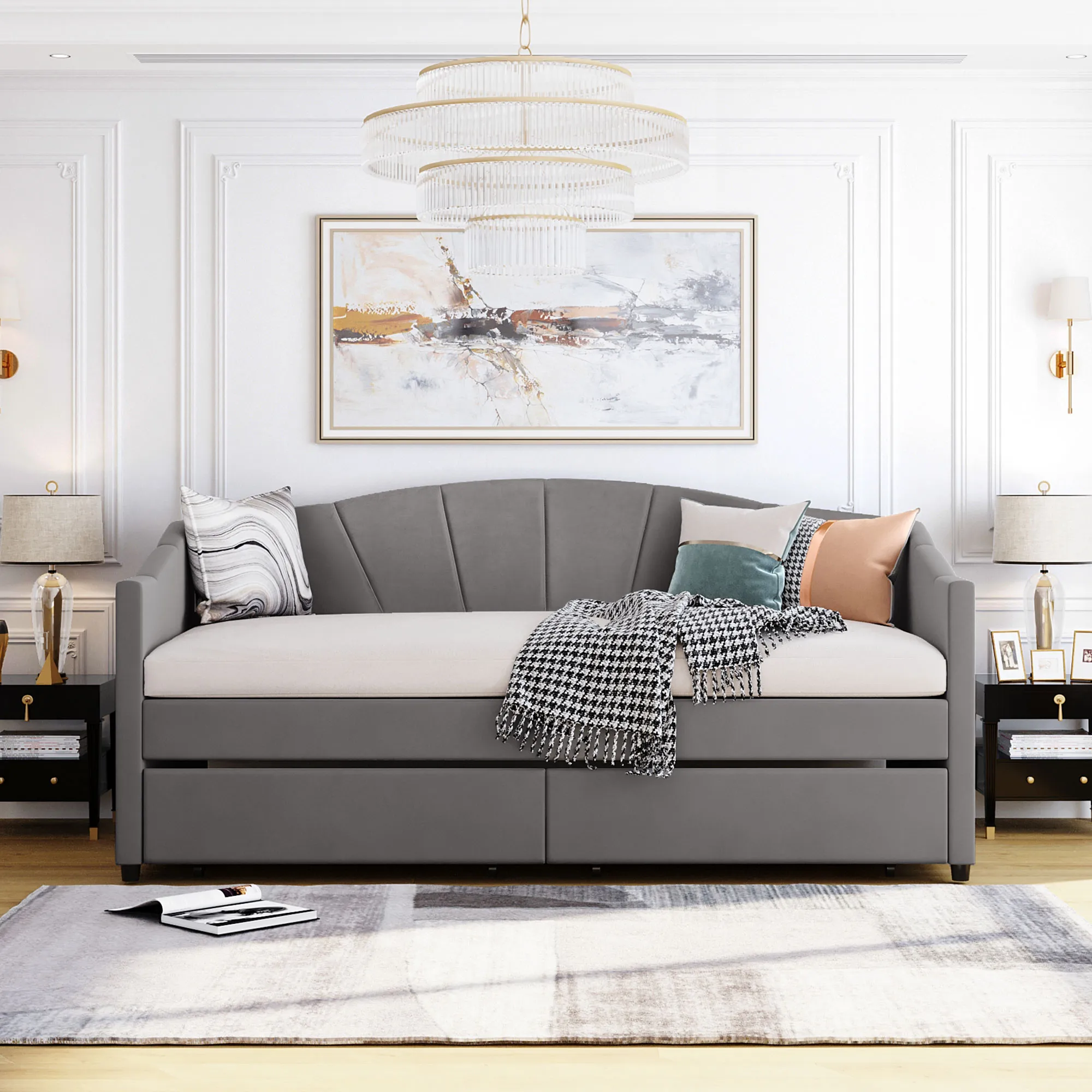 Elegant design Elegant style :Upholstered in carefully-selected velvet fabric, this daybed not only suits any home décor, but is timeless in its design. The soft textile bedhead creates coziness, while the single color of the design creates versatility.