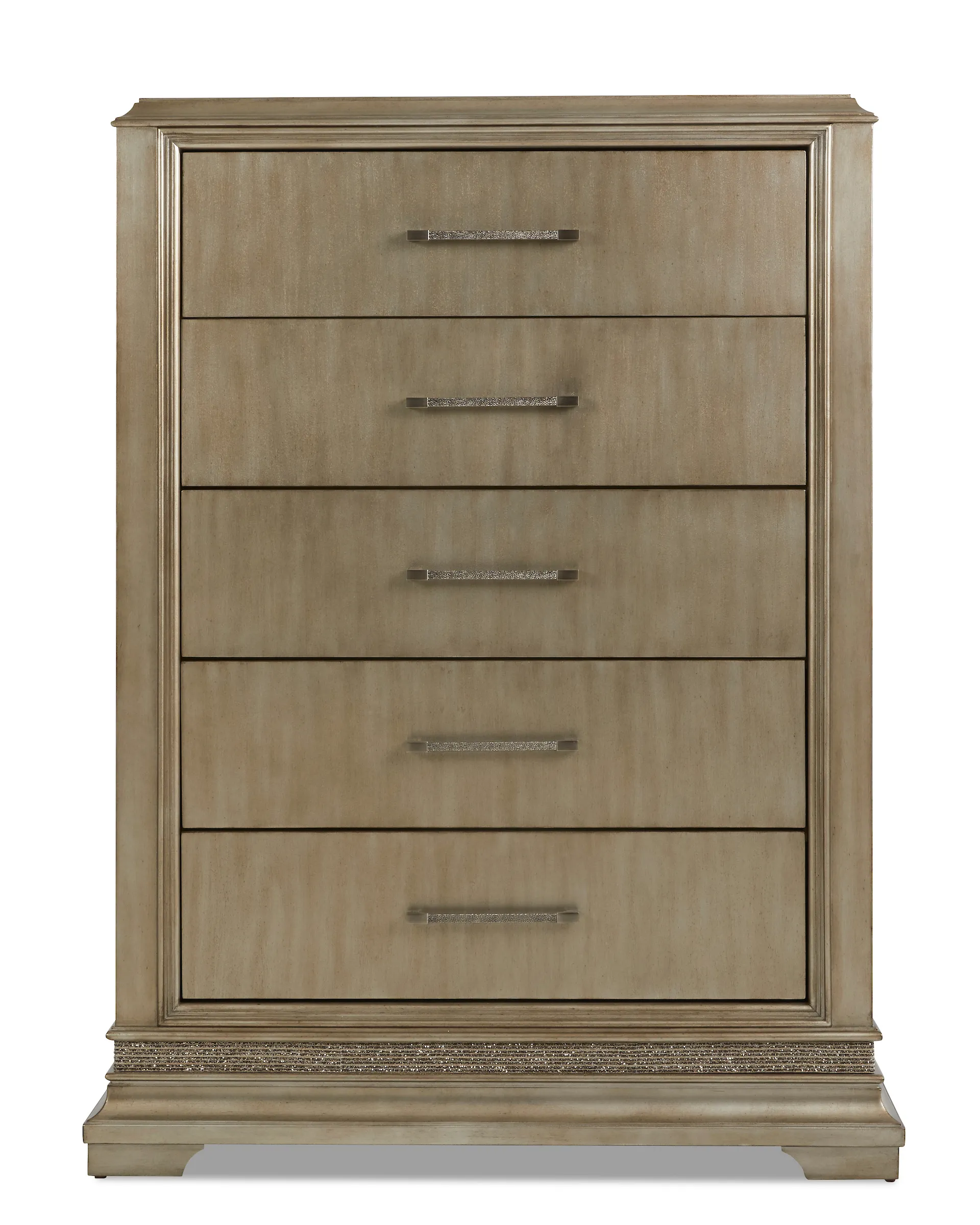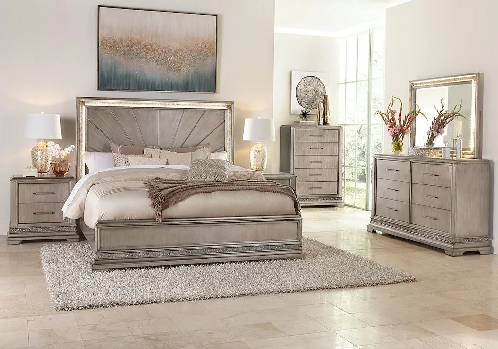 Drawer chest 941-681 CHEST: 40W x18W x56H Elegant, yet truly unique, the Sophia bedroom is the perfect way to brighten up your space. Attractive sunbursts adorn the headboards in the collection, while each piece features inlaid, shimmering trim for an added touch of sparkle. Flip on the built-in lights, and the effect is truly dazzling. A sleek platinum finish completes the ensemble. Each piece rests on sturdy bracket feet and features complementary metal hardware for a truly cohesive appearance. Collection includes Queen, King, or California King Size Bed, Vanity, Vanity Stool, Vanity Mirror, Dresser, Mirror, Night Stand, and Drawer Chest. Collect all the pieces for a uniform look.