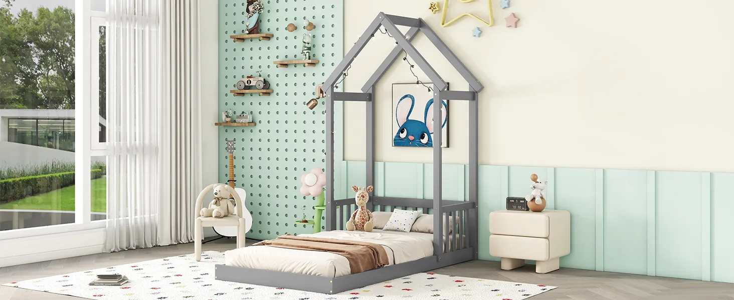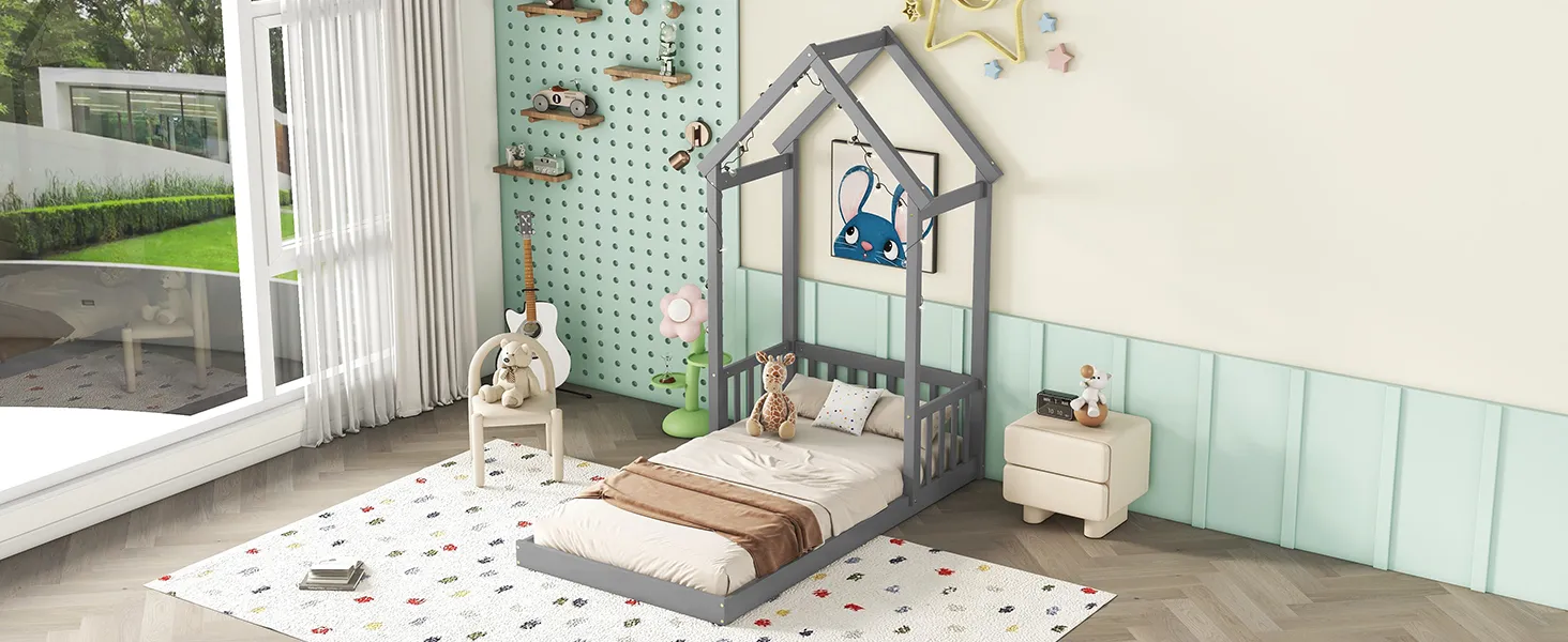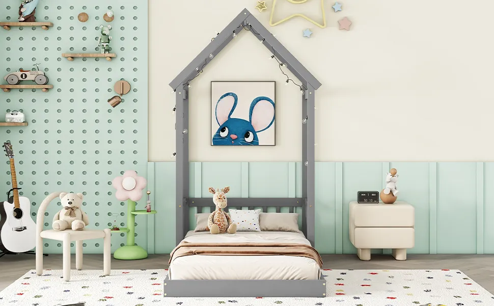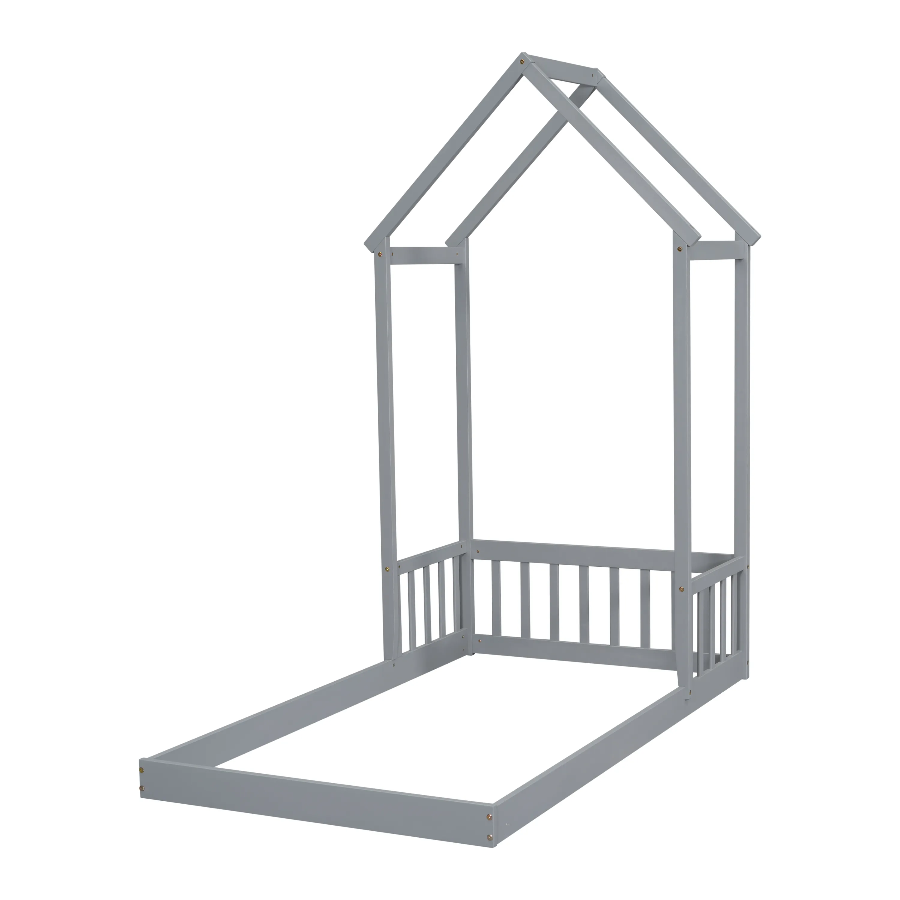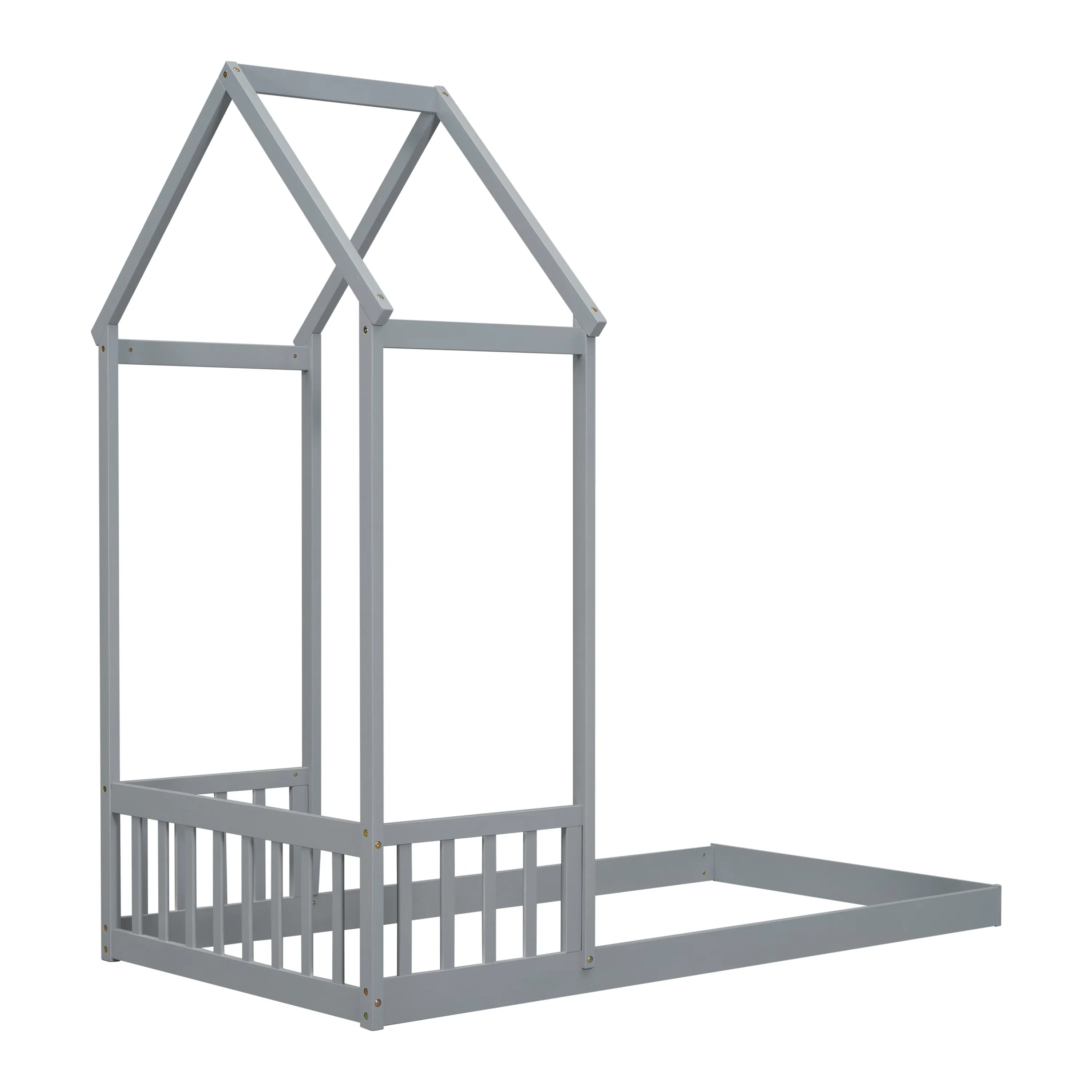 Twin House-Shaped Roof Headboard Floor Bed, (Without Slats) - Gray