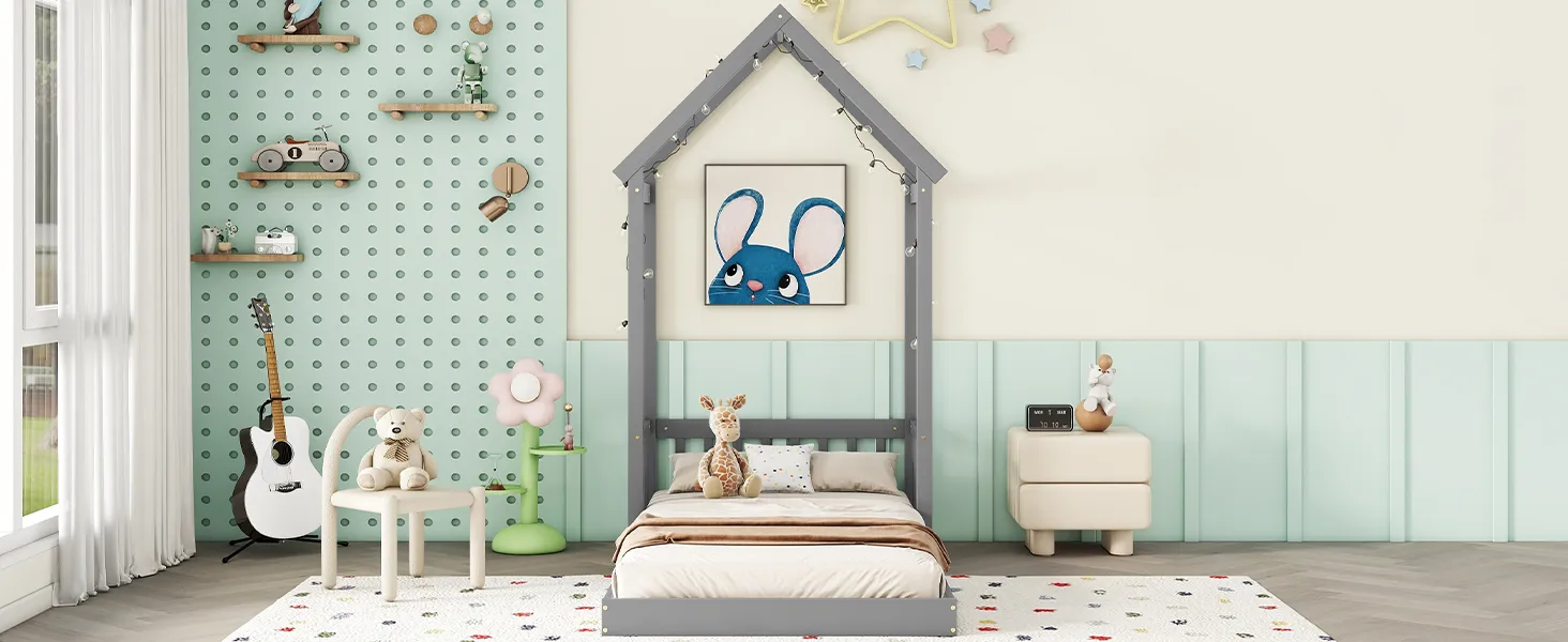 House-Style Design: Features a house-roof frame and fence structure for a whimsical garden-like feel. Safety and Stability: Crafted from quality pine wood, firmly secured parts ensure lasting sturdiness and durability. Multi-Functional: Platform can accommodate a twin mattress, combining sleeping functionality with playful aesthetics. Customizable Options: Choose from a variety of classic colors to match your bedroom decor. Easy Assembly: Delivered in one package with a manual and hardware for straightforward setup.