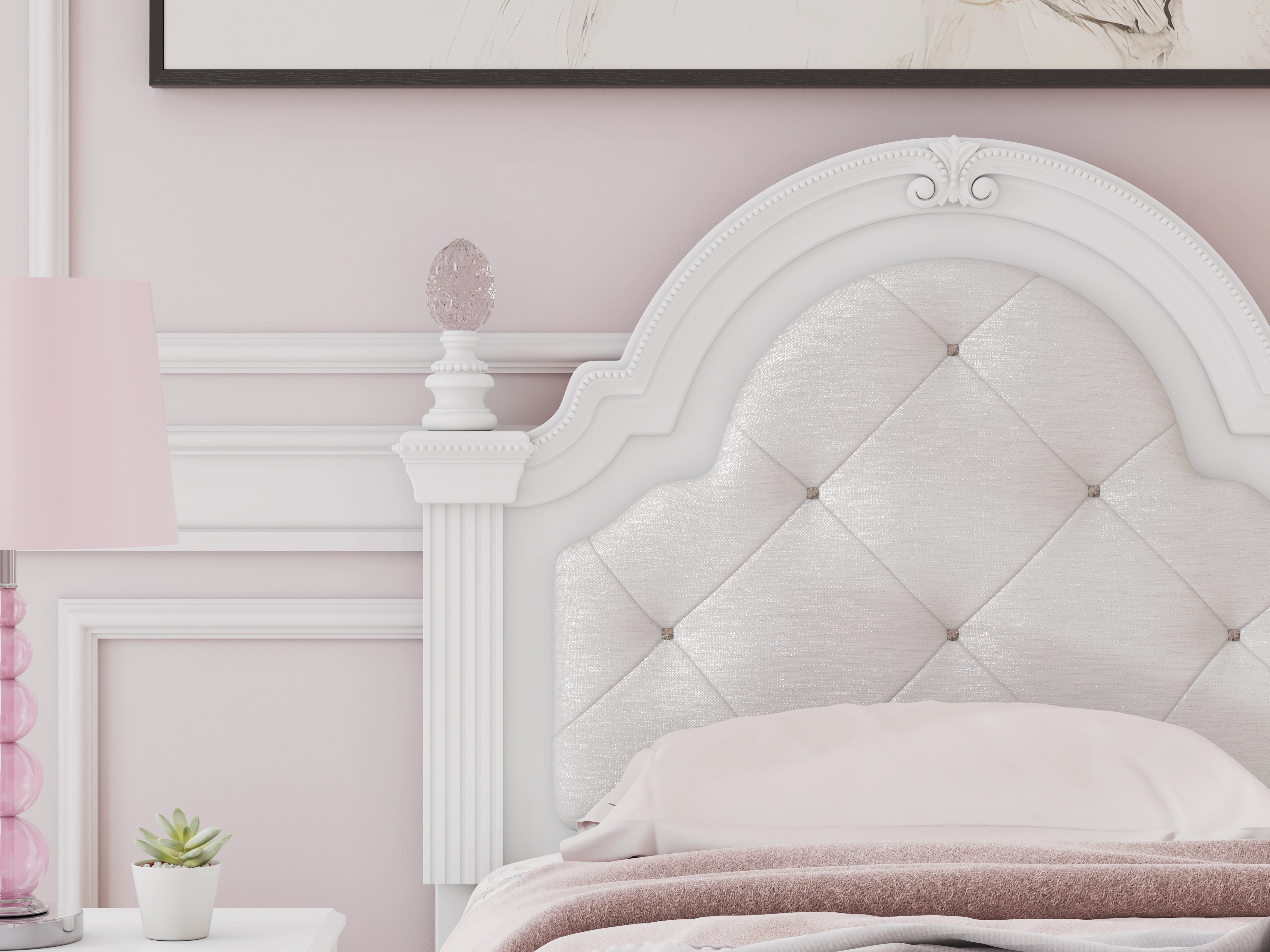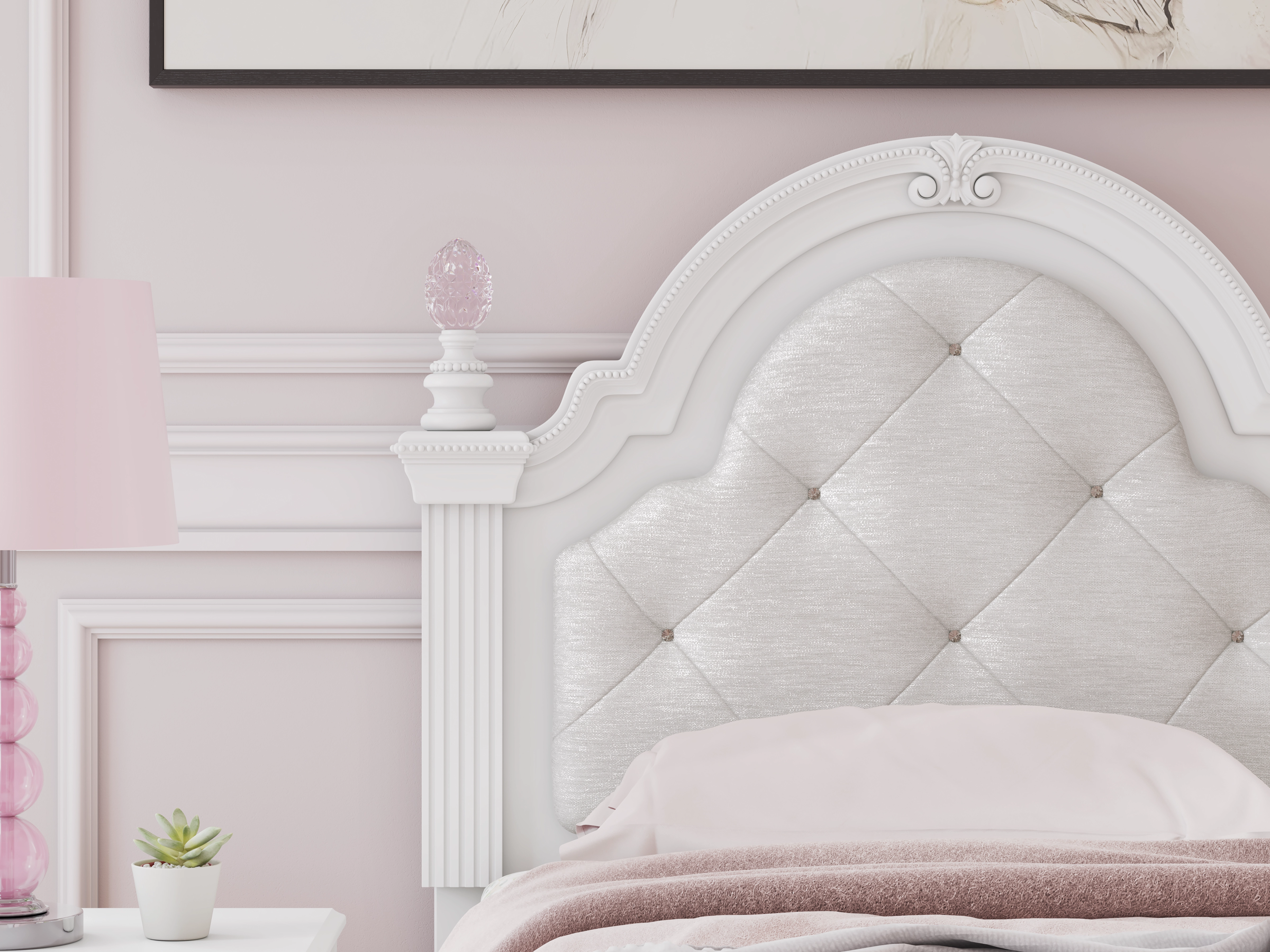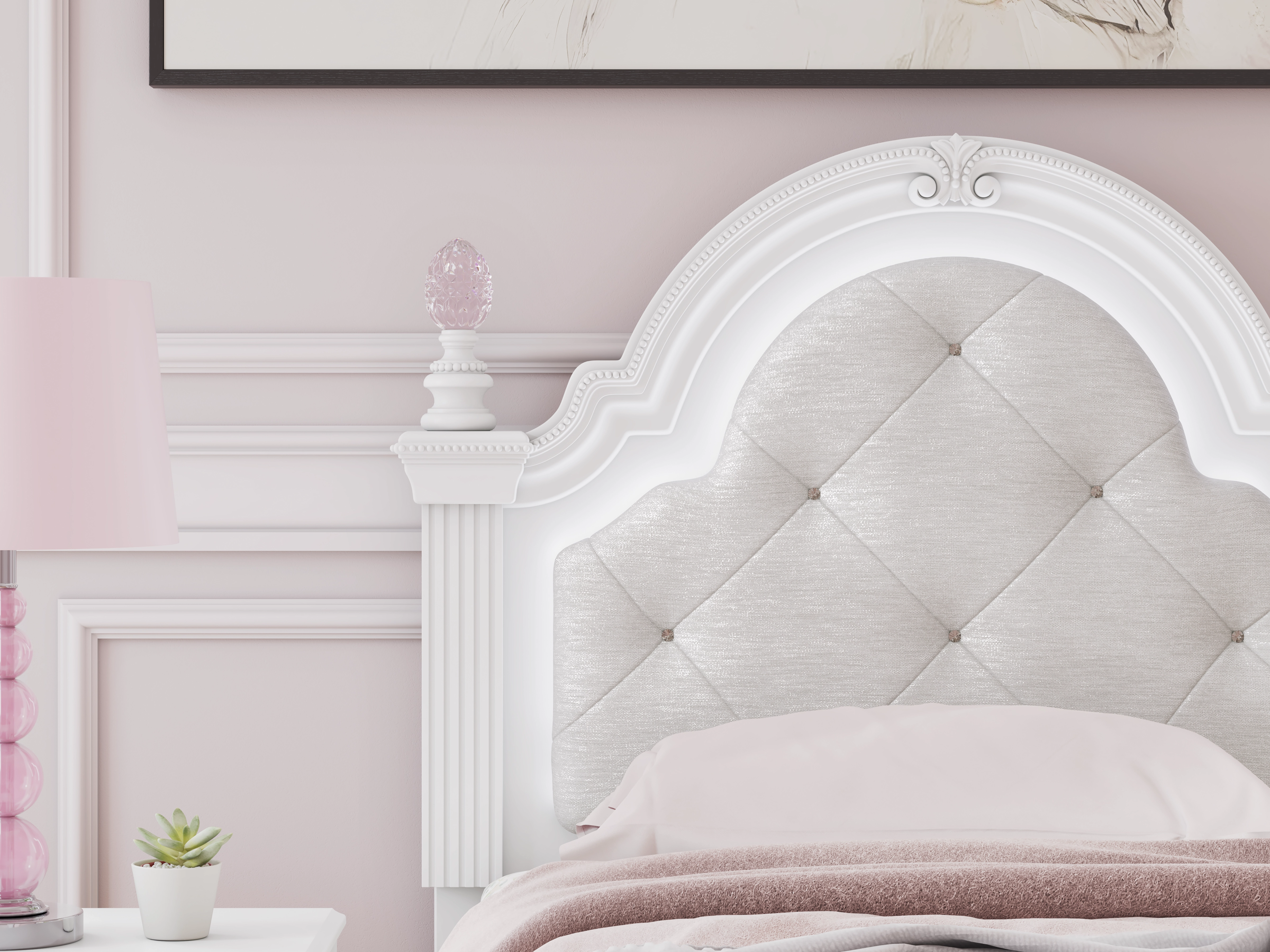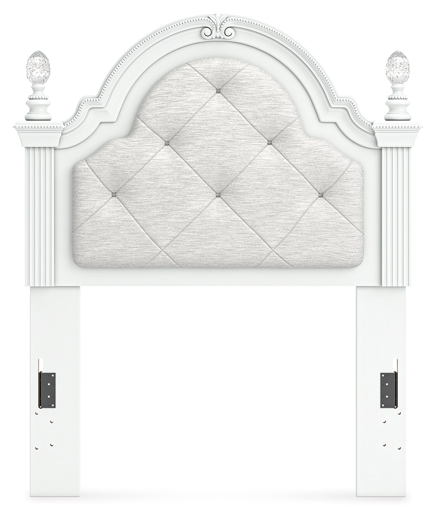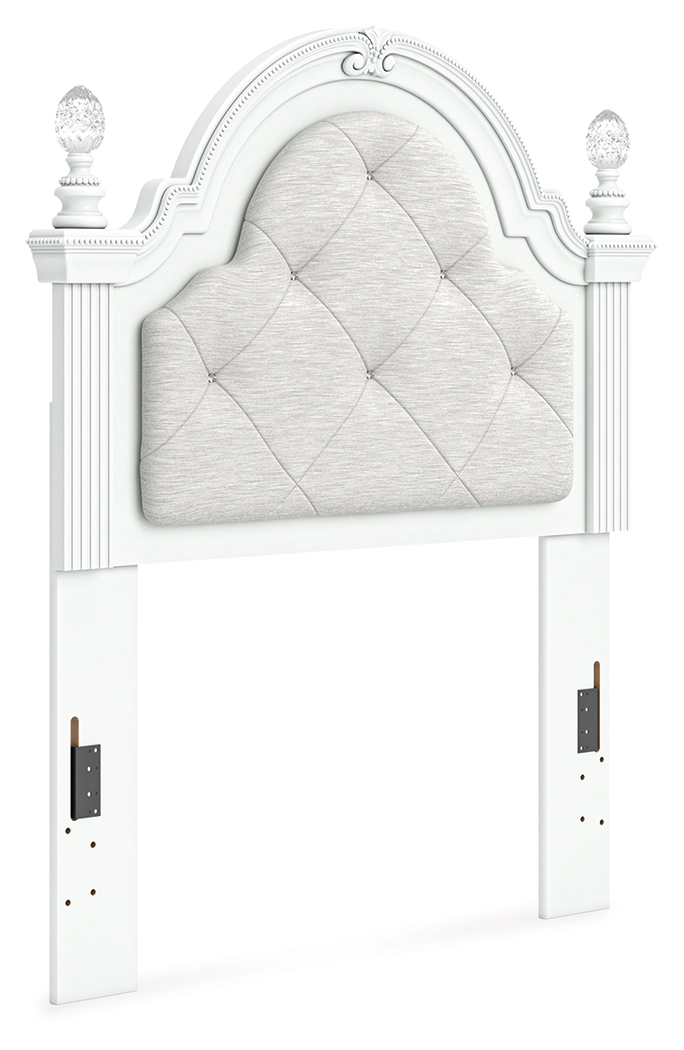 Fit for a princess. This twin upholstered panel headboard’s crisp matte white finish pairs with charming ornate beading and sumptuous button-tufted upholstery—perfect for your girly girl. Decorative ball tops and multicolored LED lighting are the crowning touches to make your little one feel like royalty.