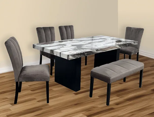 Bold and contemporary, this dining group makes a statement with its dramatic marble-look top and sculptural black pedestal base. The striking tabletop showcases dynamic veining that mimics natural stone, bringing an upscale, artistic flair to any dining space. Paired with sleek, channel-tufted chairs and a coordinating bench in a plush upholstery, the ensemble offers both visual appeal and exceptional comfort. This set is ideal for those who appreciate modern design with a luxurious edge, perfect for elevating everyday meals and stylish entertaining alike.