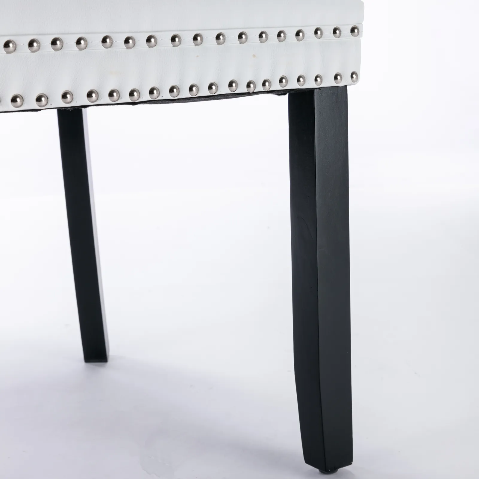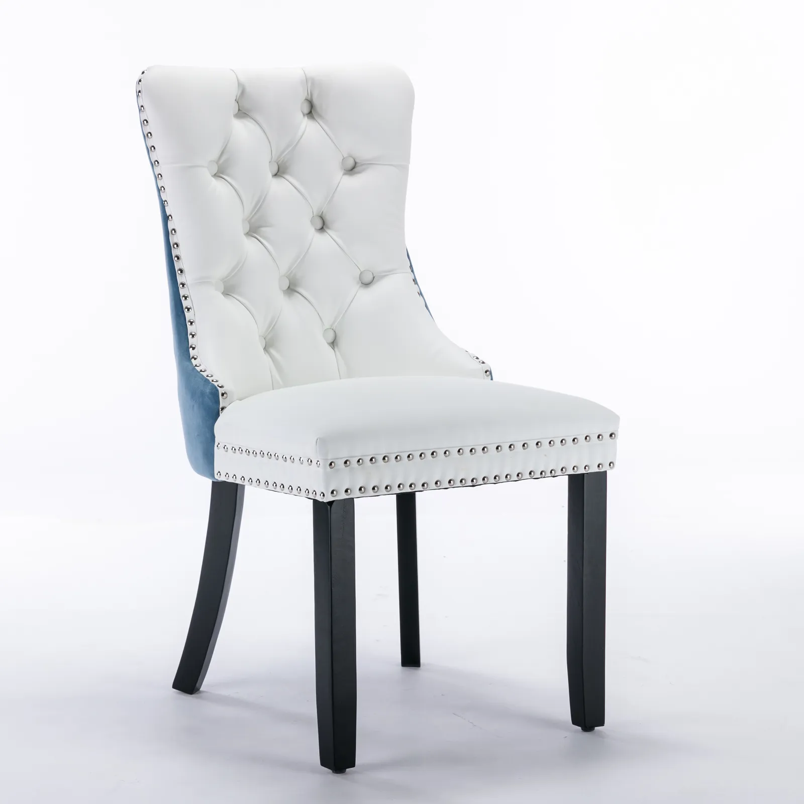Modern and High-end Design: The Nikki Collection dining chair features a contemporary look with tufted PU and velvet upholstery, complemented by elegant wood legs and nailhead trim. Sturdy and Durable Construction: Made of solid wood, this chair is built to last and provide reliable seating for your dining space. Elegant Color Scheme: The combination of colors adds a chic and sophisticated touch to any dining room decor.