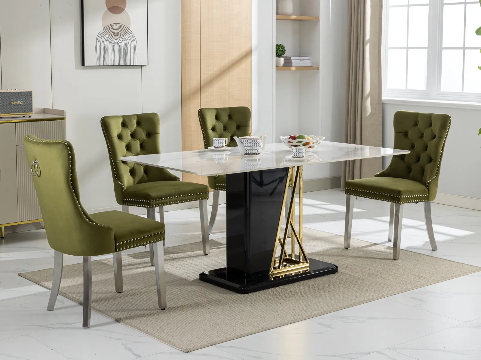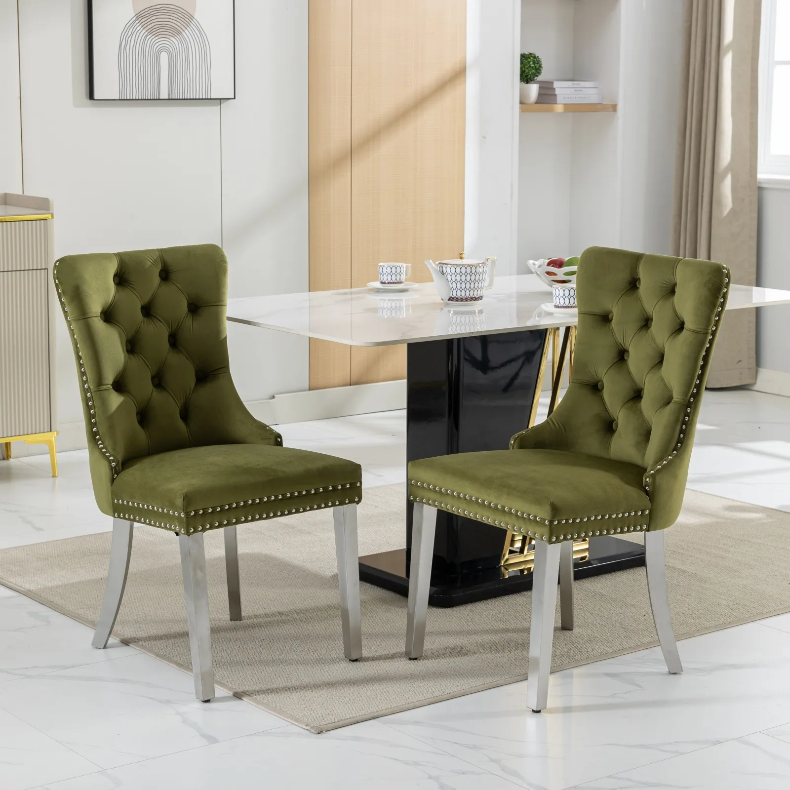 Modern and High-end Design: The Nikki Collection dining chair features a contemporary and luxurious tufted velvet upholstery. Sturdy Construction: Made with solid wood and supported by chrome stainless steel plating legs for durability and stability. Elegant Details: Nailhead trim adds a touch of sophistication to the overall look of the chair. Set of Two: Comes in a set of 2 chairs, perfect for a stylish dining room or as accent seating in other areas of the home.