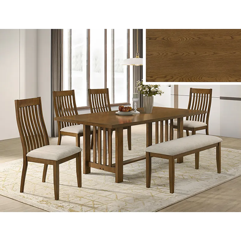 Elevate your dining experience with this timeless and sophisticated mission-style table ensemble, designed to bring warmth and elegance to any home. Crafted from high-quality wood with a refined finish and distinctive mission-style detailing, the table provides a perfect setting for family gatherings, dinner parties, and special occasions. Complemented by a mix of upholstered chairs and a matching bench, this versatile set offers stylish comfort and ample seating for your guests. Its clean lines, crafted with expert attention to mission design elements, create a welcoming atmosphere, making your dining area a perfect blend of functionality and aesthetic appeal that will enhance your home for years to come.
