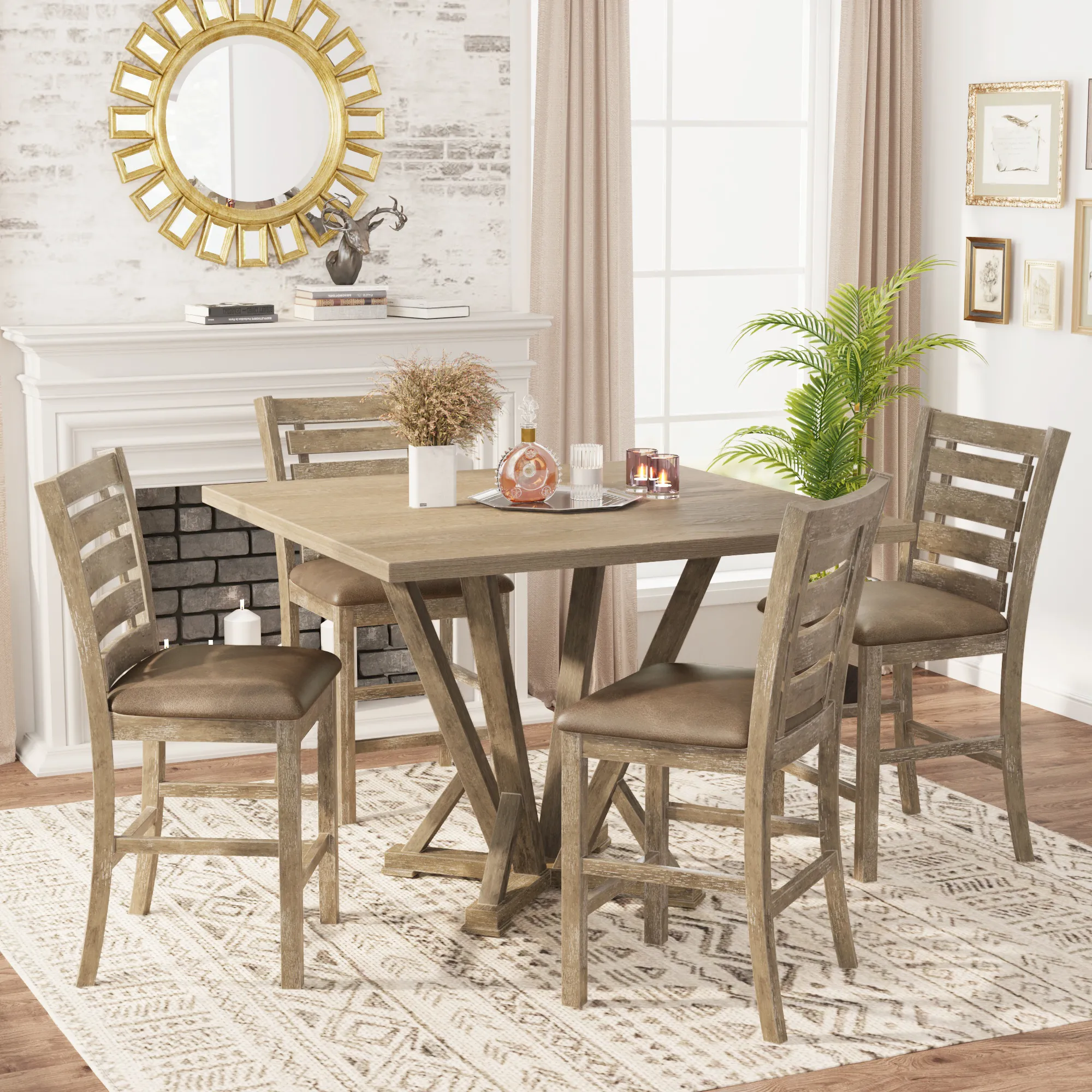 5 Pieces Dining Set, Square Counter Table Modern Farmhouse Rustic - Distressed Brown