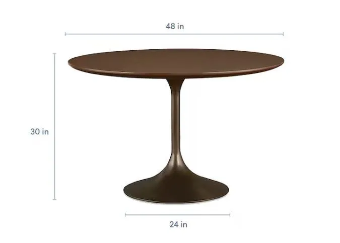 Find your dining delight at the espresso-hued walnut tabletop perched on the tulip base of our newly iconic Copenhagen Round Dining Table. Featuring a Danish Modern softened-edge detail, the table is available in a 48” or 60“ diameter to fit perfectly into your dining space. Enjoy the spacious legroom the bronze-finished pedestal base offers, adding chairs (like the Copenhagen Dining Chair) to personalize your room and seating capacity.