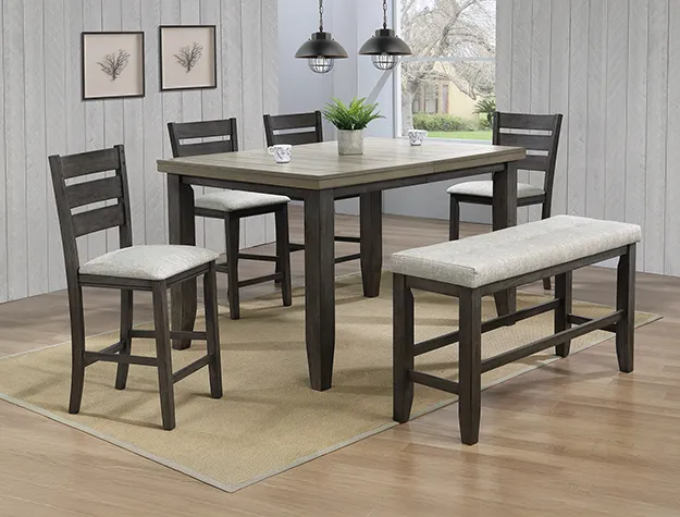 Elevate your dining experience with this stylish and versatile counter-height dining group, perfect for both casual meals and entertaining guests. The sleek, two-tone design features a warm, neutral tabletop beautifully contrasted by a bold, rustic base, adding a modern farmhouse charm to any space. The matching ladder-back chairs and upholstered bench provide plush seating for comfort, while their sturdy construction ensures long-lasting durability. Designed with a spacious tabletop and elevated height, this set fosters a relaxed, inviting atmosphere for gatherings of all sizes. Whether you're hosting or enjoying everyday dining, this group blends functionality and timeless appeal effortlessly.