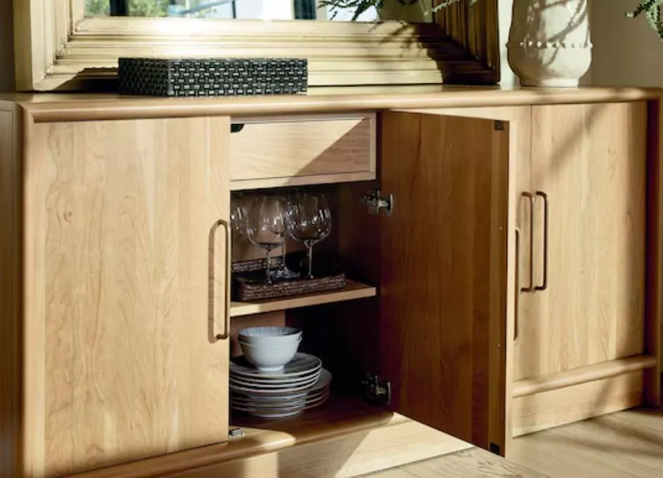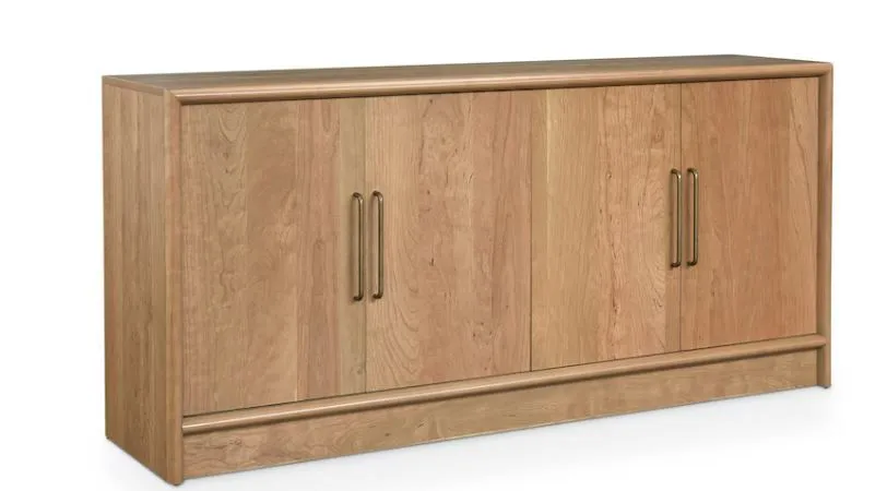 The handcrafted beauty of the BenchMade Seneca sideboard has it all – breathtaking cherry wood beauty creating plenty of storage and display space. Perfect for your living or dining area, this 4-door solution offers two shelves on each side and a drawer with soft-close, under-mount glides. Cleverly concealed hinges allow the fine grain of the solid cherry wood to take center stage and its modern lines are accented by elegant, vertical bar pulls. Three wire management holes allow flexibility for concealed cords. The natural color of cherry has a simple, Scandinavian-like elegance or you can customize the Seneca with a darker finish. Hardware choices are available in-store.
