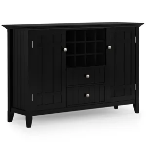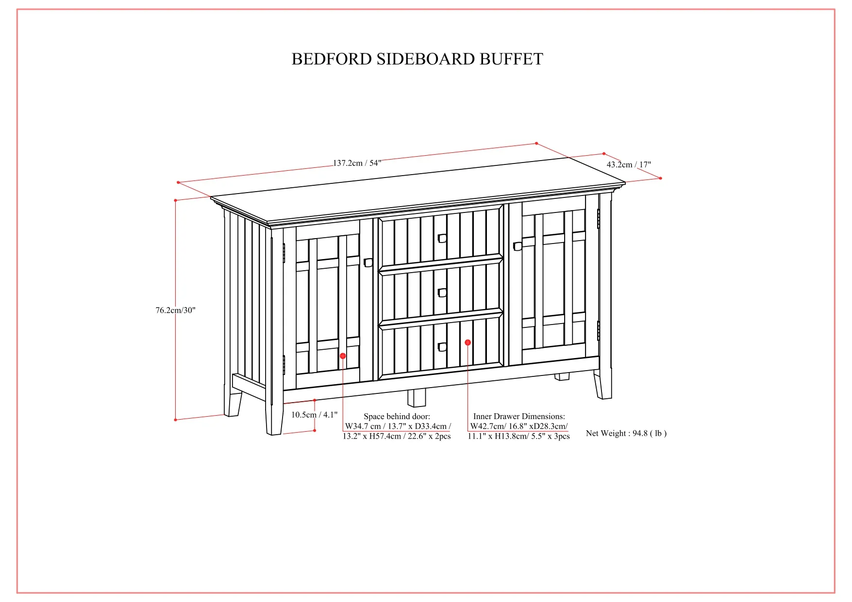 The Bedford Sideboard Buffet is made from solid wood, has plenty of storage and space for all your dining and entertaining needs. The buffet features three large drawers and two large side storage cabinets open to two adjustable shelves. The design includes mullion detail door panels and grooved drawer fronts and sides.