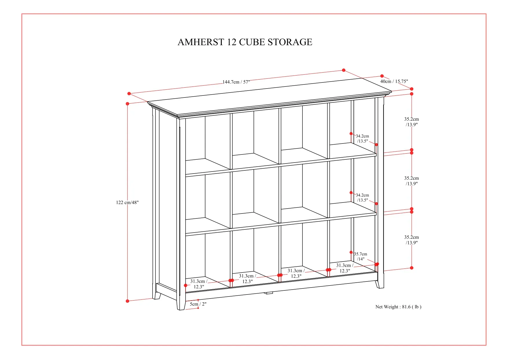 You've been avoiding going into those rooms in your home which are cluttered with books, office supplies, favorite mementos and decor pieces...we can help with that. The Amherst Twelve Cube Storage Unit provides the ultimate solution for all of your storage needs. Display your books and decorative accents on dedicated display space for a clean, distinctive cubby look. The substantial attractive design has twelve fixed shelves that have exceptional structural strength and durability.