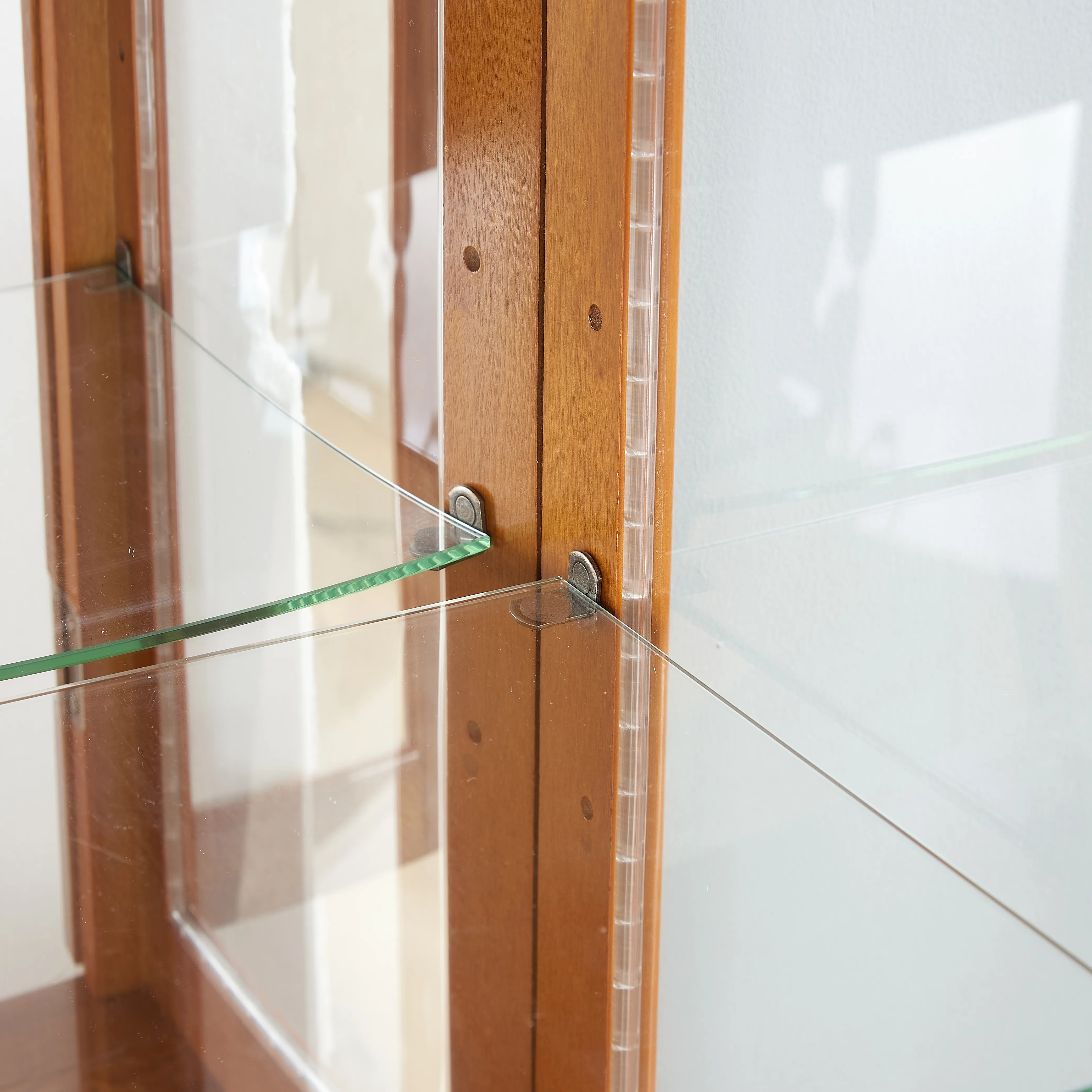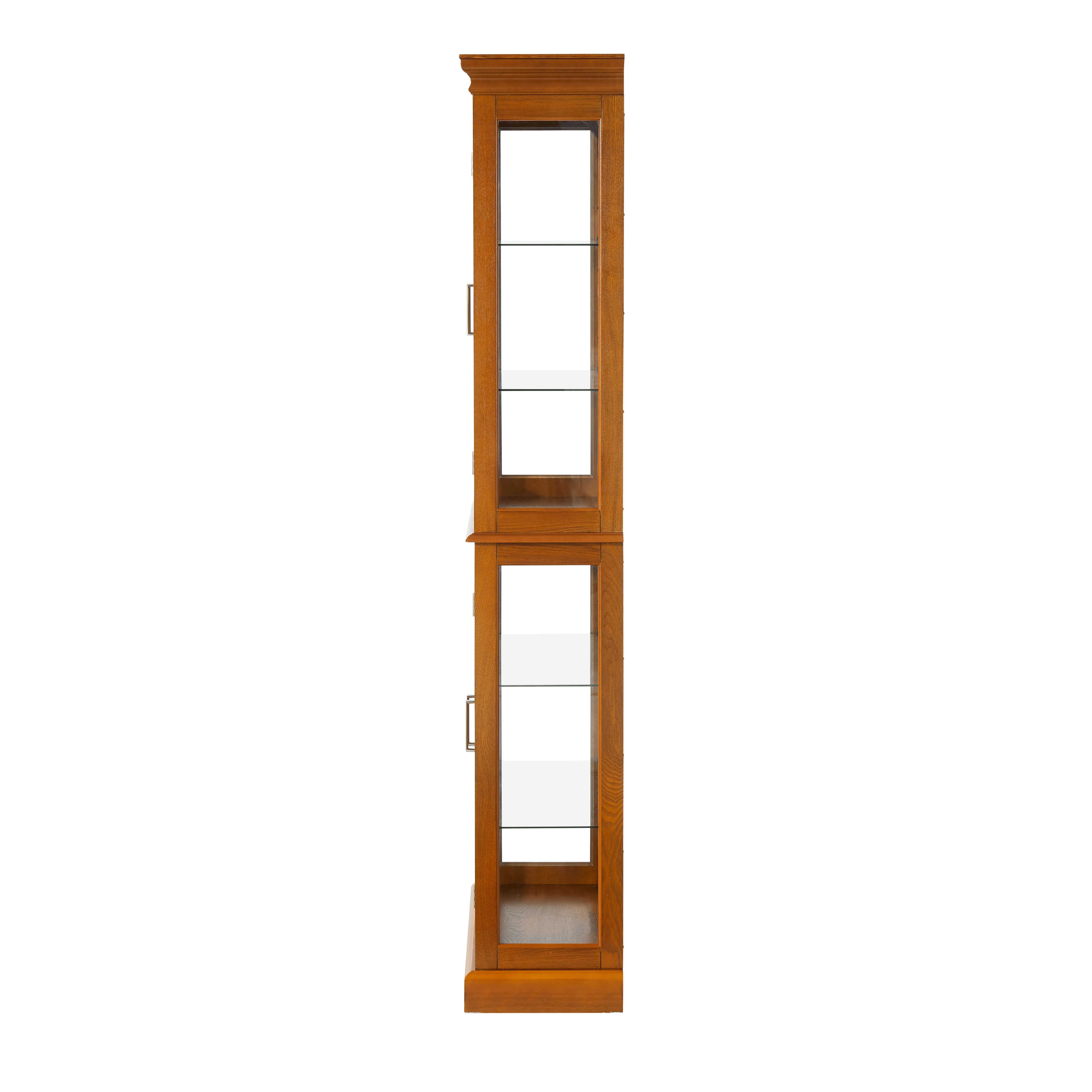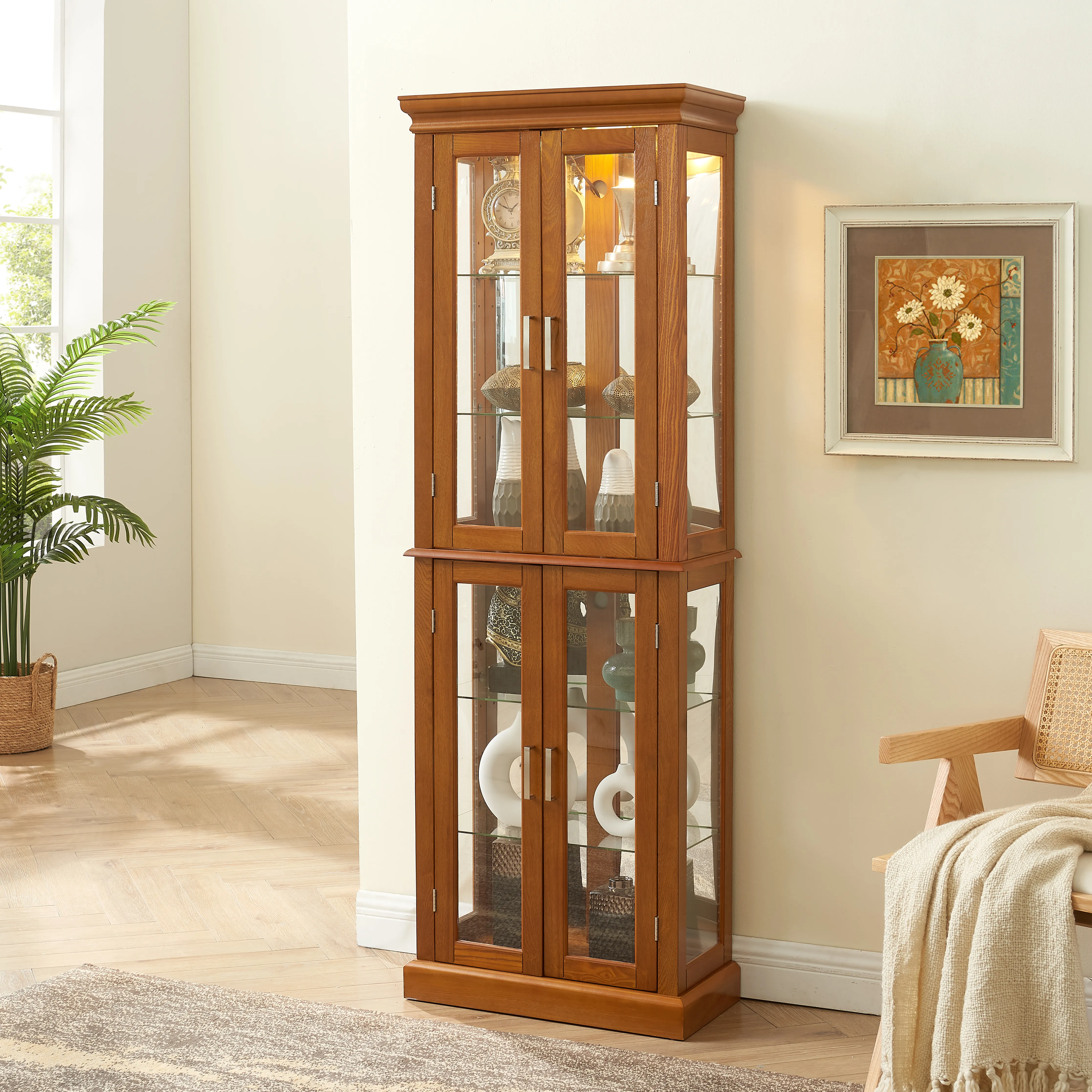 Versatile Design: The transitional display cabinet features clean lines and a timeless style, suitable for any room in your home, offering extra storage or a stylish display for keepsakes. Adjustable Shelves: Includes 6 shelves, 4 of which are adjustable tempered glass, each holding up to 15 lbs. Four front hinged doors and magnetic hardware facilitate easy access and secure closure. Internal Lighting: Equipped with an internal lighting system and mirrored back panel, it enhances the display with a reflective glow. Uses a standard E26 light bulb (not included). Dimensions and Assembly: Measures 23.75"W x 11.75"D x 70"H, weighing 75.83 lbs. Comes with detailed assembly instructions and a wall anchor; recommended two-person assembly takes about 90 minutes. Durable Construction: Made from composite wood with a Walnut finish, easy to clean with a dry, soft cloth. Avoid using liquid cleaning chemicals.