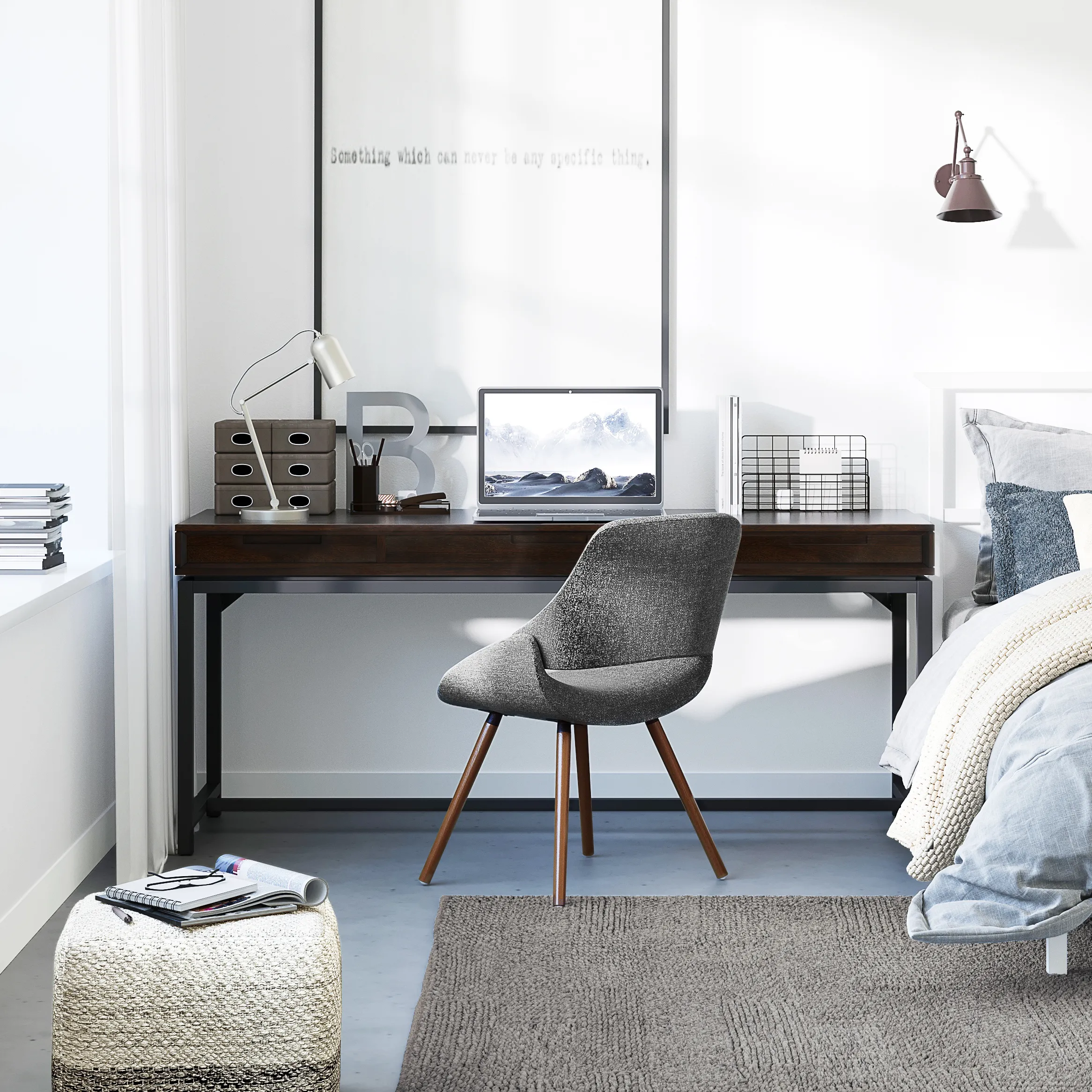 The Banting Collection is made from richly-grained solid Rubberwood. This mid-century modern industrial collection has a clean angular metal base, with square, simple modern drawer and table top. With no visible hardware, and only simple wood pull handles, the solid Rubberwood top, is simple and uncomplex. The Banting Desk has two working side drawers with ball bearing drawer glides and one centre flip down drawer/keyboard tray to maximize functionality. The 24" x 60" size is large enough for a well appointed home office, and narrow enough to fit into your living room or even kitchen. The Banting collection includes coffee, console, end tables, tv stands, sideboard buffet, desks and bookcase.