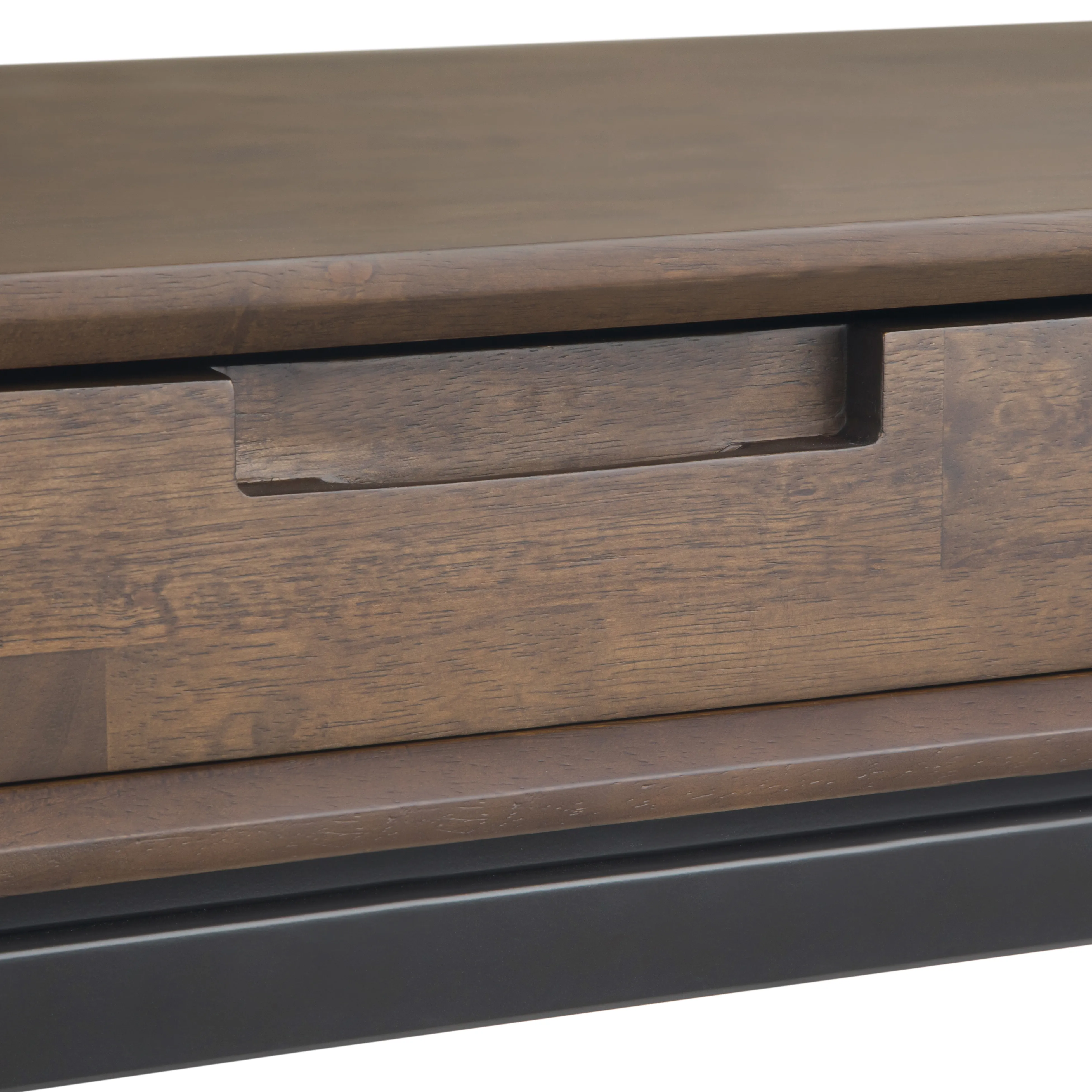 The Banting Collection is made from richly-grained solid Rubberwood. This mid-century modern industrial collection has a clean angular metal base, with square, simple modern drawer and table top. With no visible hardware, and only simple wood pull handles, the solid Rubberwood top, is simple and uncomplex. The Banting Desk has two large working side drawers with ball bearing drawer glides and one centre flip down drawer/keyboard tray to maximize functionality. The 24" x 72" size is large enough for a well appointed executive home office for a desk that can really handle the workload. The Banting collection includes coffee, console, end tables, tv stands, sideboard buffet, desks and bookcase.