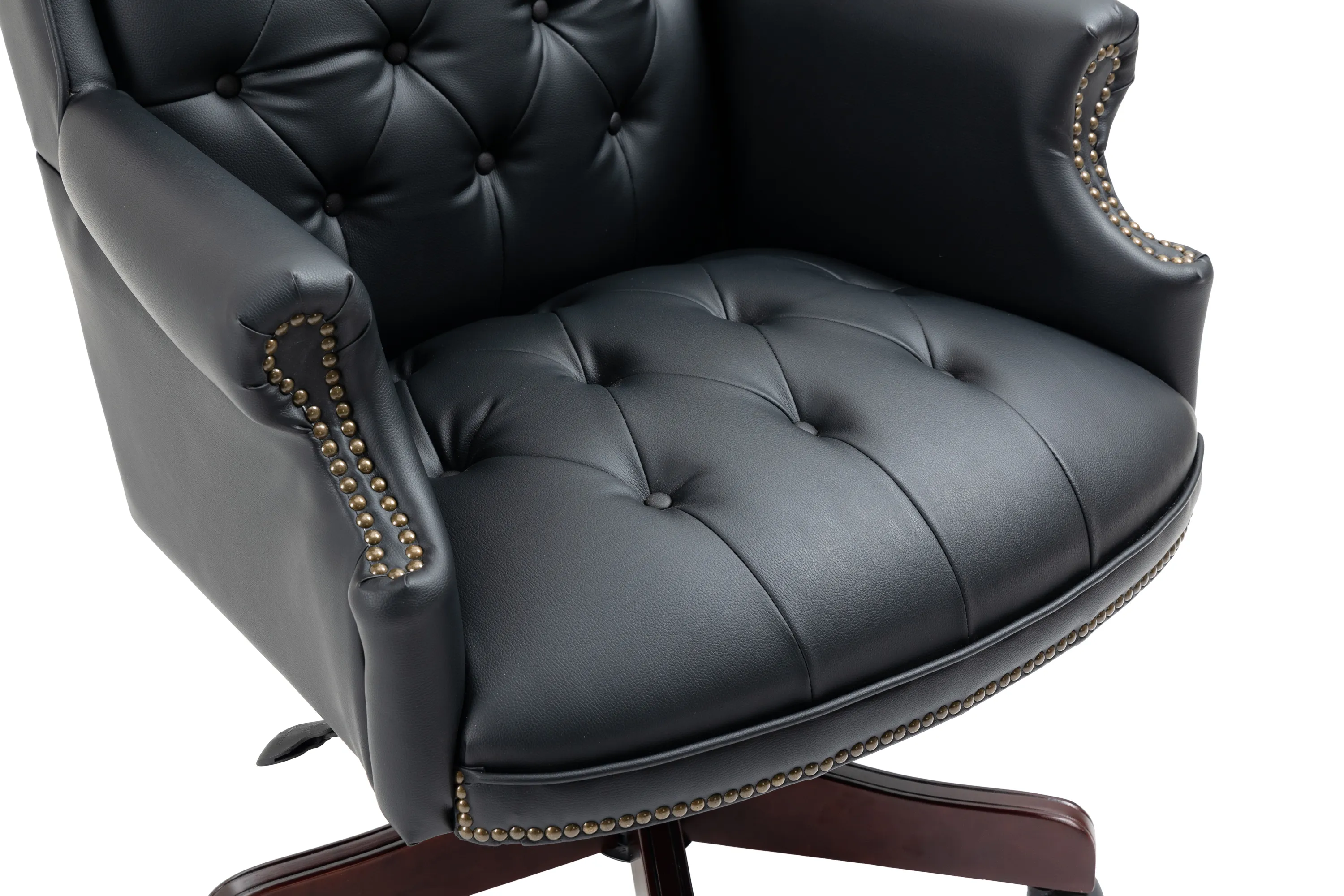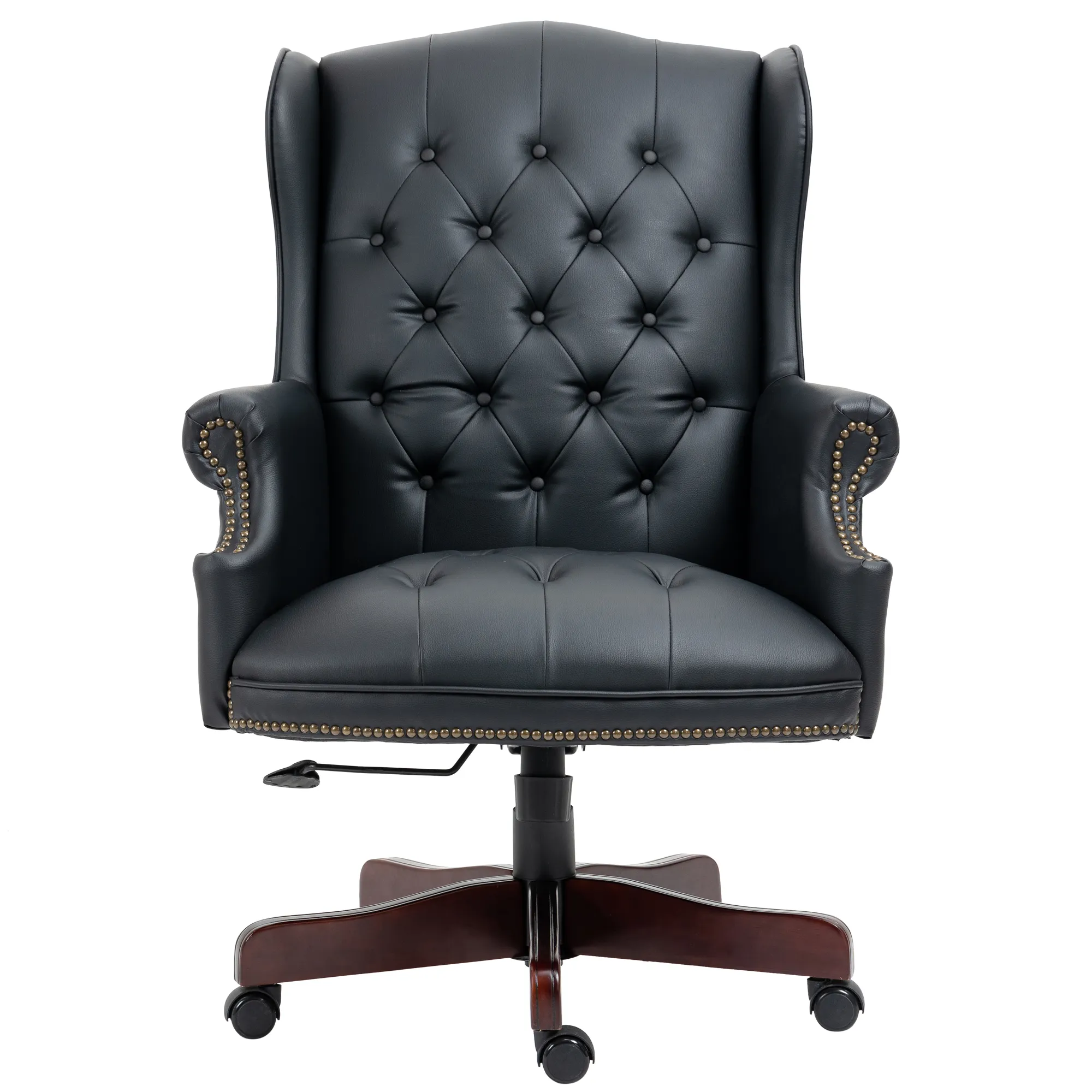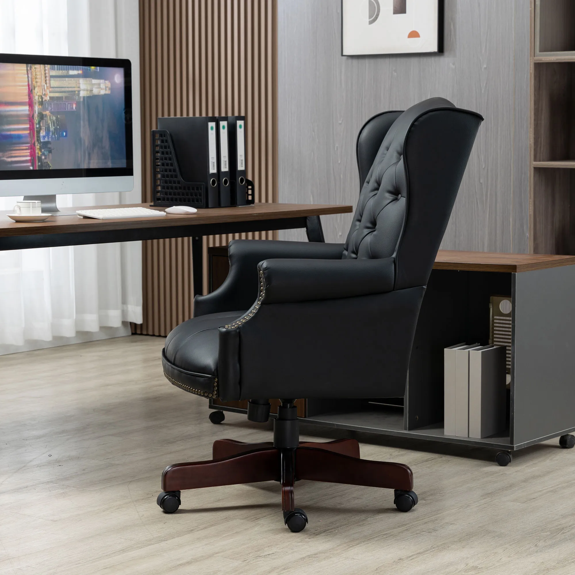 Elevate Your Workspace with Style and Comfort: Premium black leather chair adds sophistication to any executive workspace, reflecting professionalism and taste. Luxurious Comfort for Long Workdays: High-density foam seat and plush armrests ensure exceptional comfort for extended work hours, enhancing productivity and focus. Seamless Collaboration in Conference Rooms: Sleek black leather chair creates a professional atmosphere in conference rooms, facilitating productive meetings and collaboration. Relaxation in Your Home Office Sanctuary: Balance of support and indulgence in a black leather chair for unwinding, enjoying moments of tranquility in your home office. Sturdy Support for Boardroom Presentations: Sturdy wood base and heavy-duty gas lift provide secure support for up to 330 lbs, ideal for big and tall individuals during presentations and discussions.