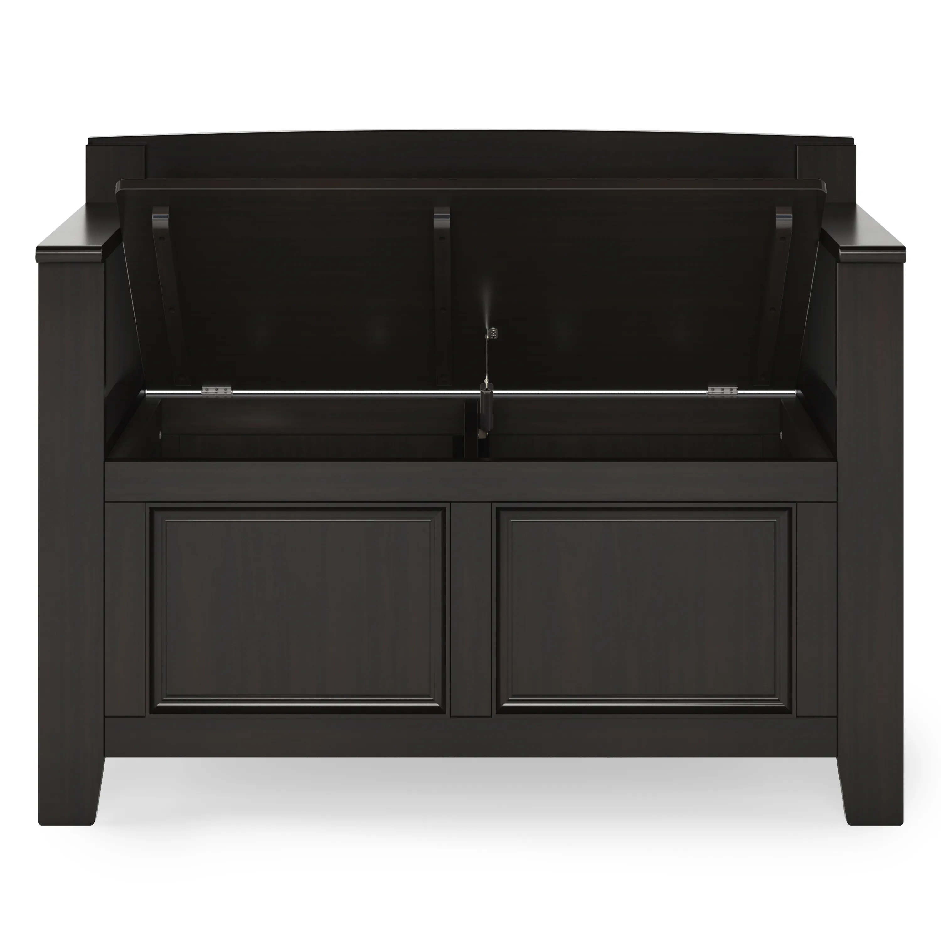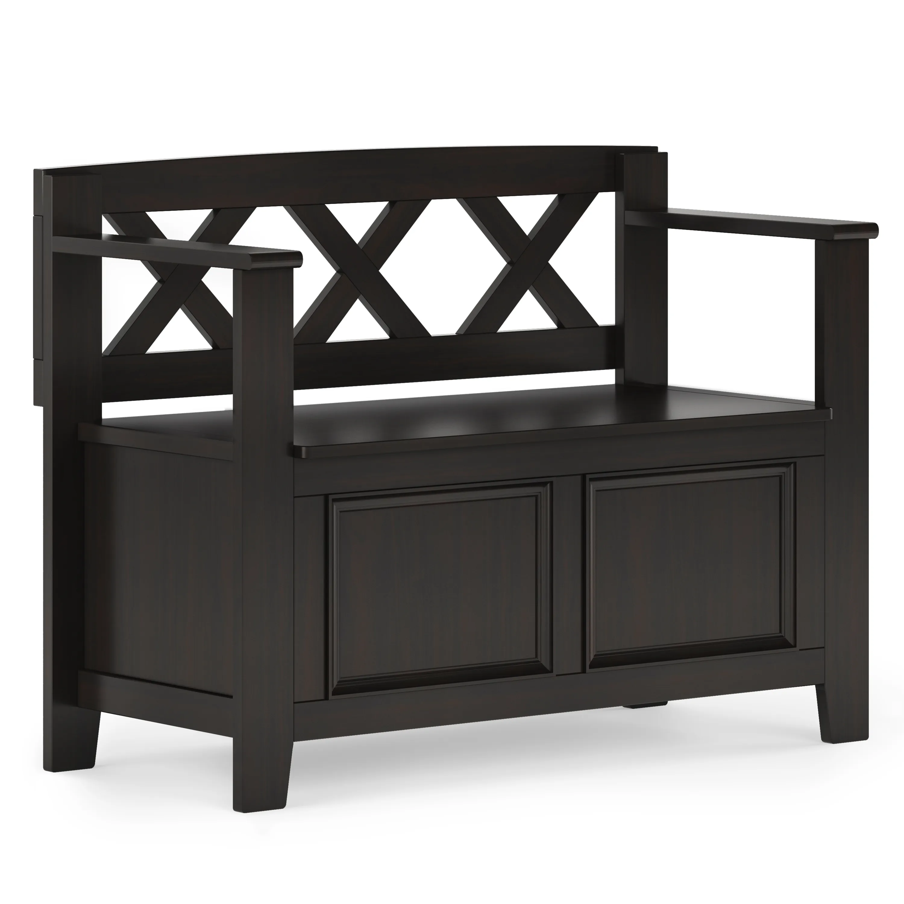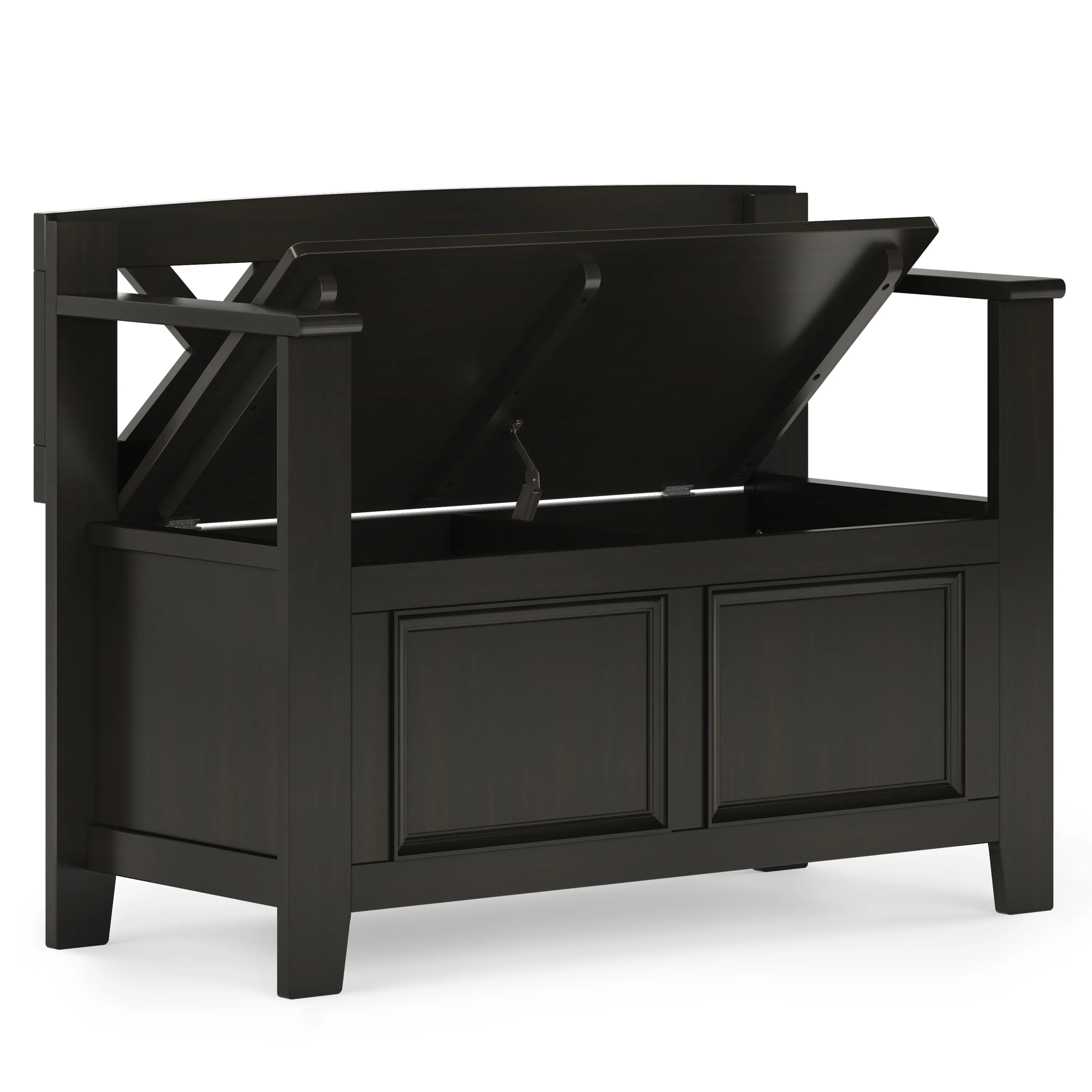 The Amherst small Entryway Storage Bench, made from solid wood, allows your inner designer to shine through while creating added storage and seating for your entryway or mudroom. "Form follows function" design rules apply here as the bench features a convenient flip up lid allowing for easy retrieval of articles from the dual storage compartment below.