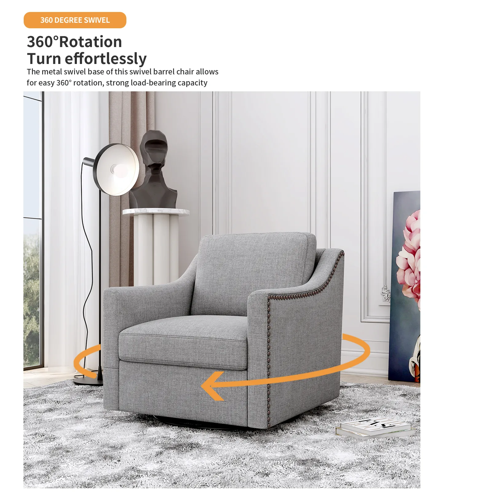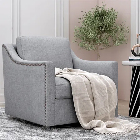 360 Degree Swivel Armchair Cotton Linen Skin-Friendly Fabric Ergonomic Design Brass Nail Decorative Armchair Living Room Chairs Bedroom Chairs Living Room Chairs Black Legs Suitable For Indoor Homes - Gray