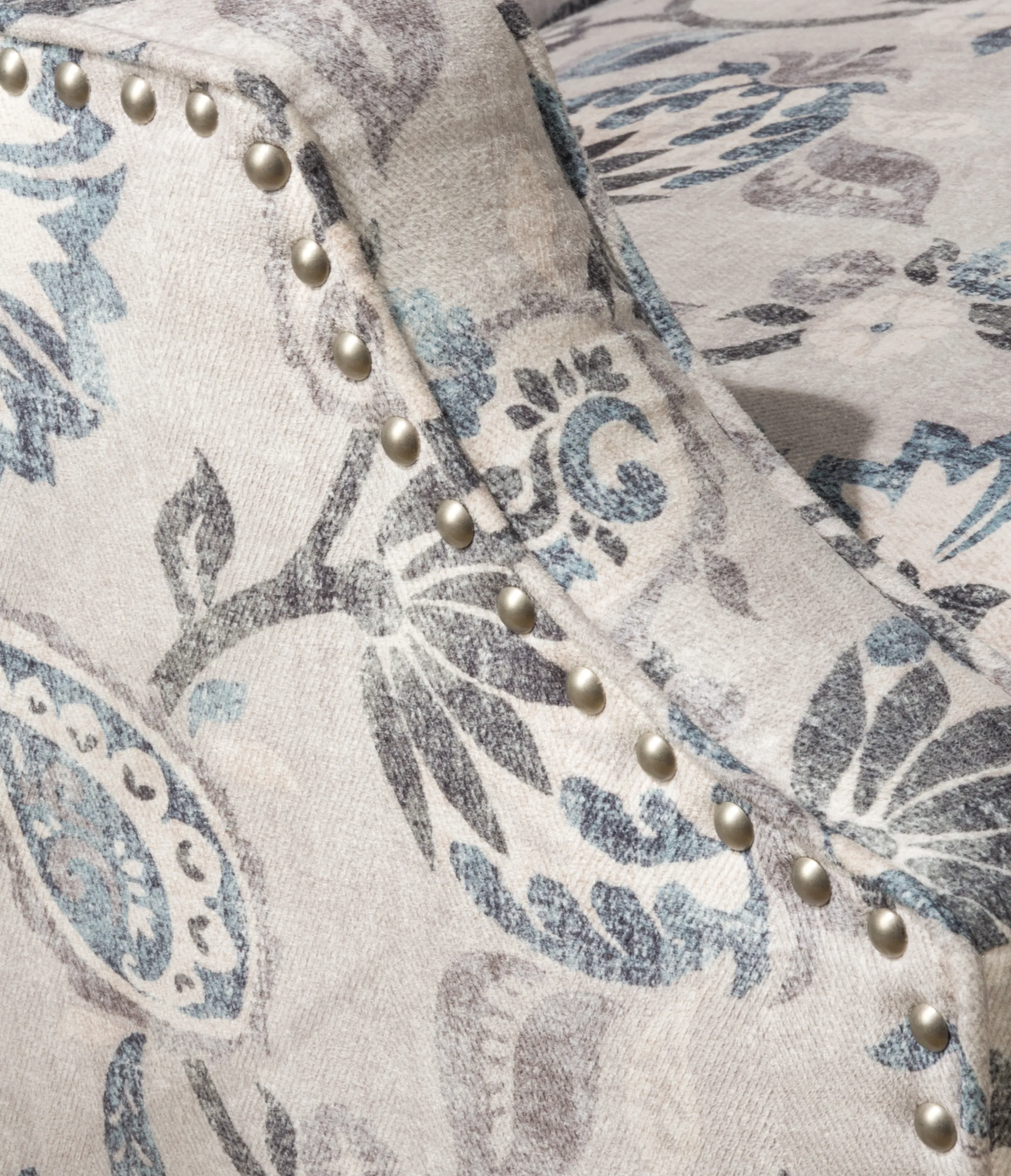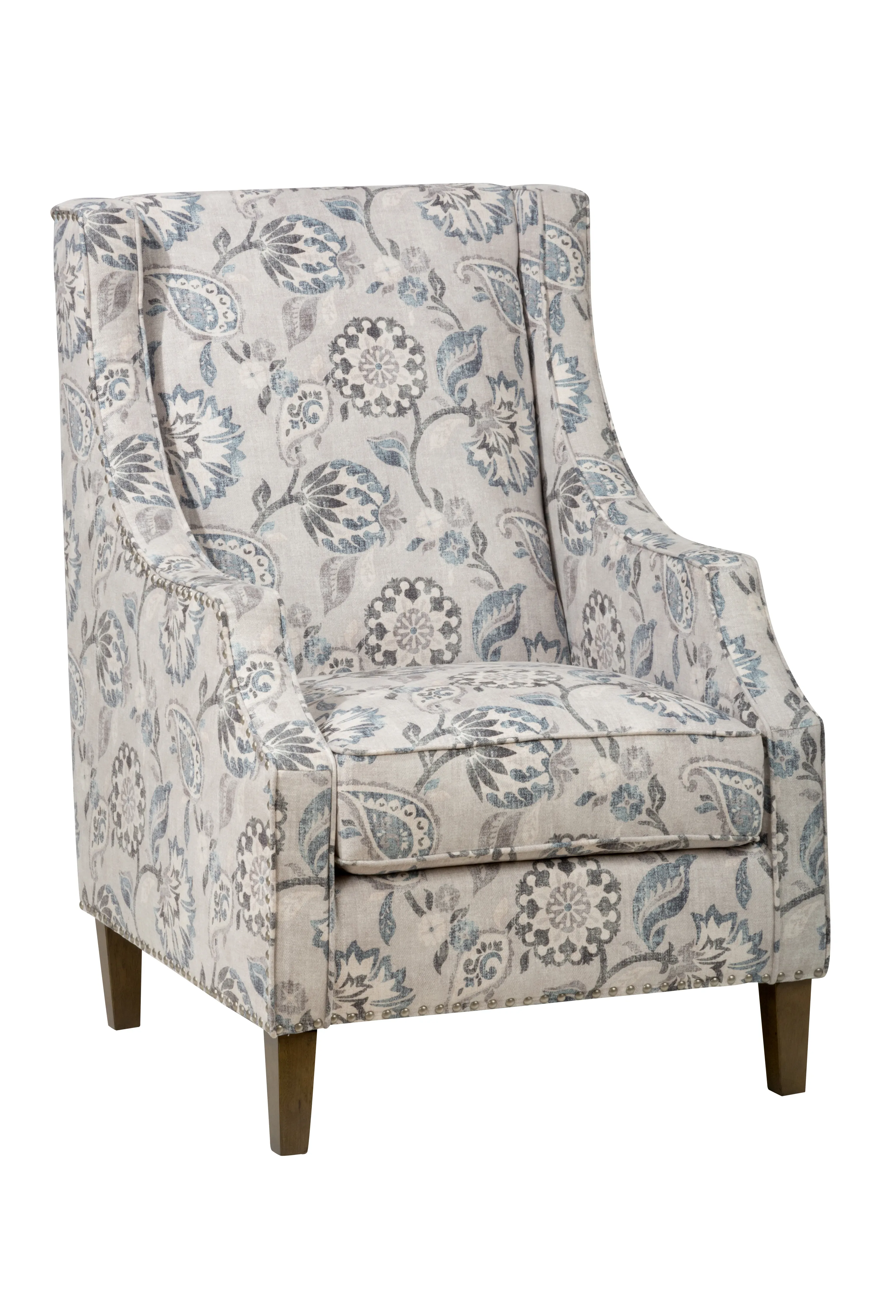 Introducing the Westbrook Accent Chair, a harmonious blend of timeless style and modern design. This exceptional chair exudes transitional charm with its distinctive wingback silhouette. Its graceful paisley pattern upholstery adds an air of sophistication to any room while the meticulous nailhead trim accents its contours with finesse.
