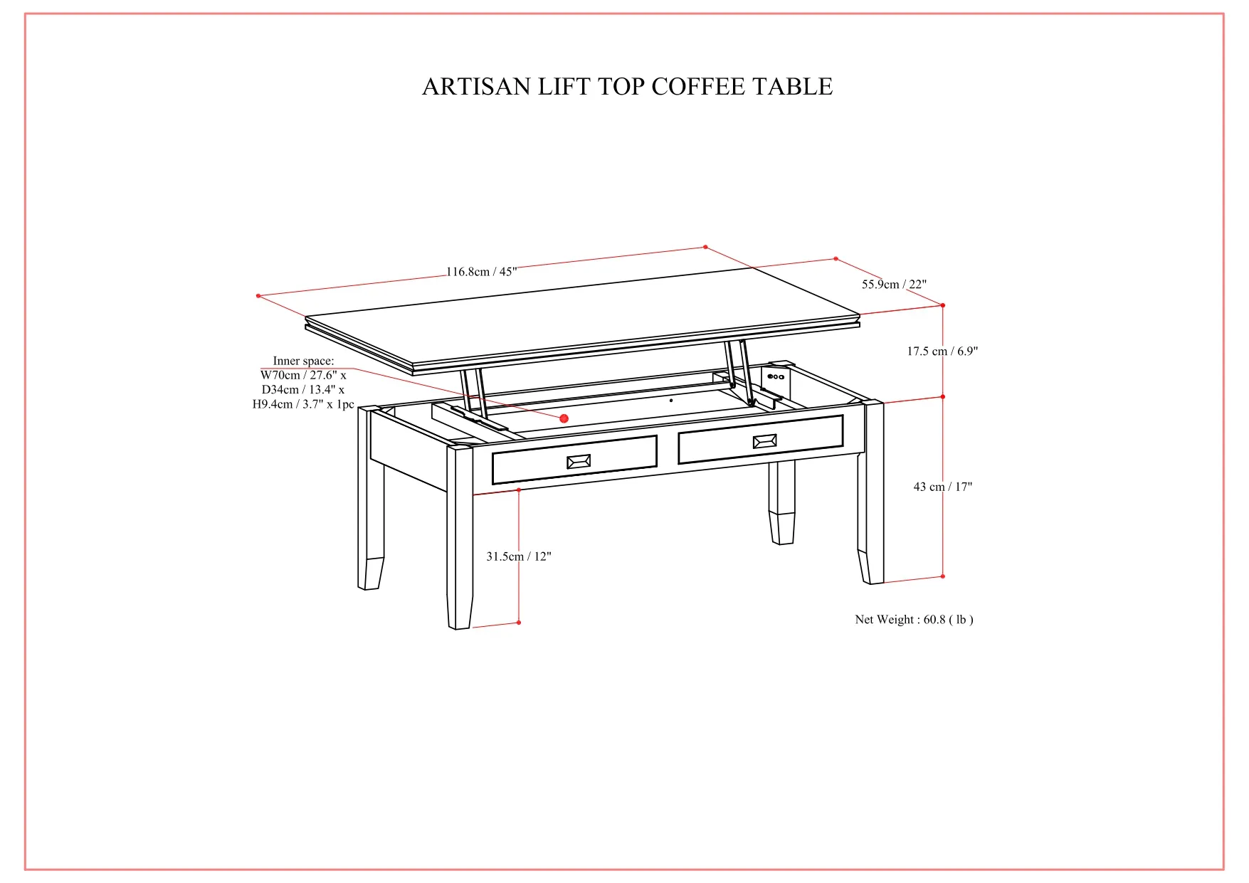 Style and convenience are at work in this uniquely functional Artisan Lift-Top Coffee Table. The top lifts to reveal hidden storage, pulling toward you for the perfect surface to type on your laptop or eat in front of the television. The large hidden storage compartment provides space to stow away anything from magazines to media essentials with ease, leaving your tabletop free of clutter. This beautiful and versatile Coffee Table can fit easily in your space...and turn heads at the same time.