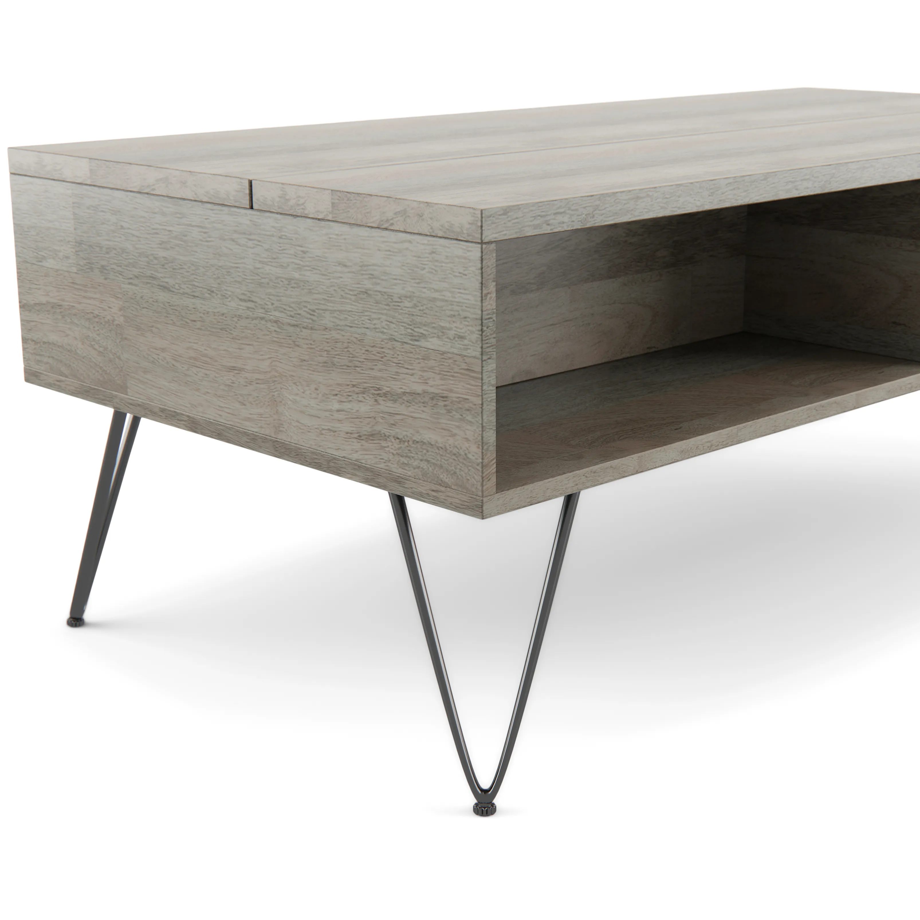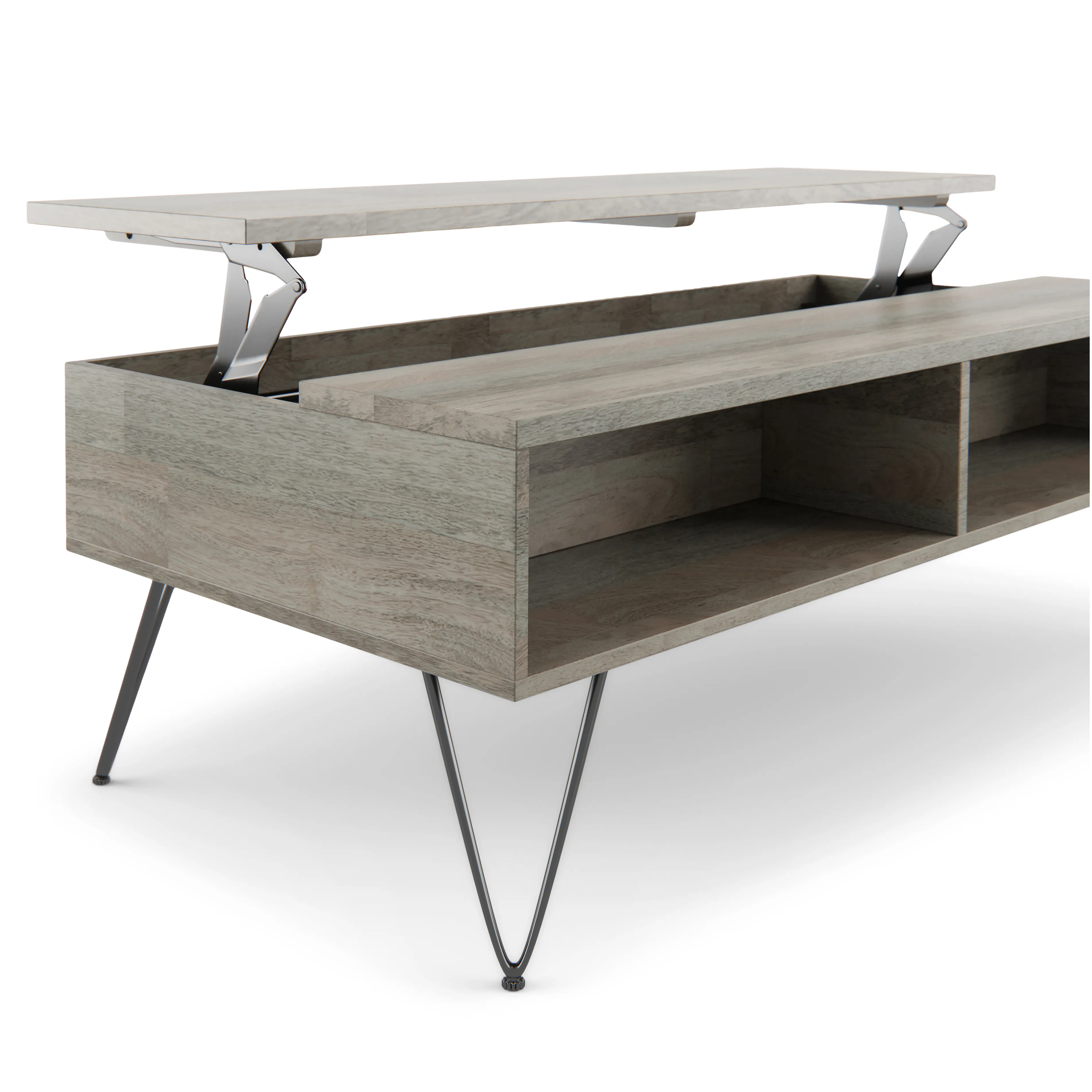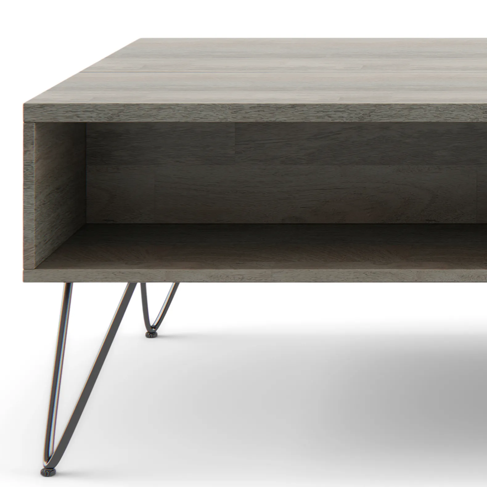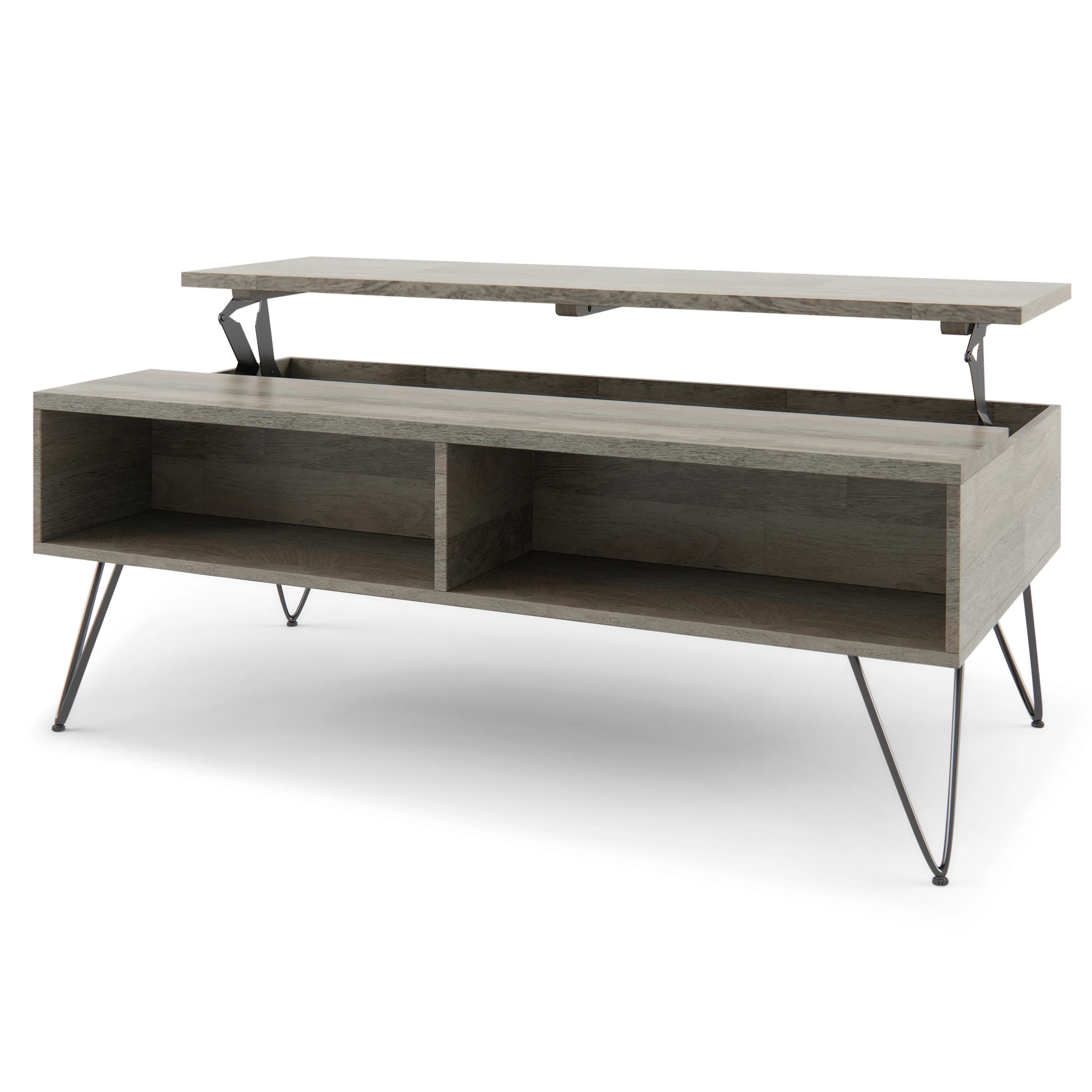Style and convenience are at work in this uniquely functional Hunter Lift-Top Coffee Table. The top lifts up to reveal hidden storage, pulling toward you for the perfect surface to type on your laptop or eat in front of the television. The table features two open compartments for stacking books or displaying decorative objects. Black iron hairpin legs along with Solid Wood add an industrial component.