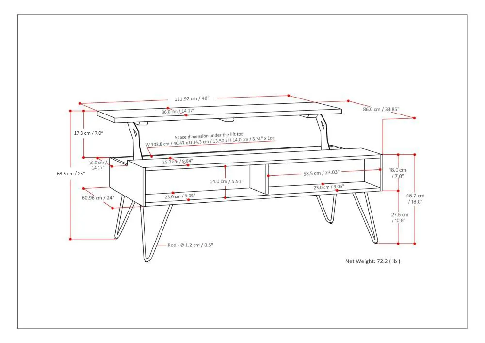 Style and convenience are at work in this uniquely functional Hunter Lift-Top Coffee Table. The top lifts up to reveal hidden storage, pulling toward you for the perfect surface to type on your laptop or eat in front of the television. The table features two open compartments for stacking books or displaying decorative objects. Black iron hairpin legs along with Solid Wood add an industrial component.