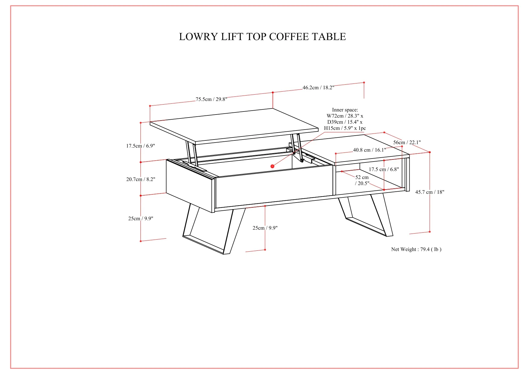 Style and convenience are at work in this uniquely functional Lowry Lift-Top Coffee Table. The table is handcrafted with a combination of metal and solid Acacia. The top lifts to reveal hidden storage, pulling toward you for the perfect surface to type on your laptop or eat in front of the television. The open compartment is ideal for stacking books or displaying decorative objects. The Lowry Coffee Table will bring an urban, industrial look to your living space.