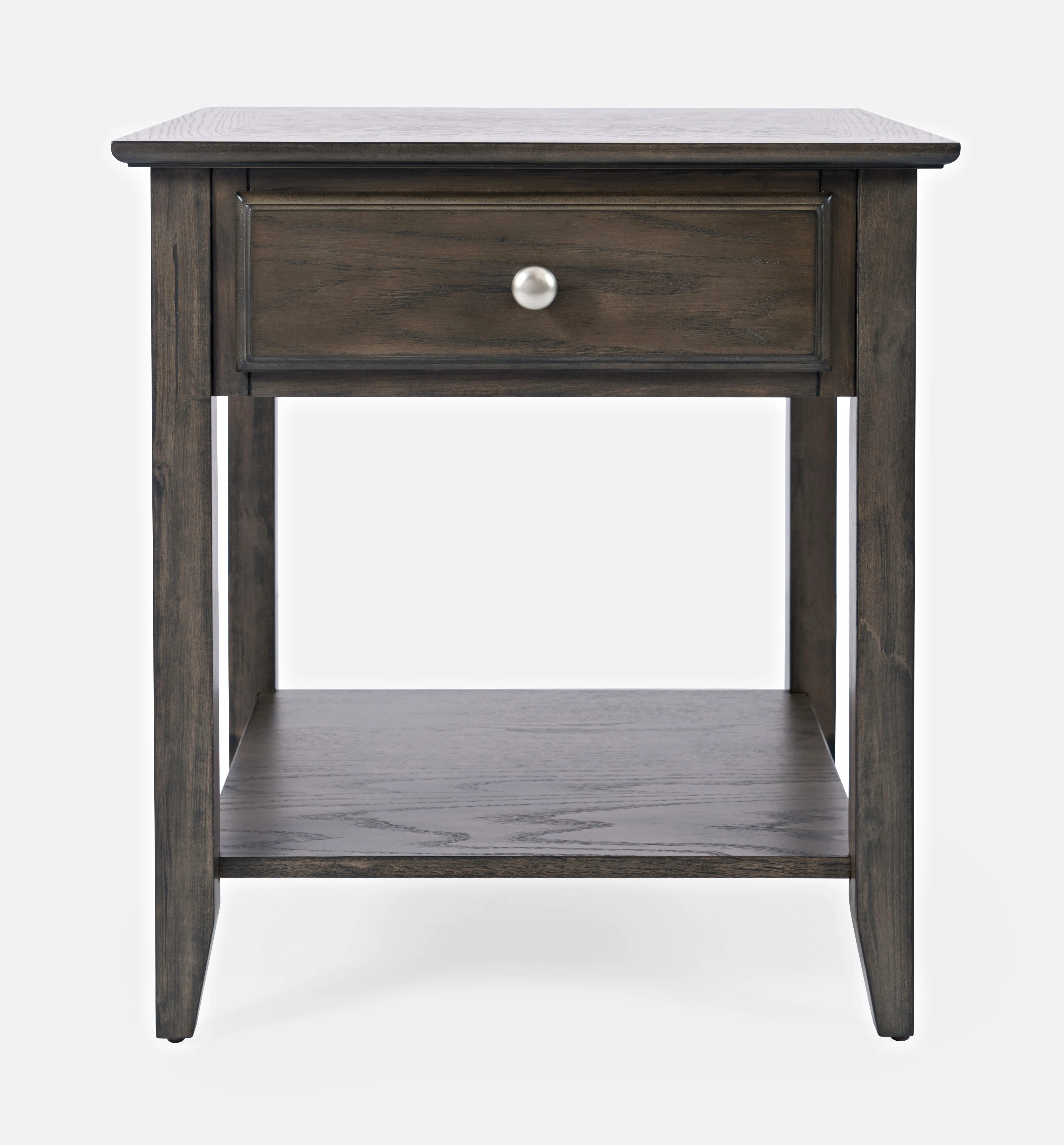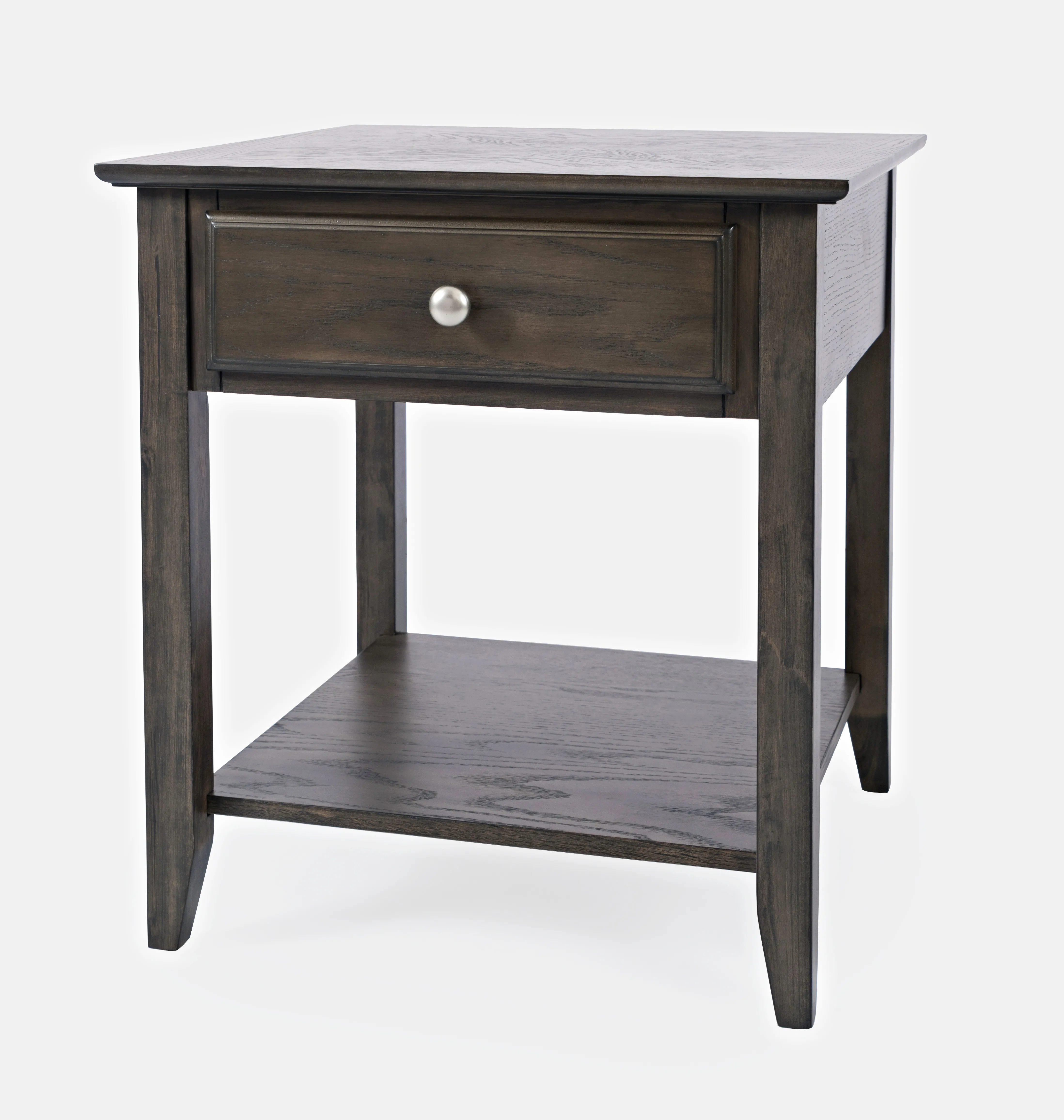 A smooth finish, a dovetailed drawer and brushed nickel hardware make this Espresso Modern End Table everyone's favorite. There is plenty of storage with the full-size drawer and one shelf, perfectly accenting your living room couch or a chair in the den, or bring it into the bedroom for a stylish nightstand. Available in Espresso Brown and Grey-Brown Carlton finishes.