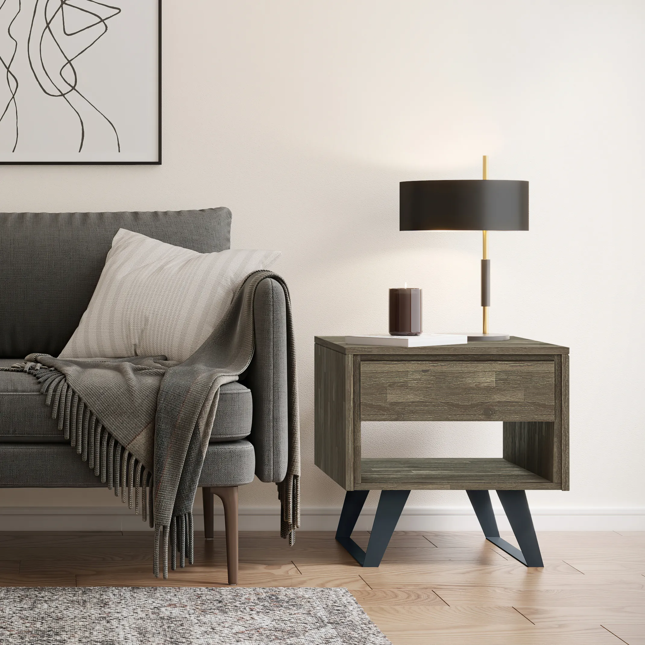 The Lowry End Table provides an Industrial, Urban look and excellent functionality combined into one product. The table is handcrafted with a perfect combination of Metal and Solid wood. The drawer and open compartment provides plenty of space for storage. Whether you need a place for your favorite book, night lamp or drink – this is the piece of furniture for you.