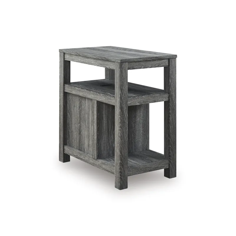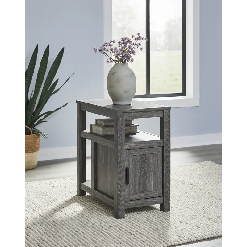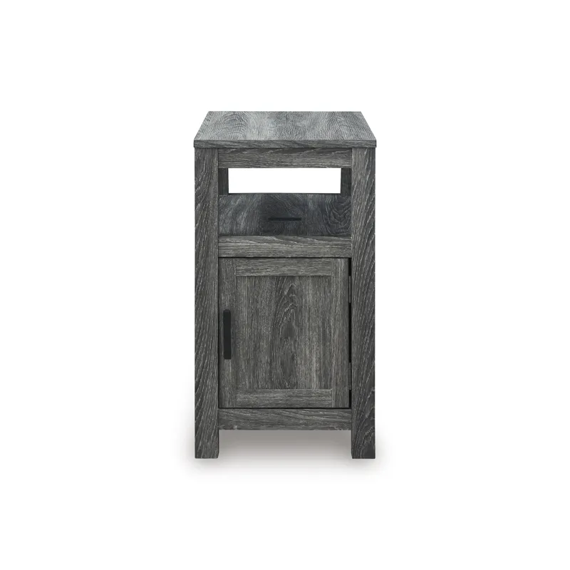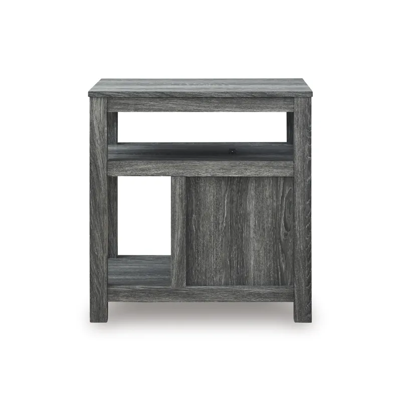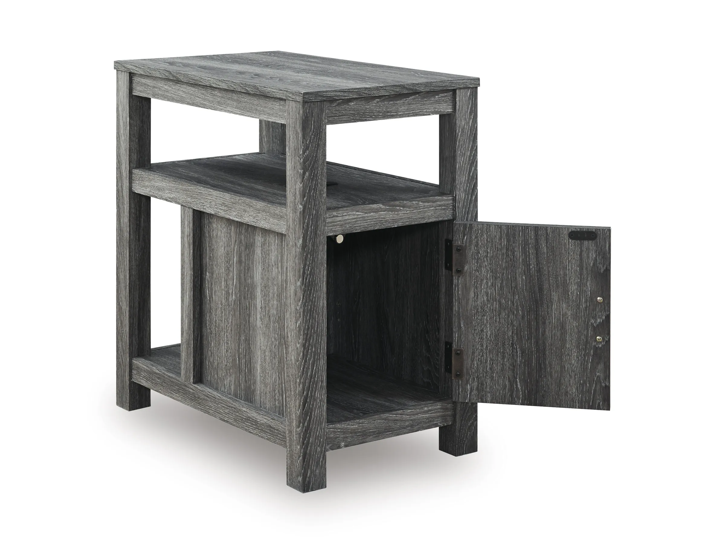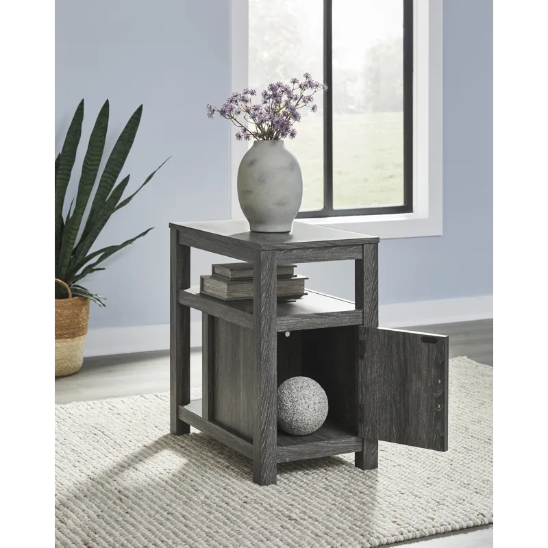 Embrace simply stylish sofa-side function with this chairside end table. Keep entertainment essentials like remotes, coasters and more close with the handy storage cabinet. Battery running low? Built-in USB ports keep easy charging at your fingertips. And with the table's replicated weathered gray finish, it has the versatility to pair with aesthetics from casual to farmhouse.