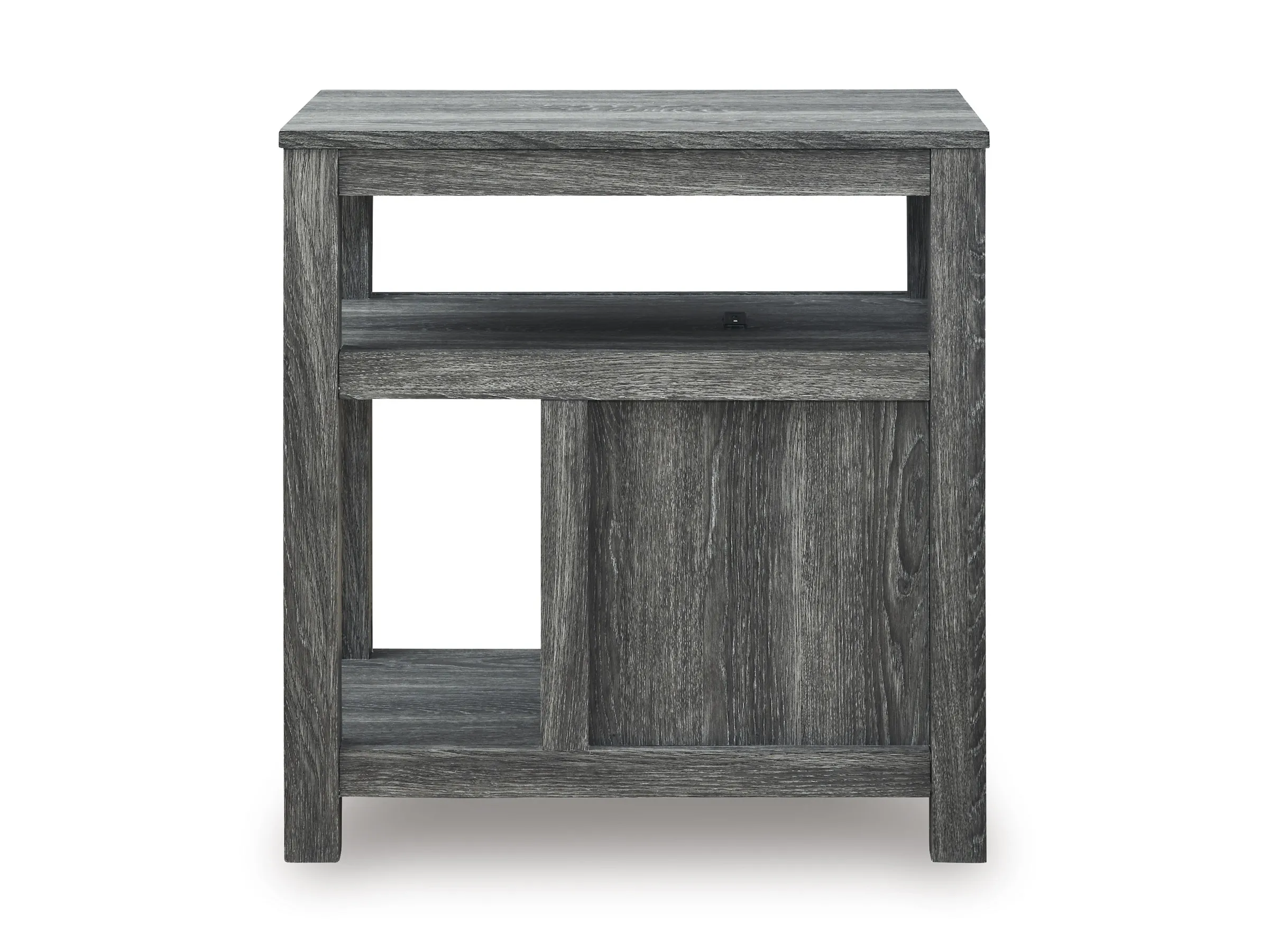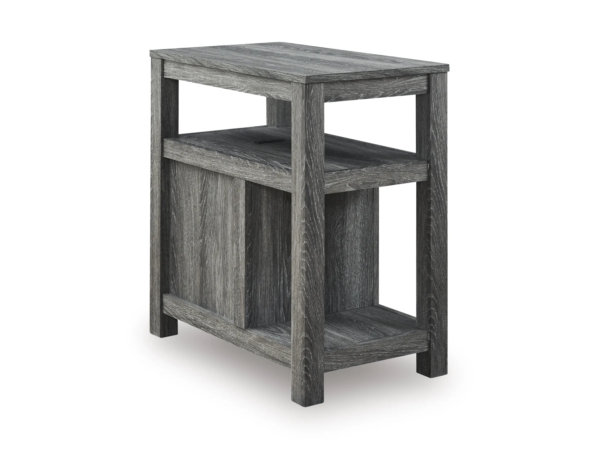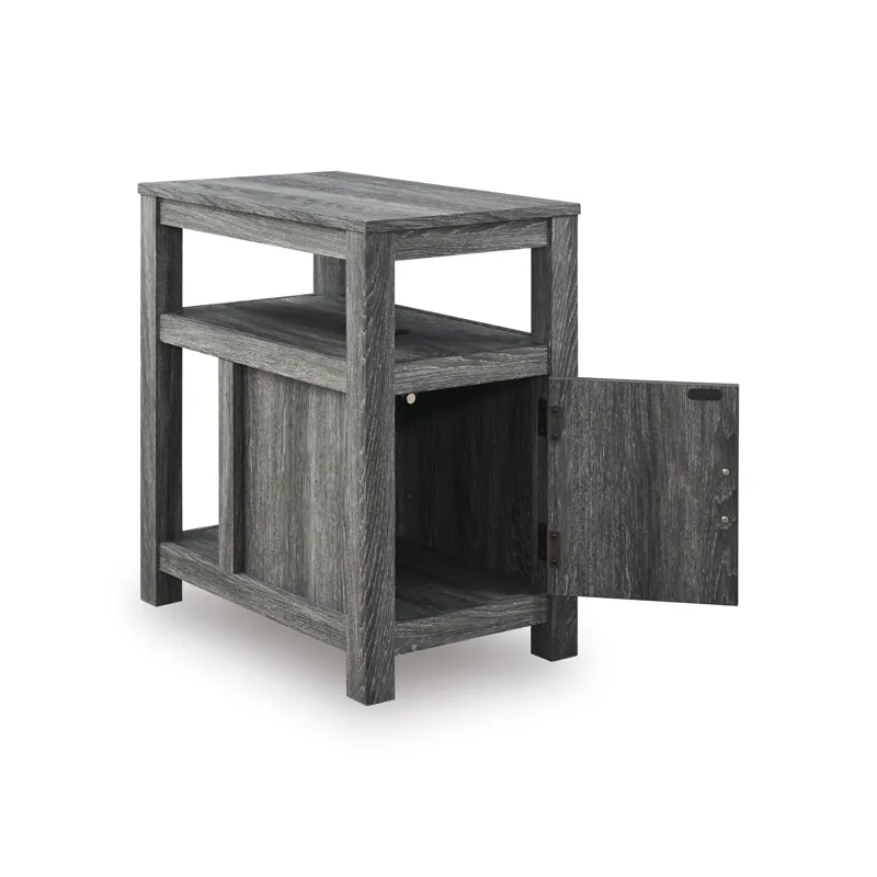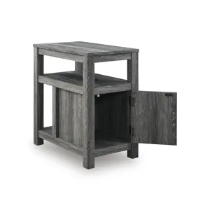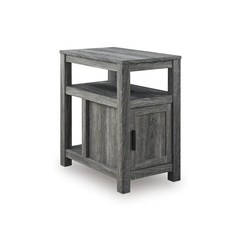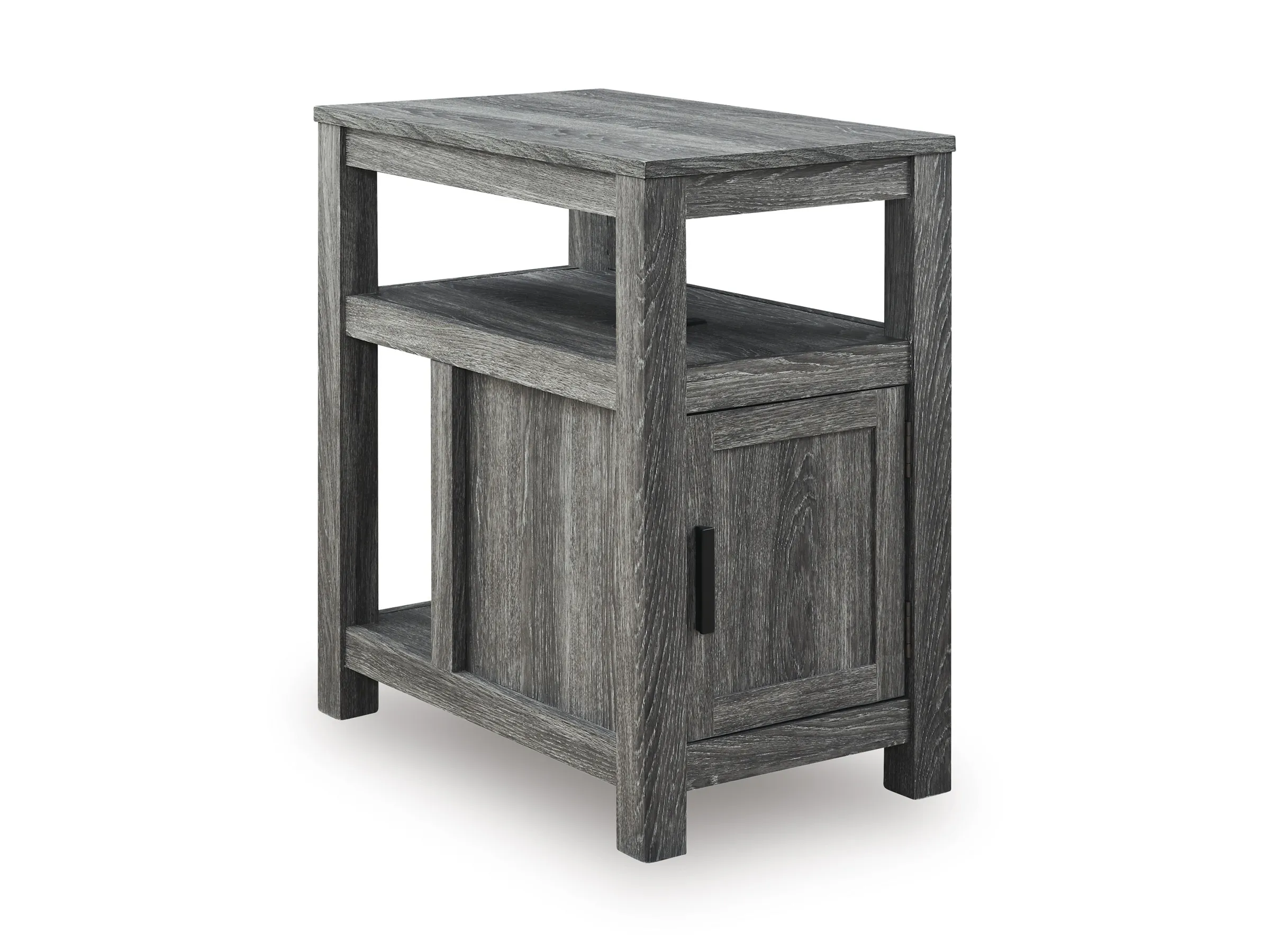 Embrace simply stylish sofa-side function with this chairside end table. Keep entertainment essentials like remotes, coasters and more close with the handy storage cabinet. Battery running low? Built-in USB ports keep easy charging at your fingertips. And with the table's replicated weathered gray finish, it has the versatility to pair with aesthetics from casual to farmhouse.