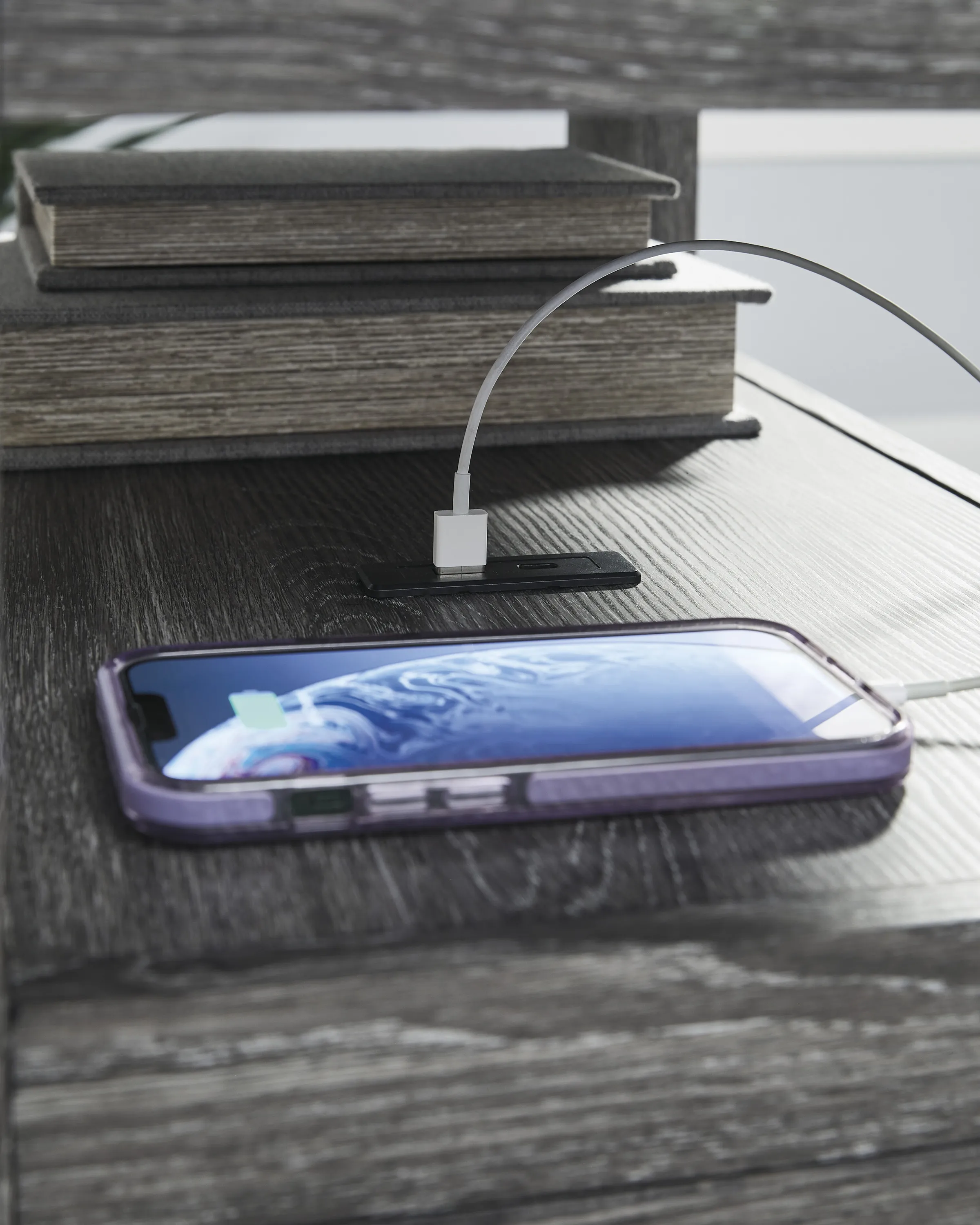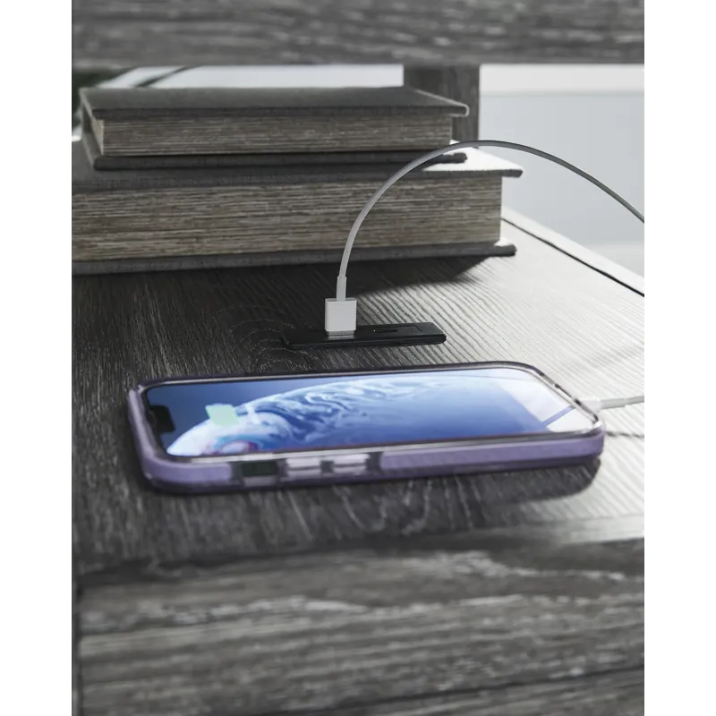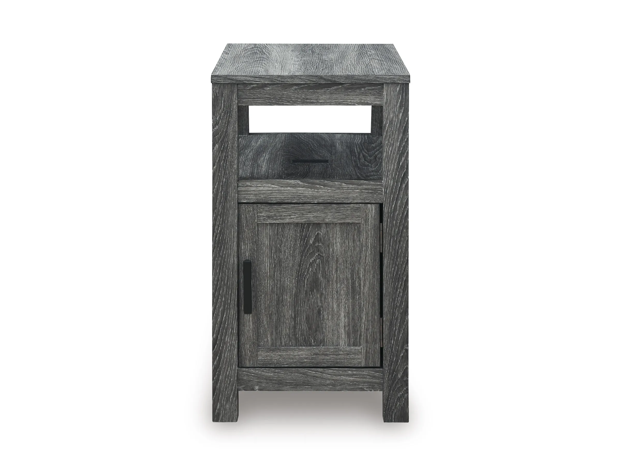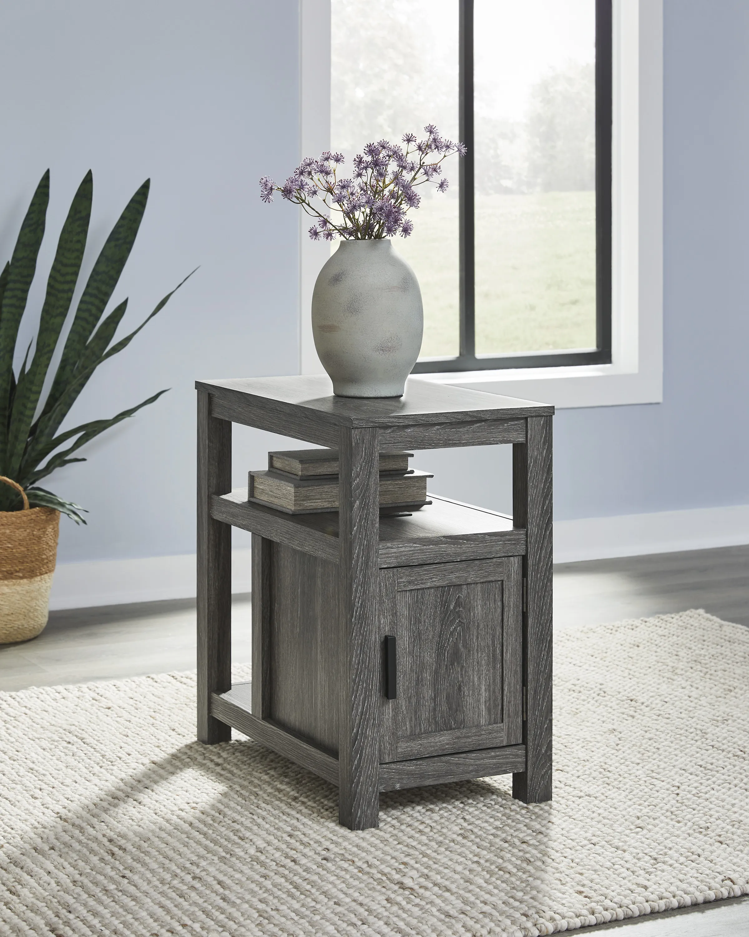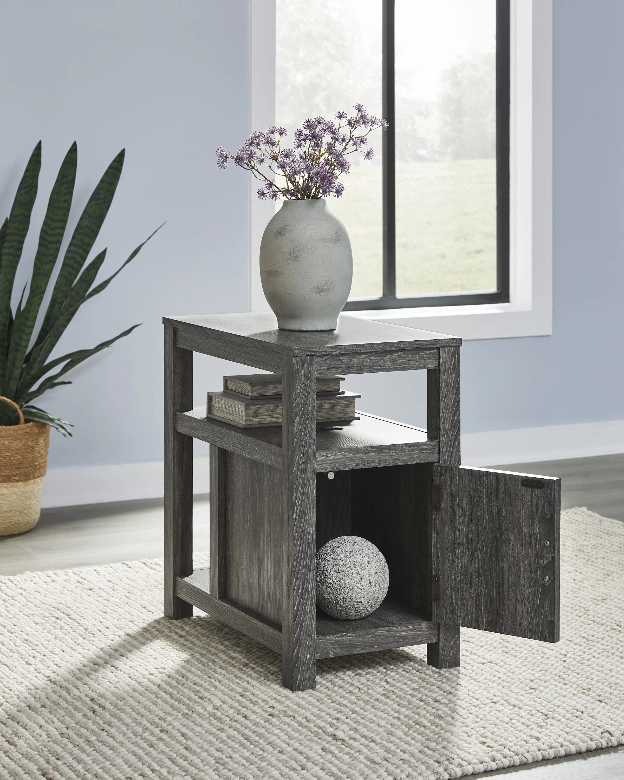 Embrace simply stylish sofa-side function with this chairside end table. Keep entertainment essentials like remotes, coasters and more close with the handy storage cabinet. Battery running low? Built-in USB ports keep easy charging at your fingertips. And with the table's replicated weathered gray finish, it has the versatility to pair with aesthetics from casual to farmhouse.