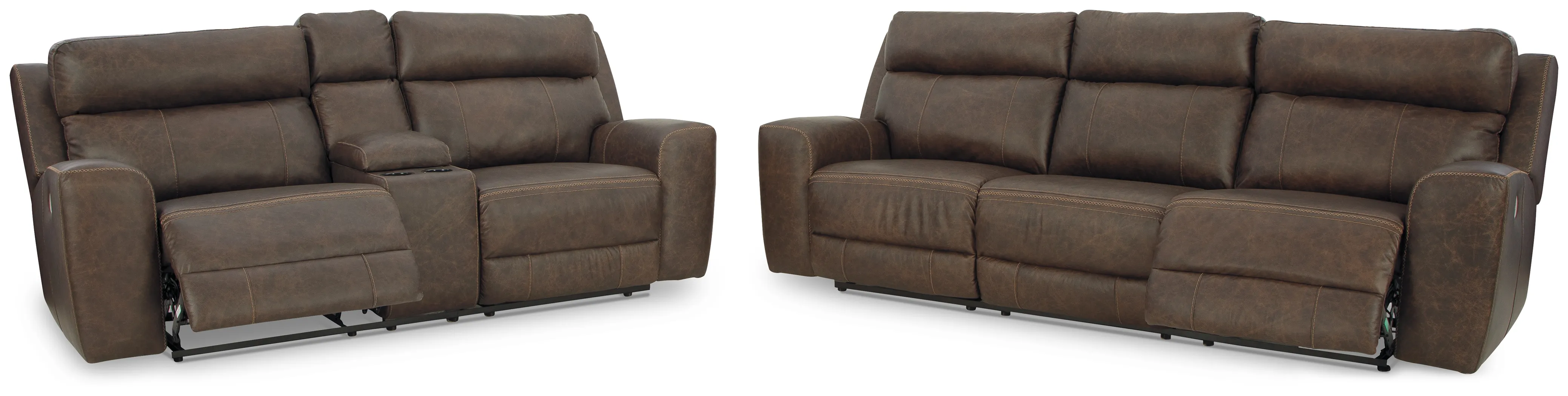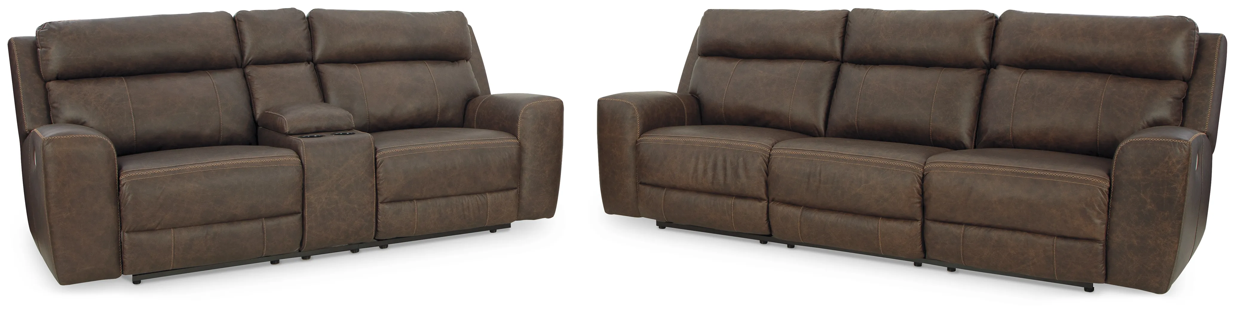 Grounded with its umber hue, positively luxurious with real leather in the seating areas. This spacious power reclining package indulges you in contemporary comfort with one-touch power controls and adjustable headrests. Its upholstery elevates your aesthetic with an eye-catching crackle effect, simultaneously amplifying the large-scale silhouettes.