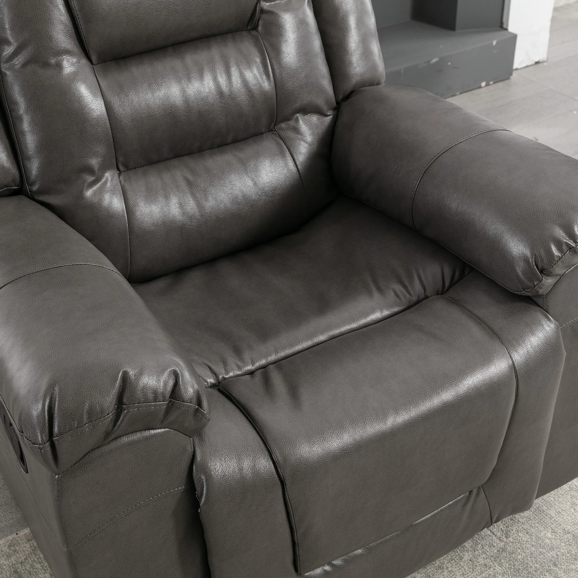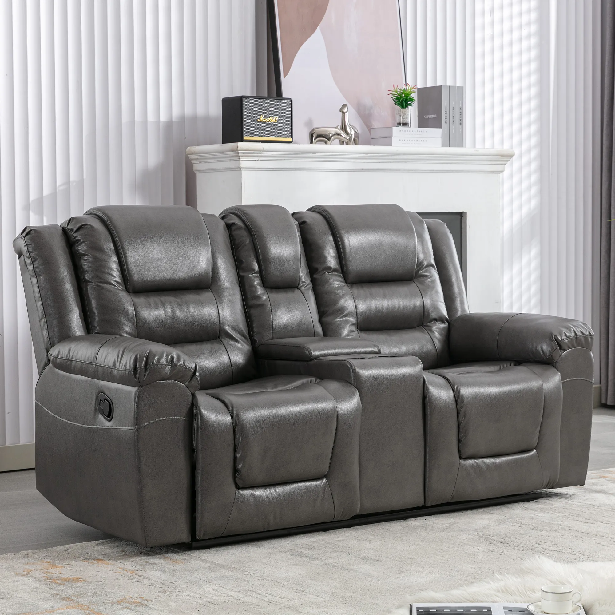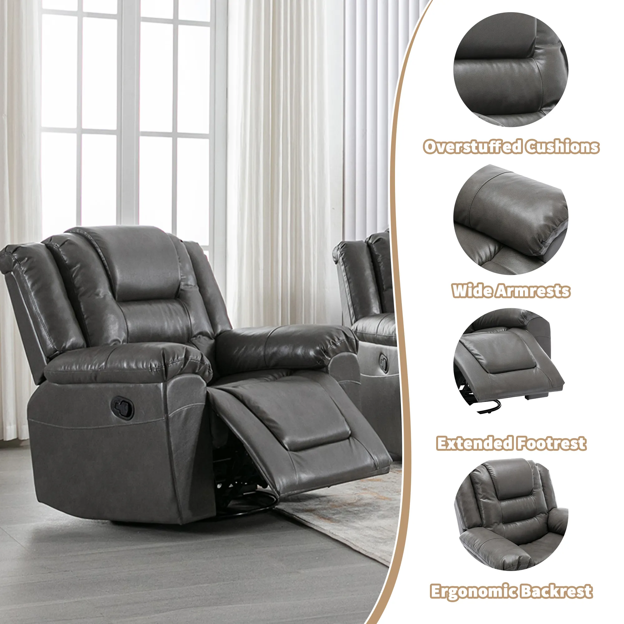 Easy Reclining: Effortlessly adjust from 110 to 150 for personalized comfort. Comfortable Design: Overstuffed cushions and wide armrests provide a cozy seating experience. User-Friendly Features: Built-in cup holders and storage box for convenience and organization. Sturdy Construction: Durable metal footrest and sturdy build ensure long-lasting stability. Easy to Maintain: Waterproof PU upholstery makes cleaning spills a breeze.