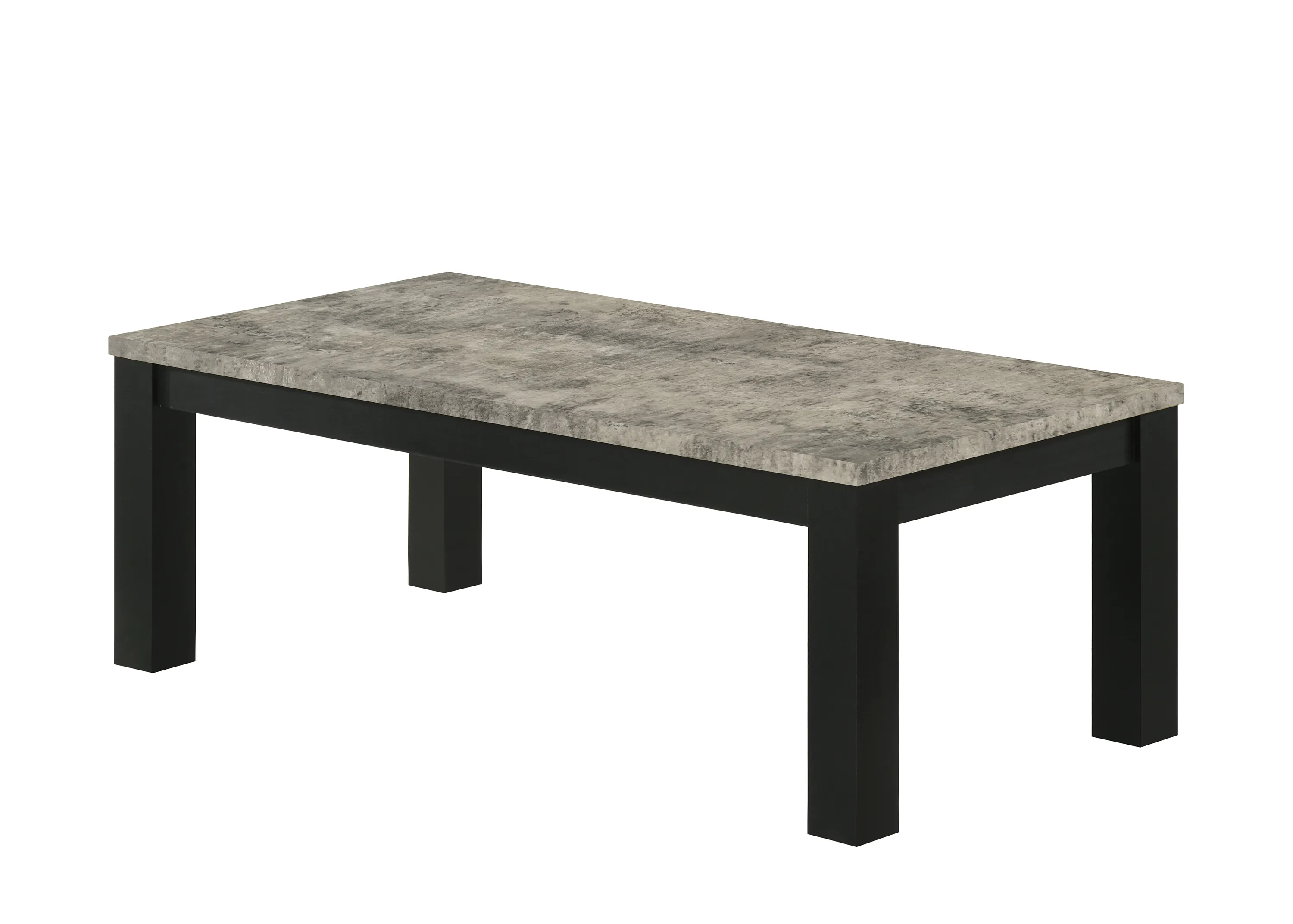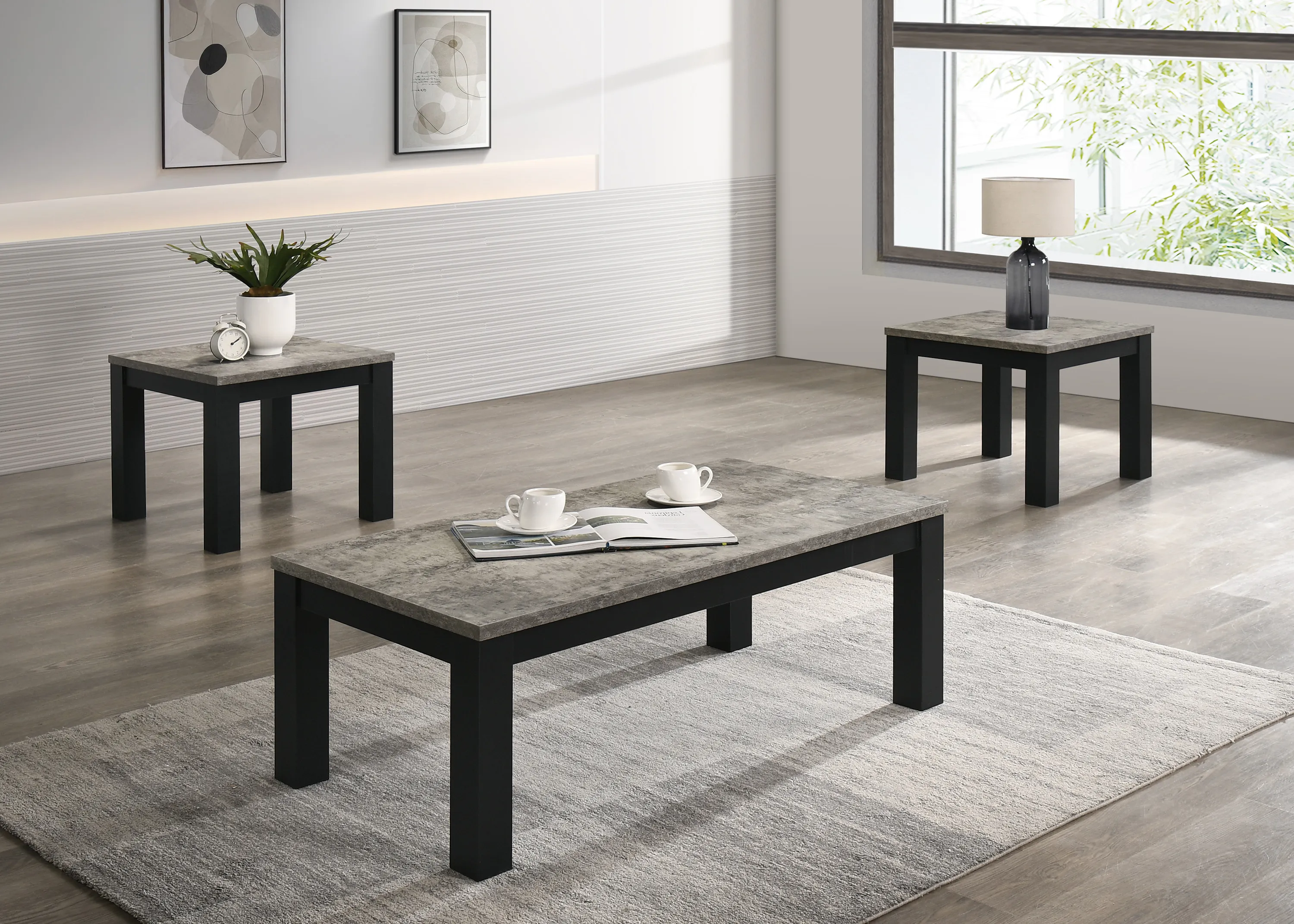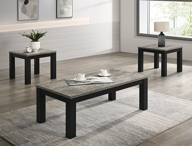 Enhance your living space with this contemporary cocktail table set, meticulously designed to infuse elegance into everyday living. The set features a robust coffee table and two matching end tables, each boasting a sleek, minimalistic design that seamlessly integrates into any modern décor. The rich, textured tabletops in a faux concrete contrast beautifully with the stark black finish of the sturdy legs, offering a visual anchor to your seating area. Ideal for both functional use and aesthetic appeal, these tables provide ample surface space for your beverages, books, and decorative items, while maintaining a clean and uncluttered look.