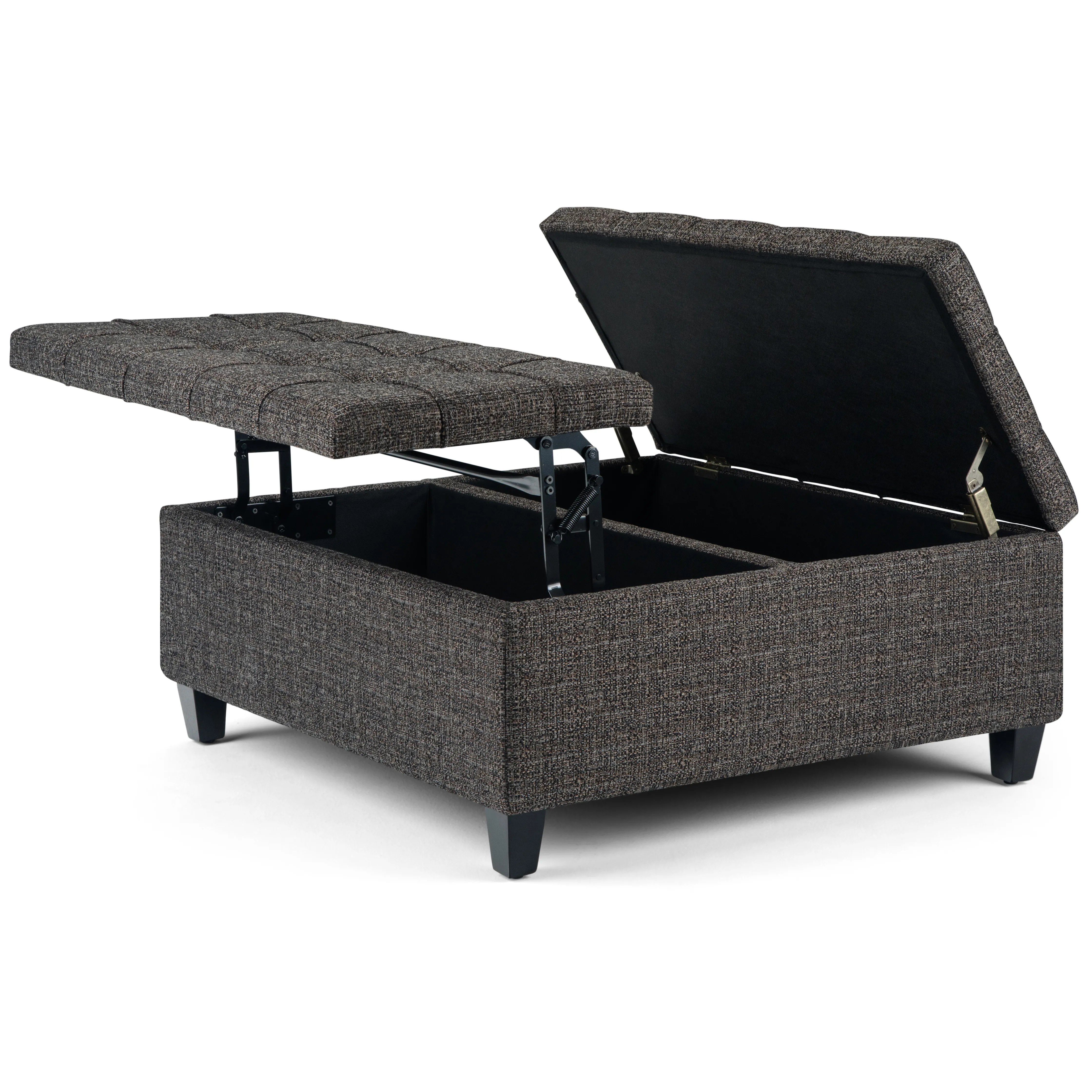 Maximize the space in your living room or family room with the Harrison Coffee Table Storage Ottoman. The contemporary, yet functional design of the ottoman makes it a necessity for any home. The split top features stylish tufted details and one side lifts up - perfect for a lap top, tablet or dining. The large interior space is the perfect solution for your storage needs. The Harrison Coffee Table Storage Ottoman is available in a variety of colors and upholstered options.