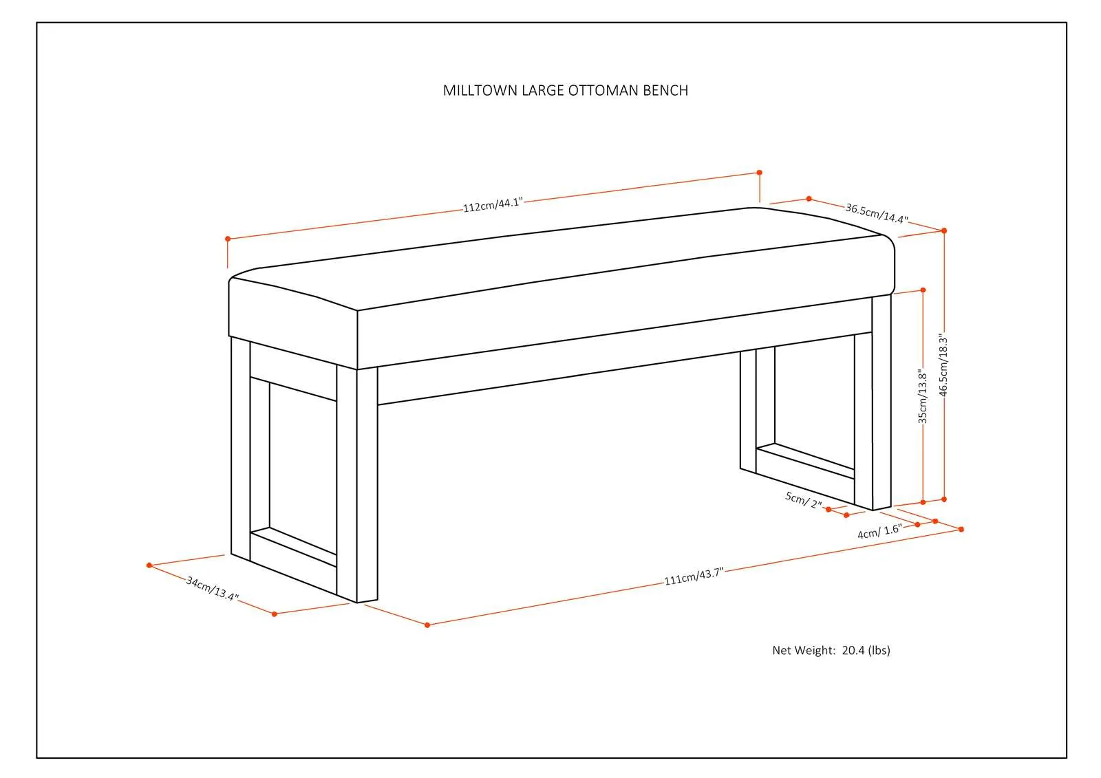 Update your living space with the Milltown Ottoman Bench. Its clean modern style will add a fresh look to your space. Made with a variety of durable, high quality fabrics. This sleek ottoman features a narrow profile which is ideal for an entryway or at the end of a bed and is available in two sizes, making it suitable for just about any room in your home.