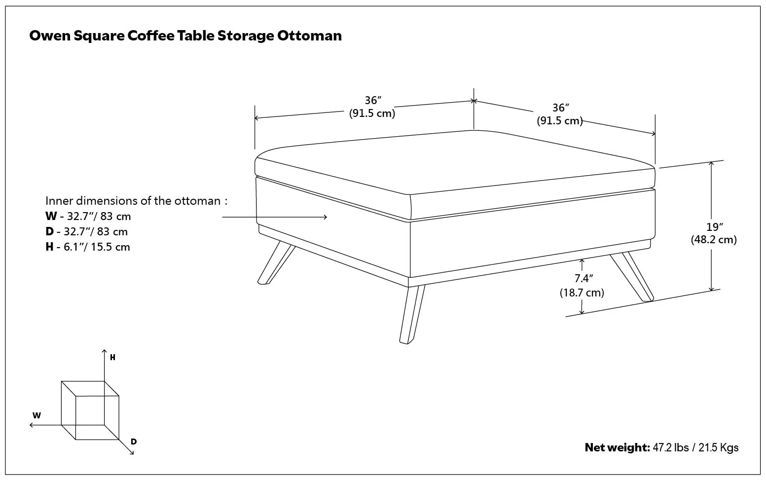 Update your space with the Owen Mid Century Square Coffee Table Storage Ottoman. Its modern style will add a fresh on trend look to your home. It features a hydraulic lift up lid and a large interior storage space. Made with solid wood and premium fabrics for stylish durability and comfort. Whether used in the living room, family room or den, it will be the showpiece that completes the room.