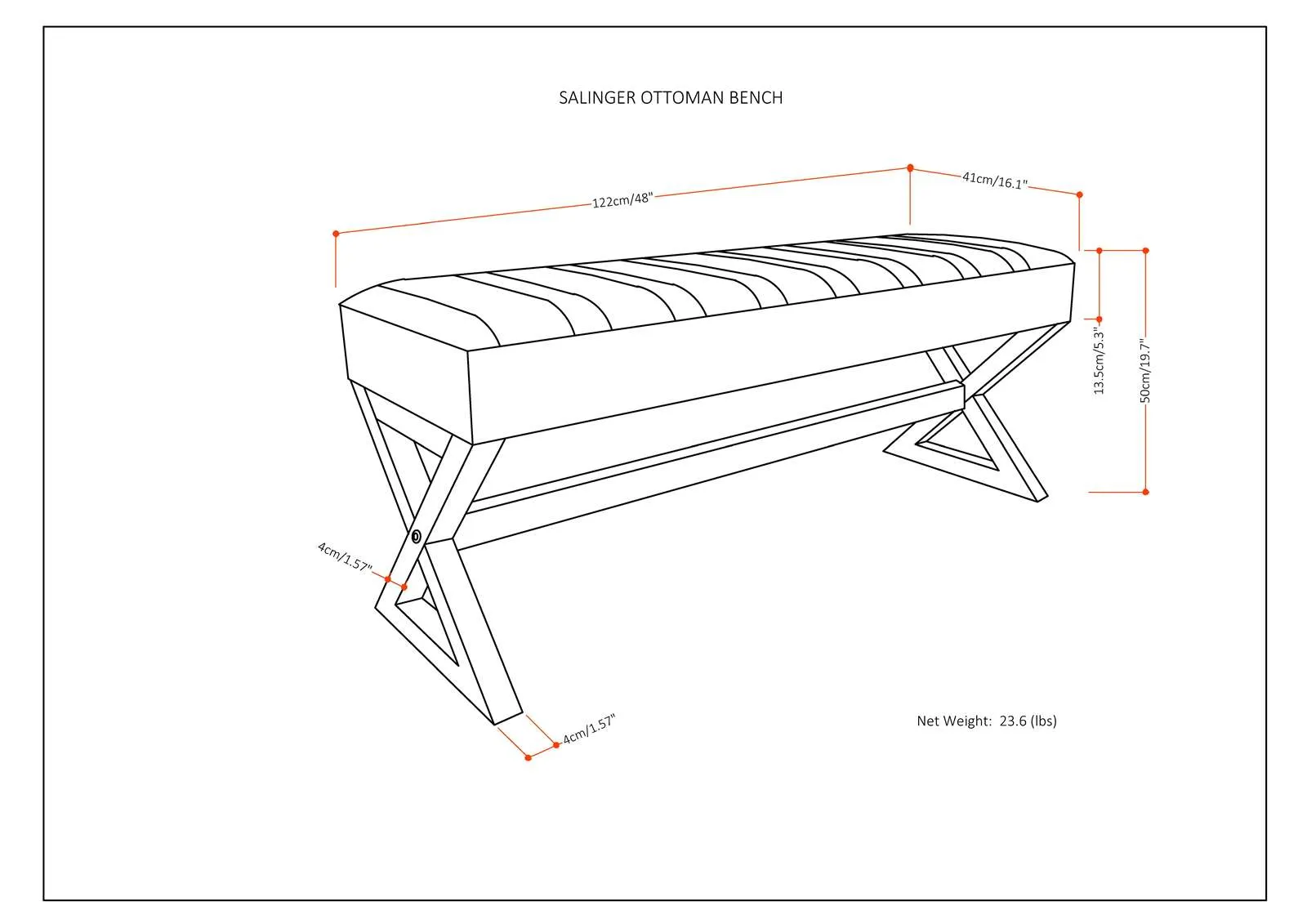 Update your living space with the Salinger Ottoman Bench. Its clean modern style will add a fresh look to your space. Made with durable, high quality durable fabrics for a luxurious feel. This sleek ottoman features a narrow profile which is ideal for an entryway or at the end the bed.