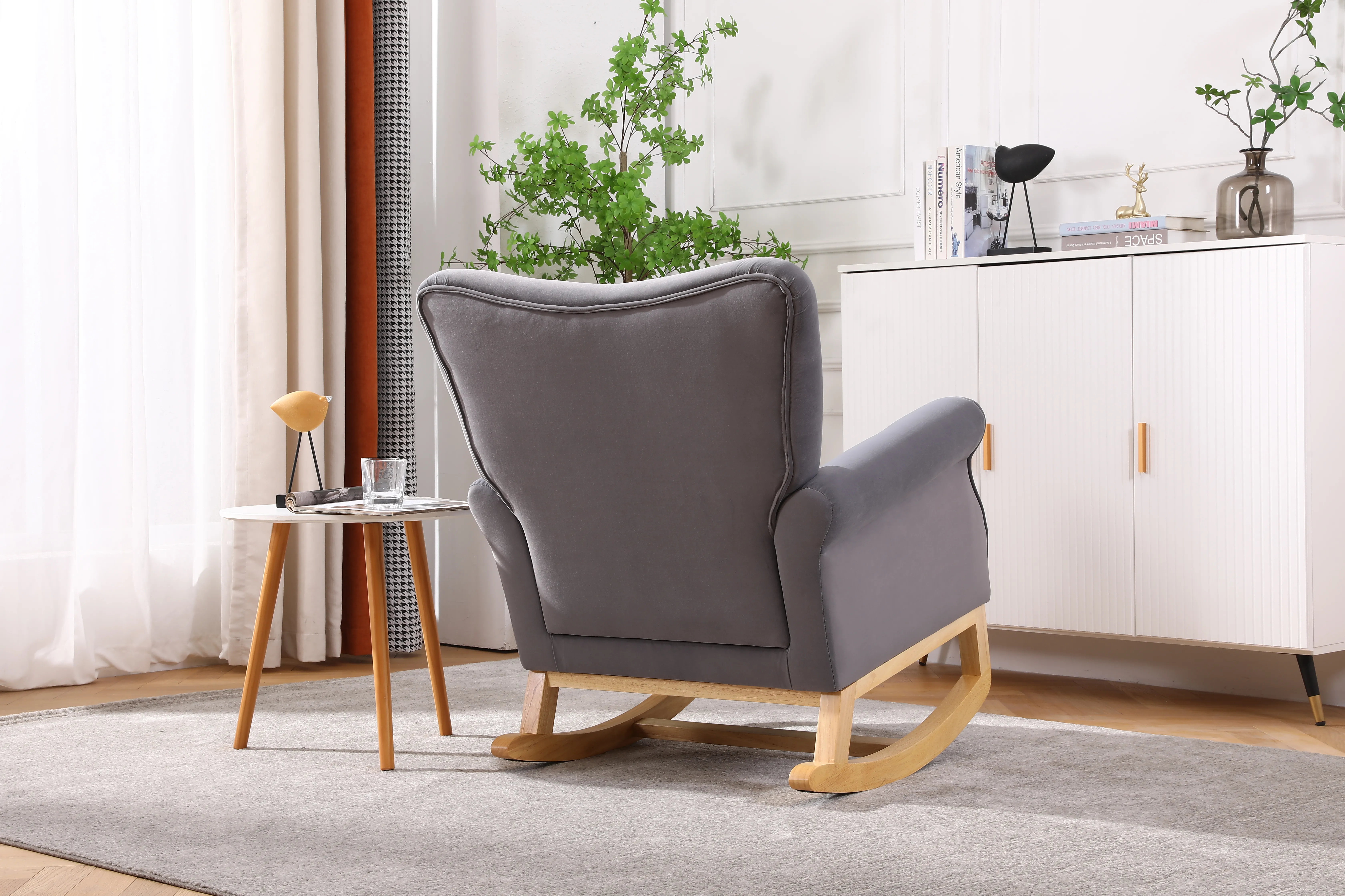 Versatile Usage: Perfect for rocking baby to sleep or creating a cozy reading corner. Elegant Design: Curved legs with warm wood finish complement various decor styles. Comfortable Seating: Foam-filled fabric upholstery ensures a comfortable seating experience. Weight Capacity: Supports up to 250 lbs after assembly for reliability and safety. Easy Installation: Can be assembled within 10 minutes with detailed instructions and included hardware.