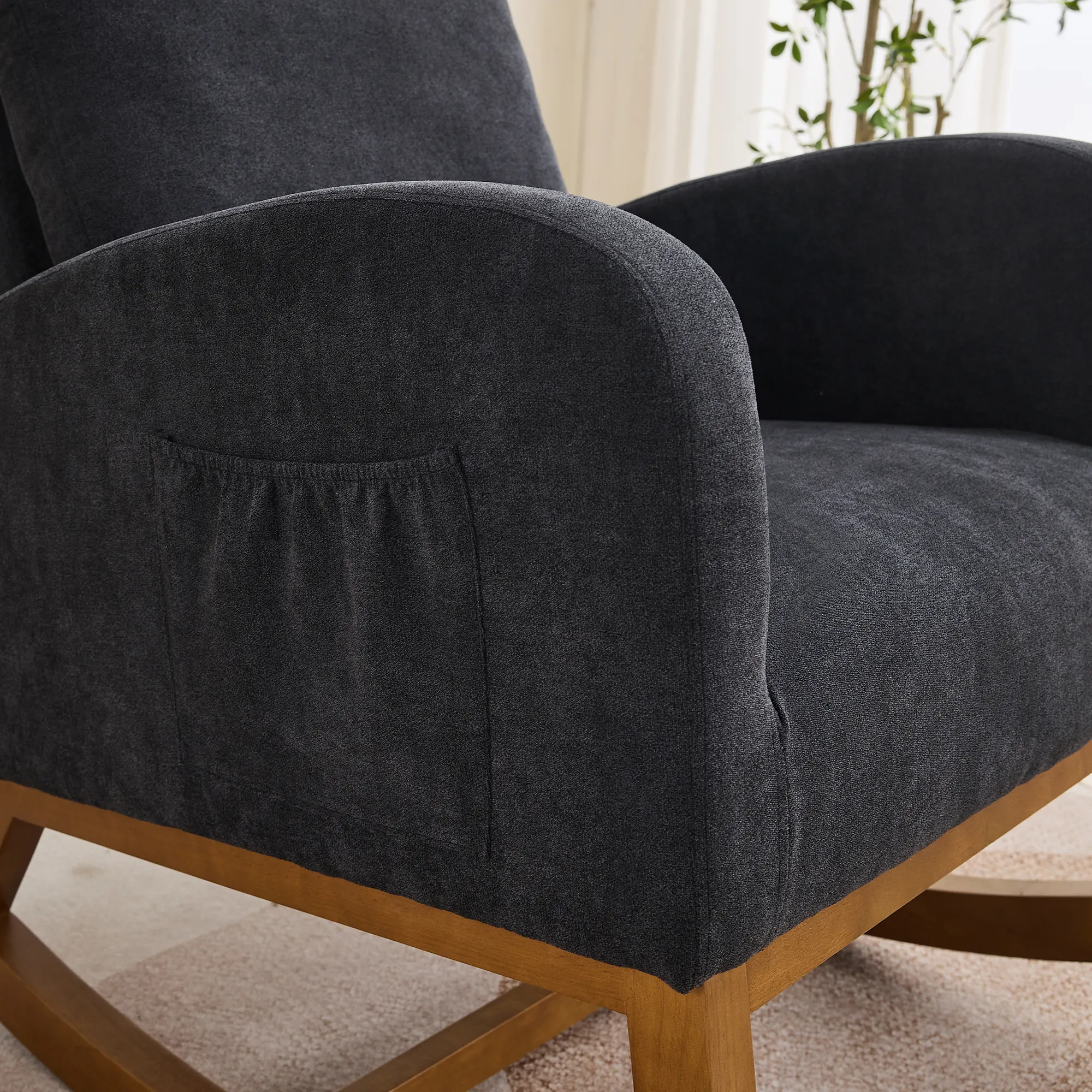 Fabulous Comfort: Covered with high-quality polyester for a soft and breathable surface, the rocking chair offers luxurious yet casual seating. The refined curved wing back ensures a comfortable sitting position for leisurely relaxation. Gentle Rocking: The excellent curved legs allow for gentle and smooth rocking, making it the perfect centerpiece for nurseries and leisure areas. Enjoy a soothing rocking experience. Side Pockets: Convenient side pockets provide storage for items like books and remote controls, adding practicality to the rocking chair for easy access to essentials. Sturdy and Stable: Crafted with a sturdy plywood frame and rubber wood legs, this rocking chair is super strong and durable. An additional fixed wooden crossbar enhances stability, supporting a maximum capacity of 250LBS. Easy to Install: With simple assembly required on the backrest and feet, this chair can be easily set up by an adult in just 10 minutes. Save time and enjoy your new rocking chair hassle-free.