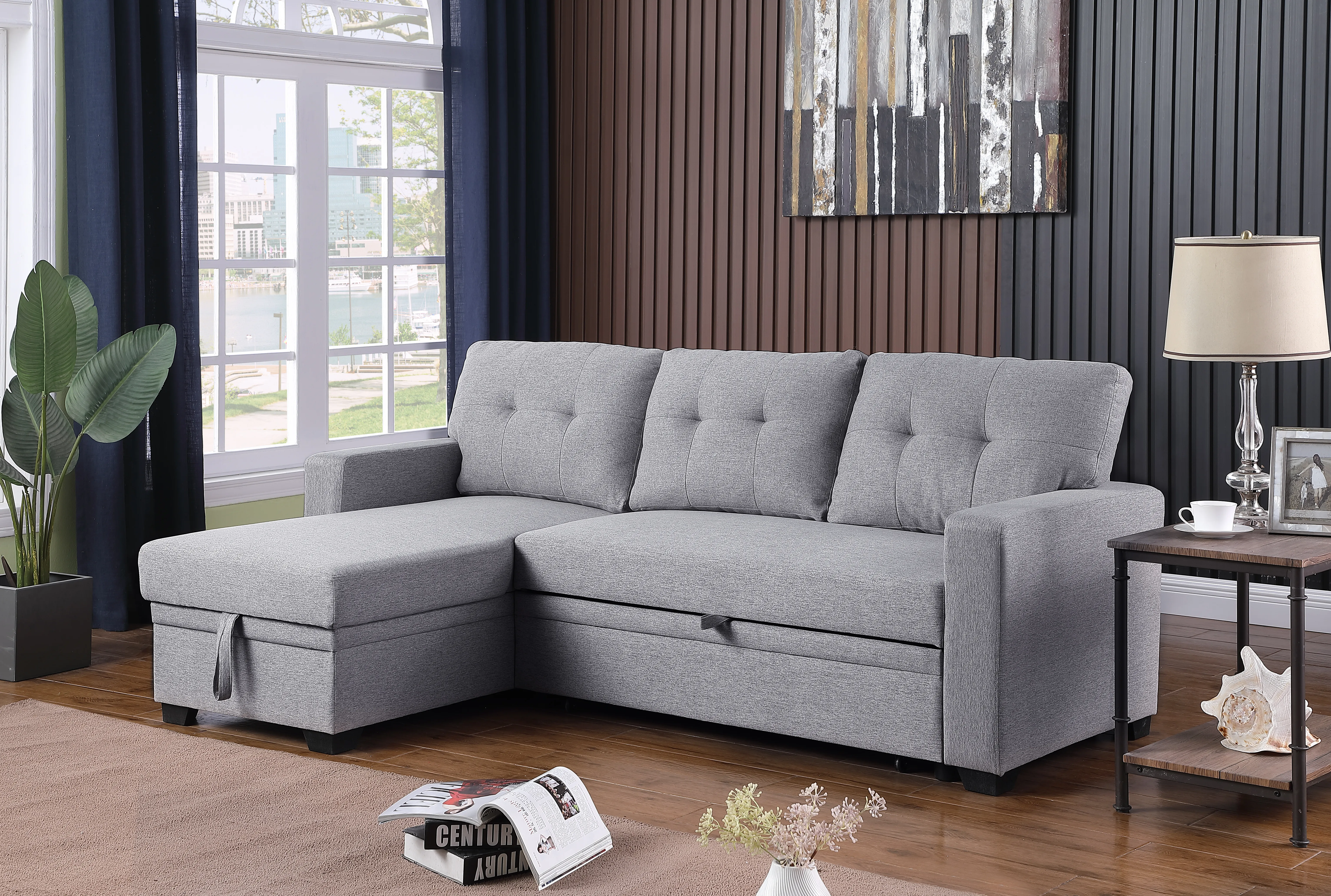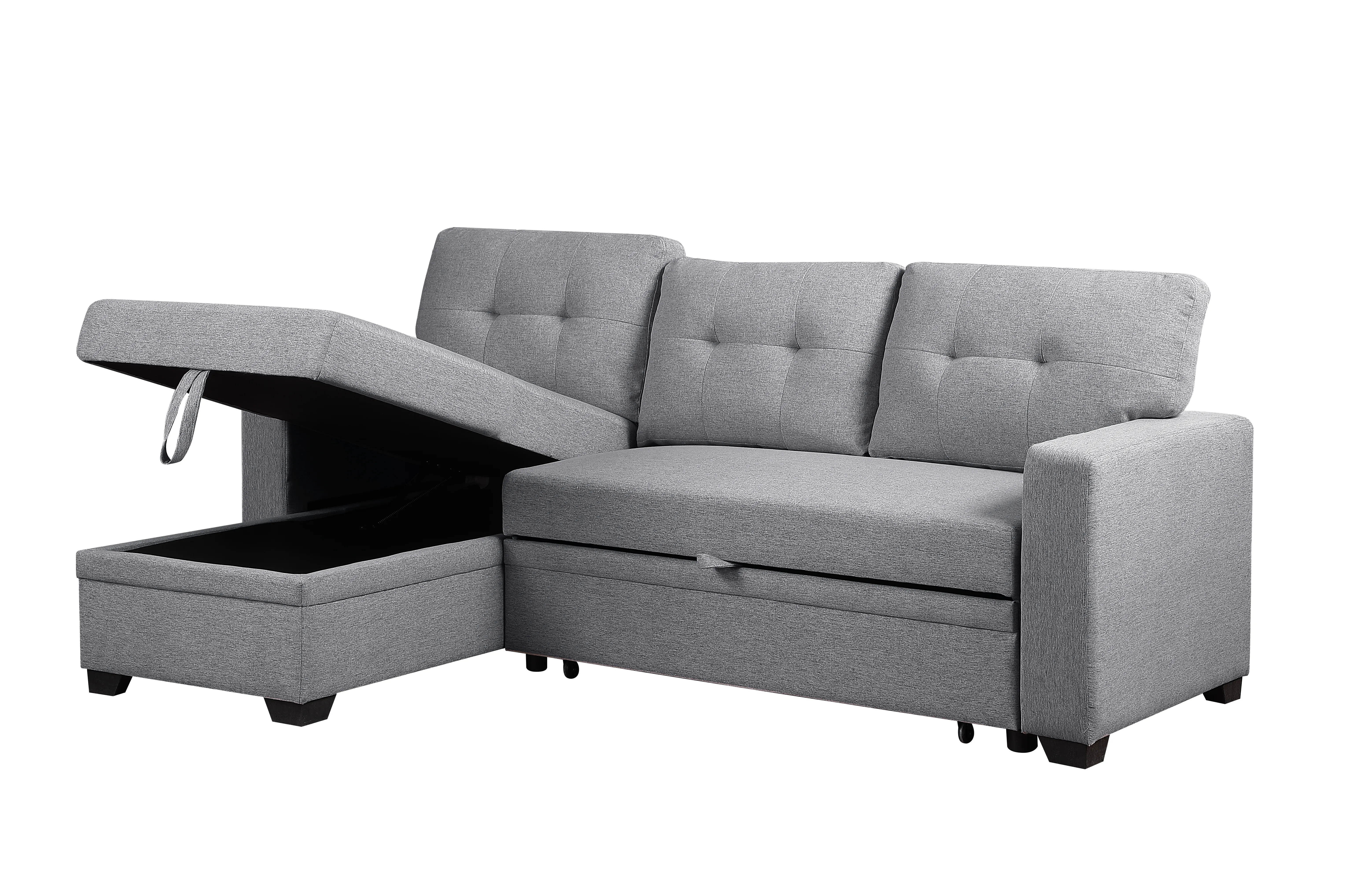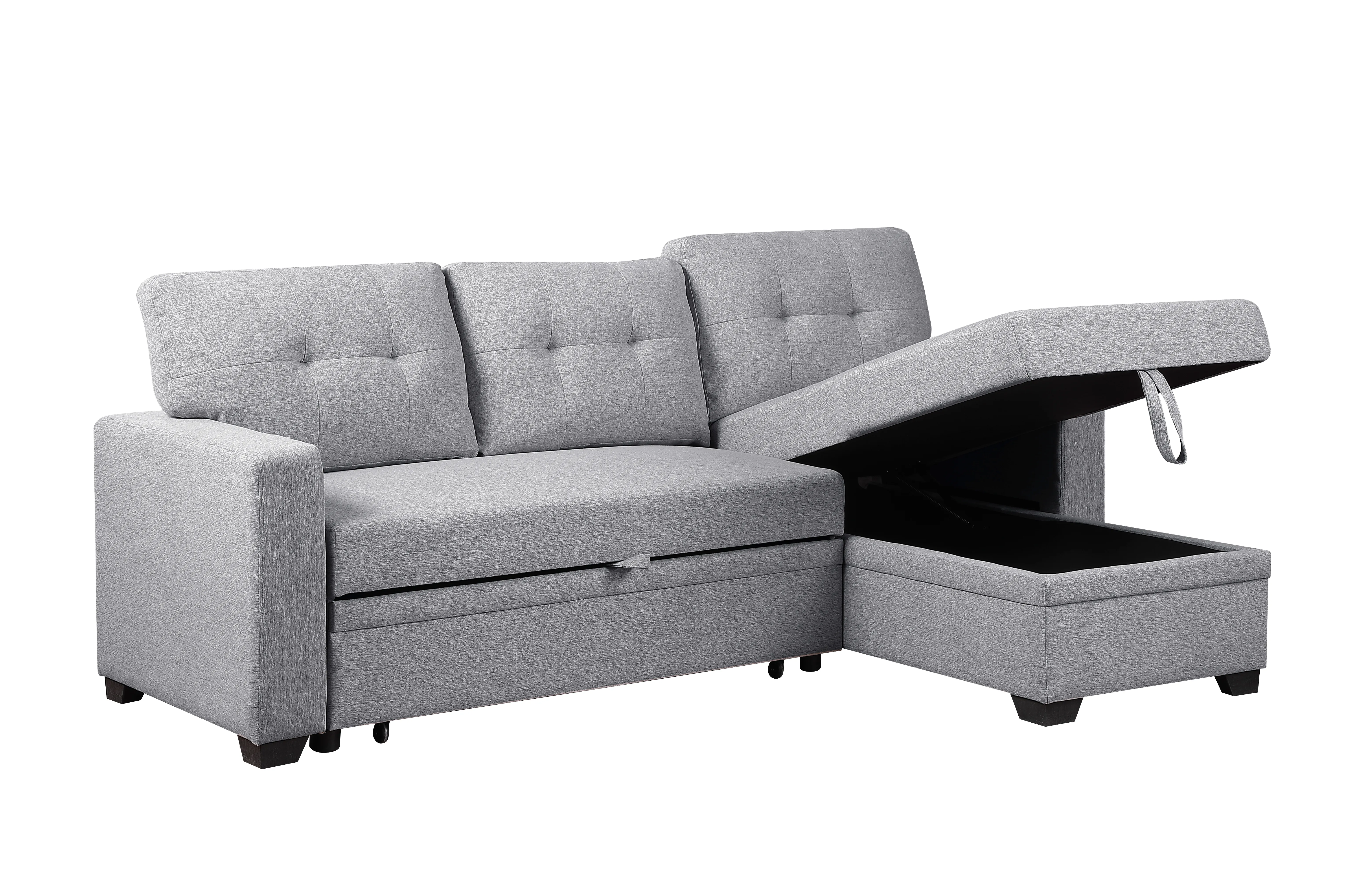 This multifunctional sectional sofa sleeper, with ample storage and the ability to host three as a sleeper sofa, is an excellent choice for any living space. The versatile functionality of this sofa shines through with a storage chaise and pull-out loveseat, seamlessly converting into a twin-size sleeper to accommodate extra sleeping space. Embrace storage convenience with a chaise and removable back cushions, providing practical solutions for an organized living space. Perfect for hosting guests, the pull-out sleeper sofa ensures a comfortable and welcoming environment, while square track armrests contribute to the overall stylish simplicity of your living room decor.