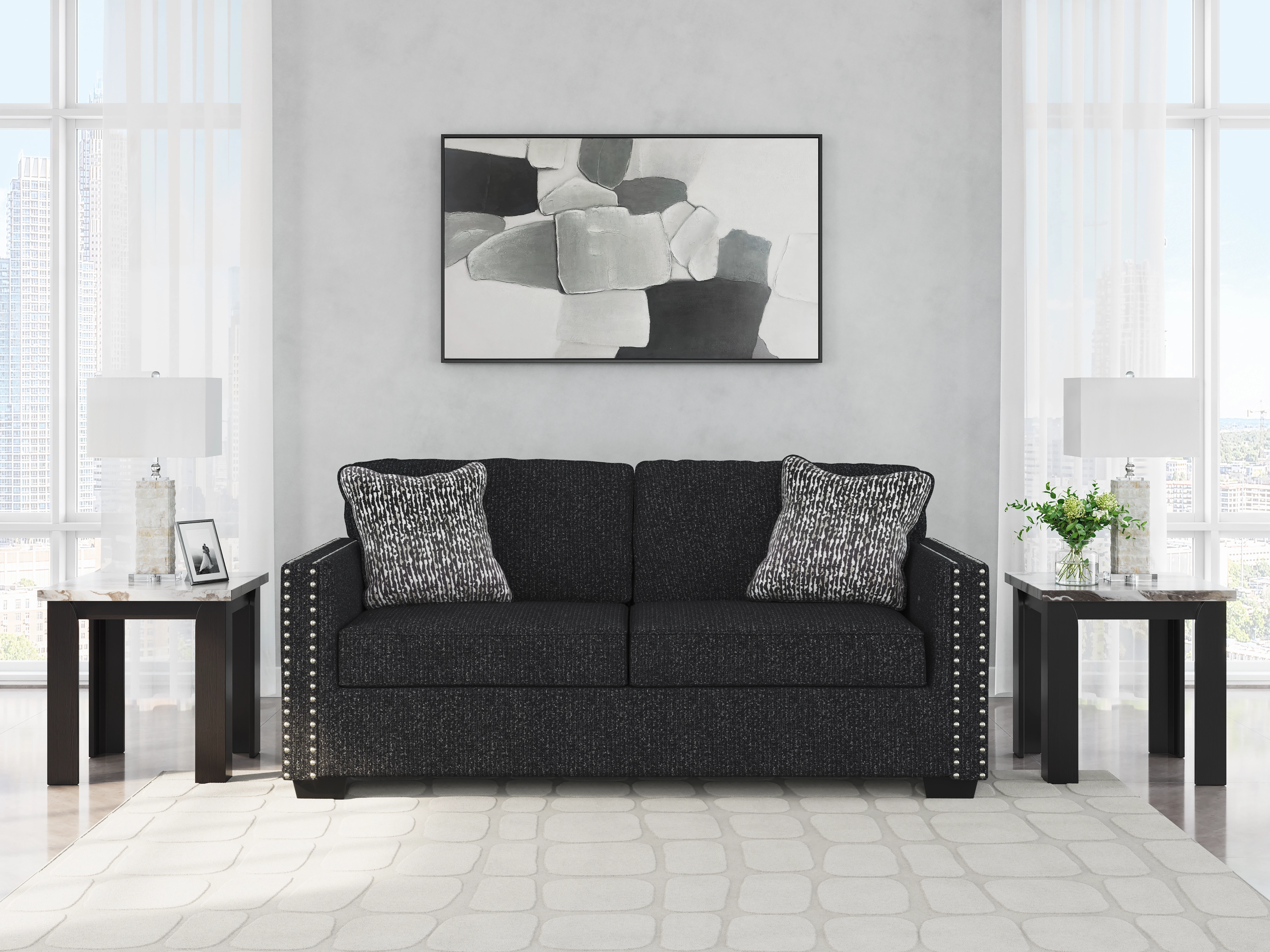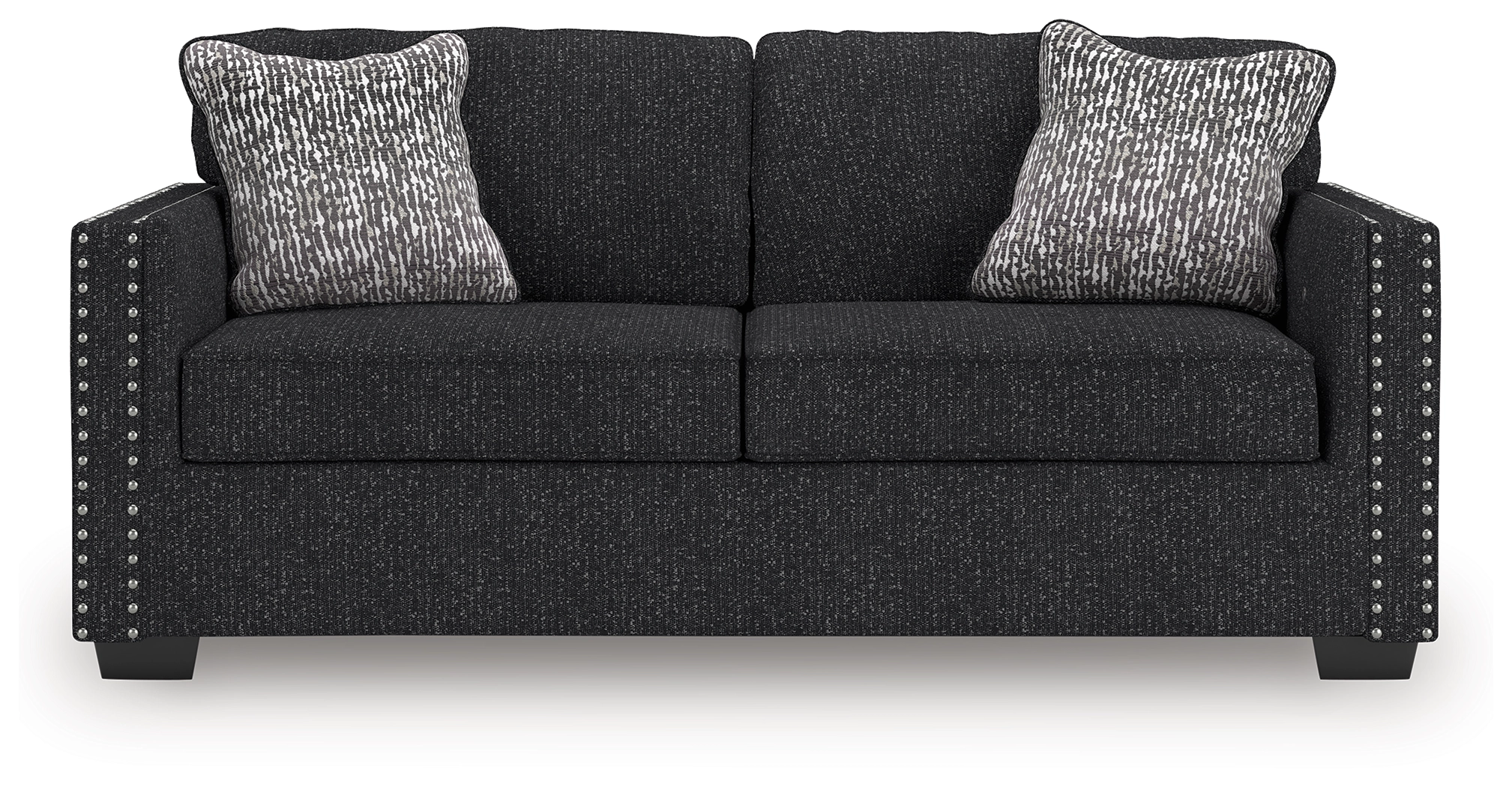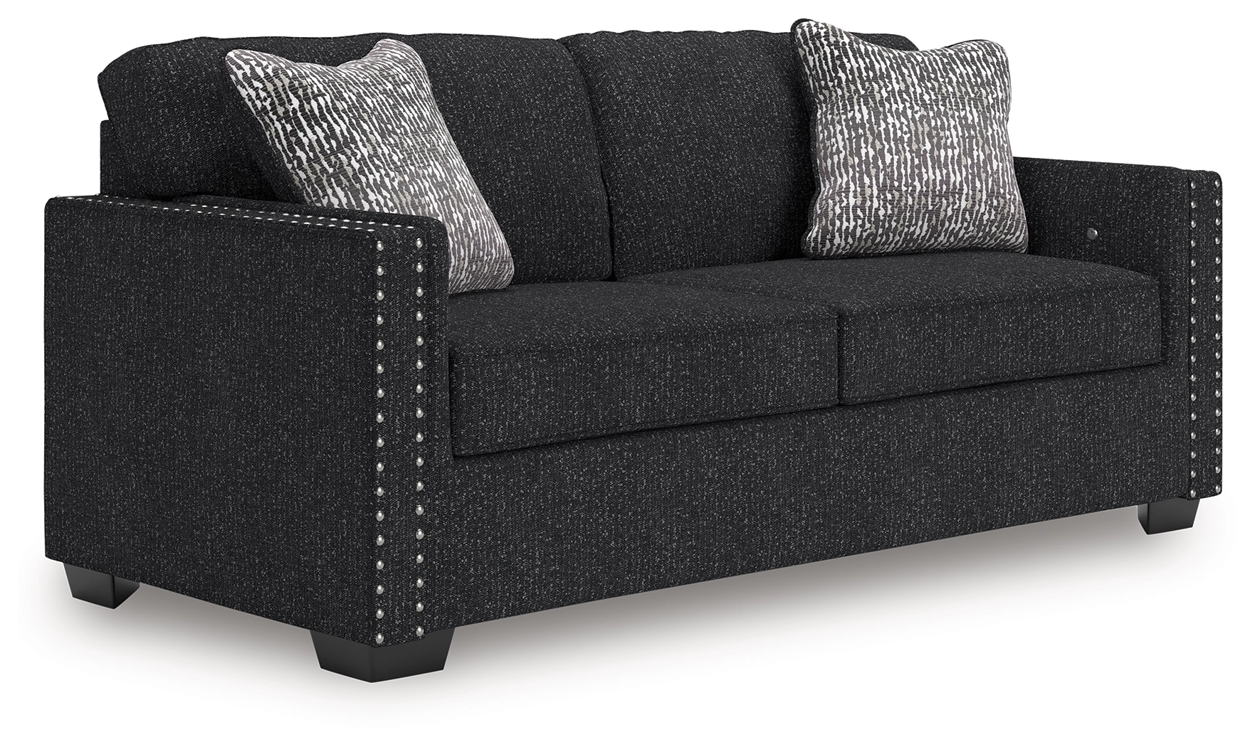 This stunning sofa leaves a lasting impression. Its cozy cushions, chic coal-colored upholstery and striking nailhead trim are a perfect blend of comfort and contemporary design. And here’s the showstopper—ambient red, white and blue LED lighting along the sofa's base. The look is simply wow.