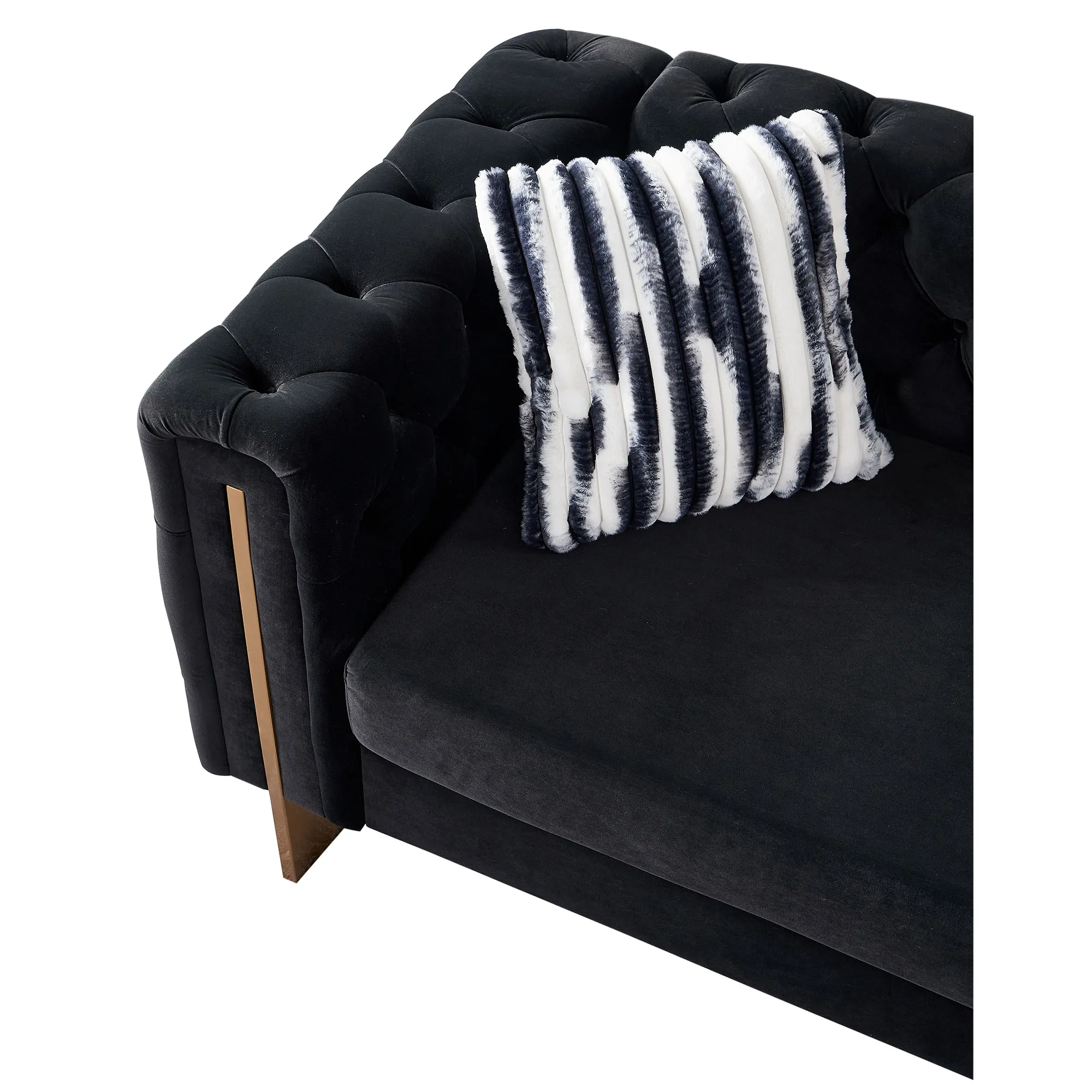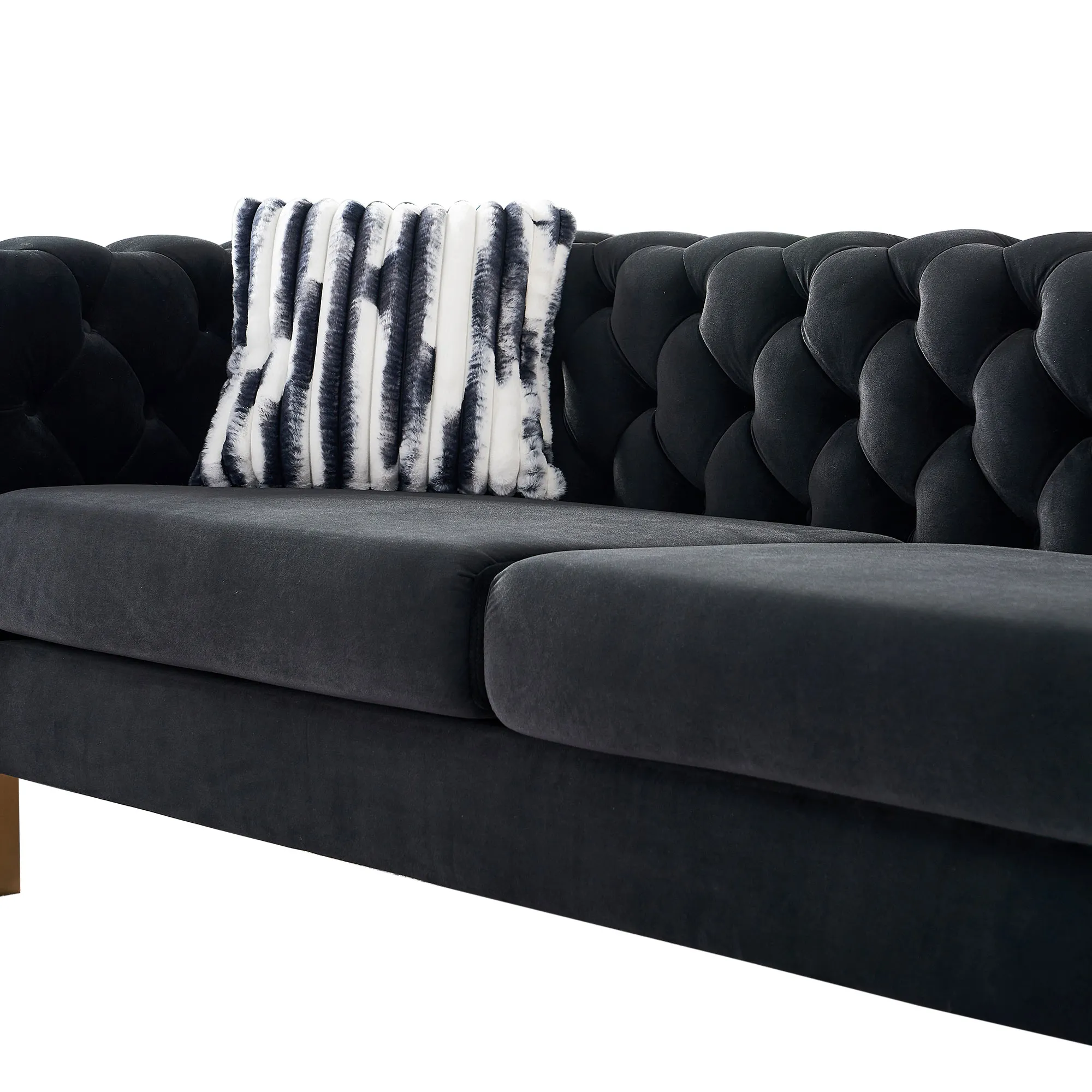 Luxurious velvet couch with button tufting: Features velvet button tufting along the back and sides for a luxurious touch. Sturdy construction with gold metal legs: Built with high-quality multi-density foam and solid wood frame, supported by striking gold metal legs. Easy assembly and maintenance: Includes tools and instructions for quick assembly, removable cushions, and durable upholstery for easy cleaning. 700-pound weight capacity: Can handle up to 700 pounds, offering durability and strength. Includes 2 toss pillows: Comes with 2pcs Toss Pillows to enhance comfort and style.