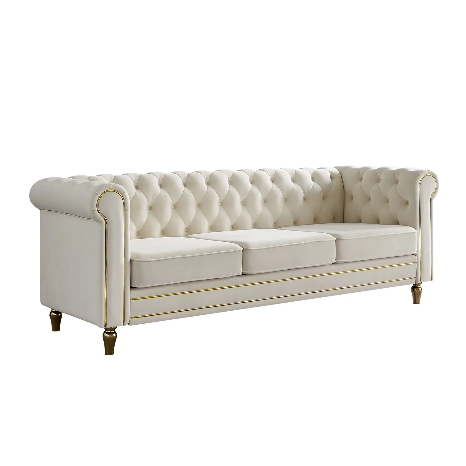 Soft and Skin-Friendly Fabric: Upholstered with smooth, breathable fabric that is gentle on the skin and easy to maintain with a dry towel. Maximum Comfort: High-density sponge seat cushions provide a comfortable seating experience, with eco-friendly foam that takes 3-4 days to fully spring back. Classic Glam Style: This Chesterfield sofa features gold strip trim and deep button tufting, adding a touch of classic glam to your living room decor. Durable Construction: Made with a solid wood frame, strong metal legs, pine wood frame, elastic webbing, and sinuous springs for a sturdy structure that can support up to 750 pounds.