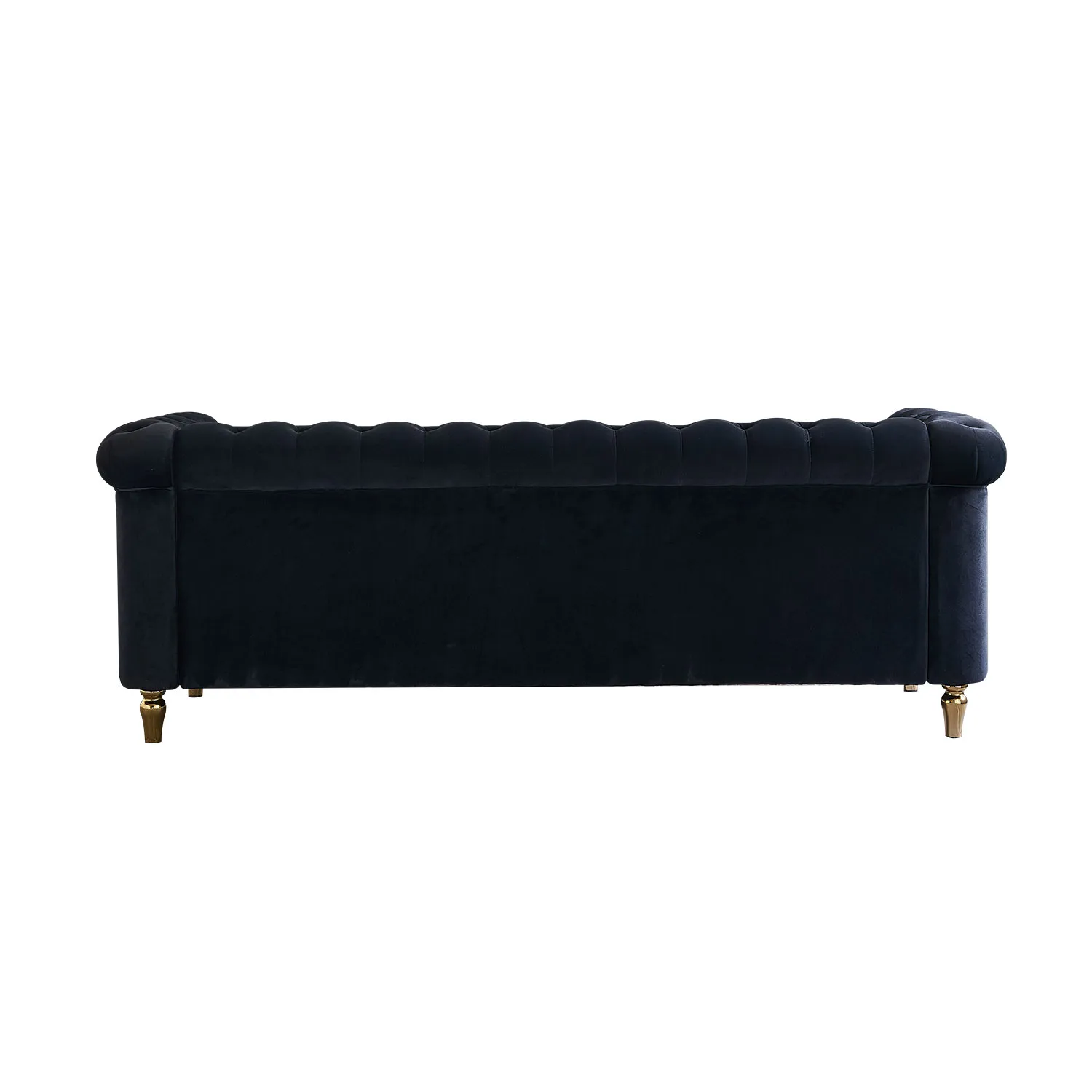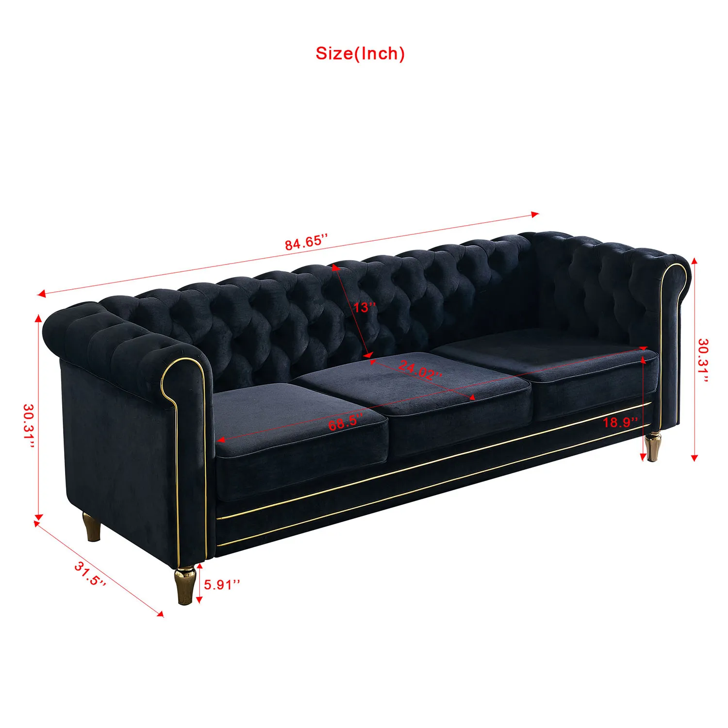 Soft and Skin-Friendly Fabric: Upholstered with smooth, breathable fabric that is gentle on the skin and easy to maintain with a dry towel. Maximum Comfort: High-density sponge seat cushions provide a comfortable seating experience, with eco-friendly foam that takes 3-4 days to fully spring back. Classic Glam Style: This Chesterfield sofa features gold strip trim and deep button tufting, adding a touch of classic glam to your living room decor. Durable Construction: Made with a solid wood frame, strong metal legs, pine wood frame, elastic webbing, and sinuous springs for a sturdy structure that can support up to 750 pounds.