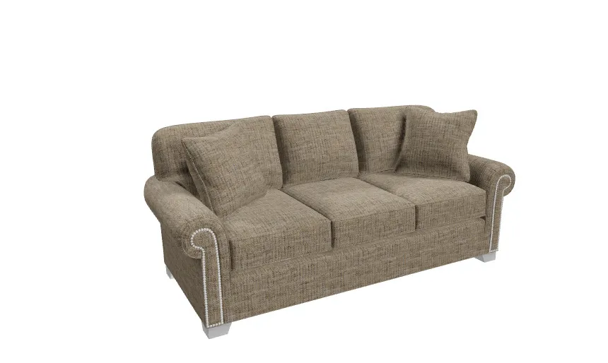 Casual sophistication comes to life in this updated classic sofa. Dark brass nail heads trim the arm panels and accent the pleated rolled arms- set at the perfect height for a good nap! Three seat cushions and three attached backs provide a plush, comfortable place to relax. Tapered block legs offer a modern touch to this simple, but refined look. Also available are the matching sleeper, loveseat, chair and ottoman. Optional nail finishes available. Available without nail head trim as style 7566.