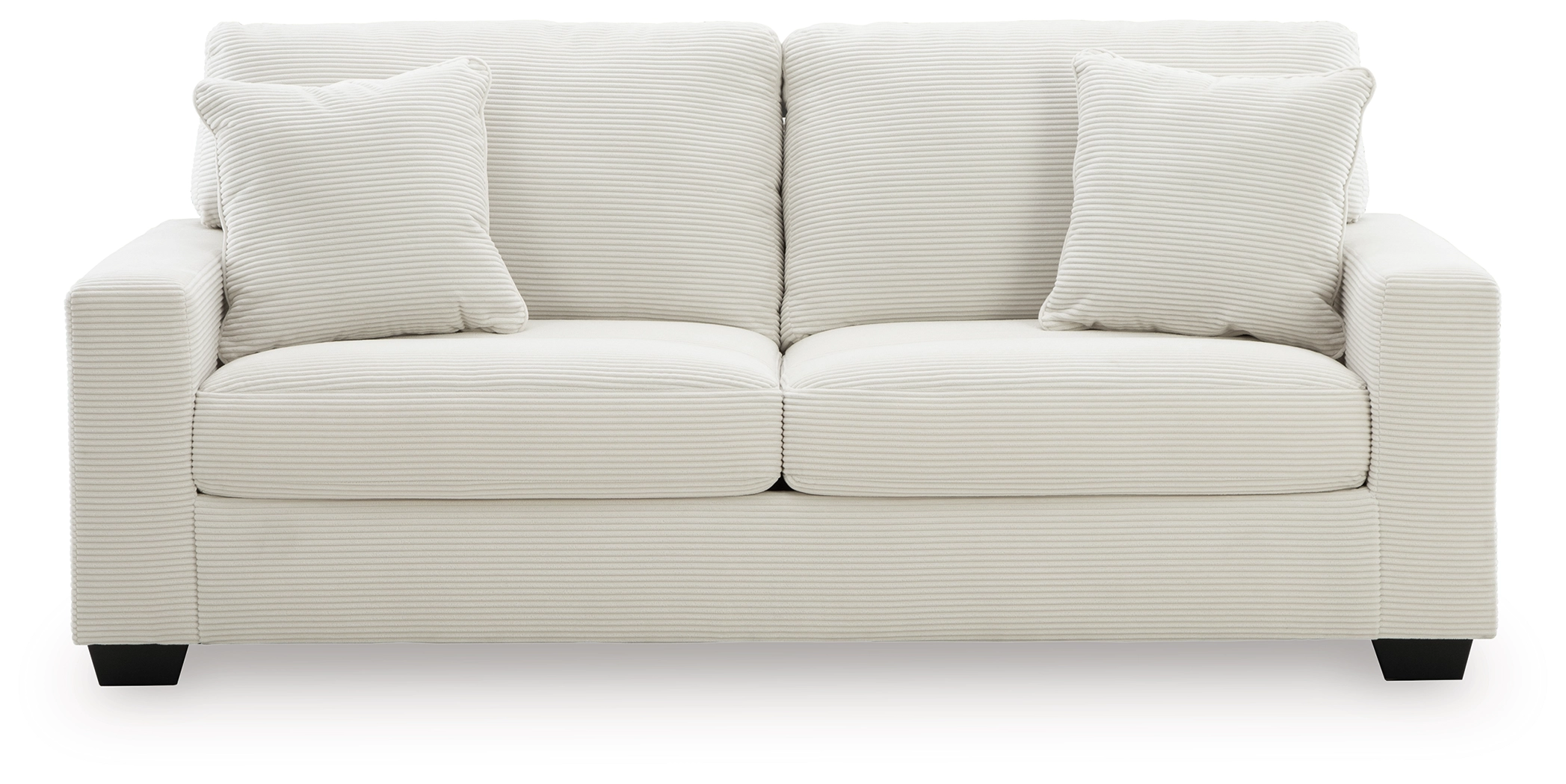 The crisp neutral hue and striking design details of this sofa create a living room that expertly reflects your contemporary taste. For irresistibly cool textural appeal, the ultra-soft fabric is enhanced by a small-scale corded look. With a clean-lined silhouette complete with track arms, this sofa allows you to take a trend-right approach to everyday living.